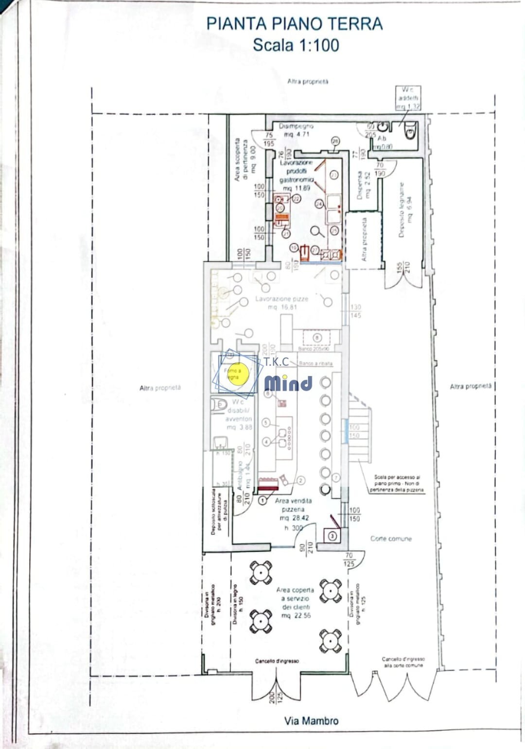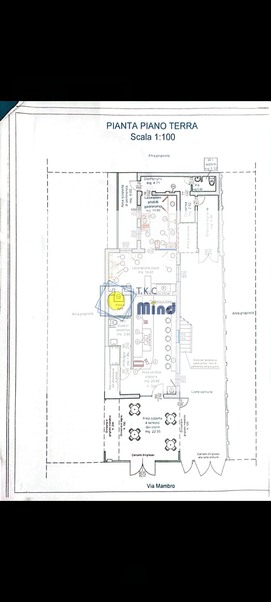 La pizzeria dispone di una distesa esterna condominiale coperta di 22 mq, dove si possono accomodare 16 persone in un'atmosfera rilassata e piacevole. All'interno, la sala ha una superficie di 28 mq e offre 20 posti a sedere, con un arredamento sobrio e curato. La zona per le lavorazioni di pizze è ampia e ben attrezzata, occupa circa 17 mq e comunica con una cucina di 12 mq. Il locale dispone inoltre di una zona di pertinenza di 9 mq, di un deposito di 7 mq e di due bagni, uno per i clienti e uno per il personale.