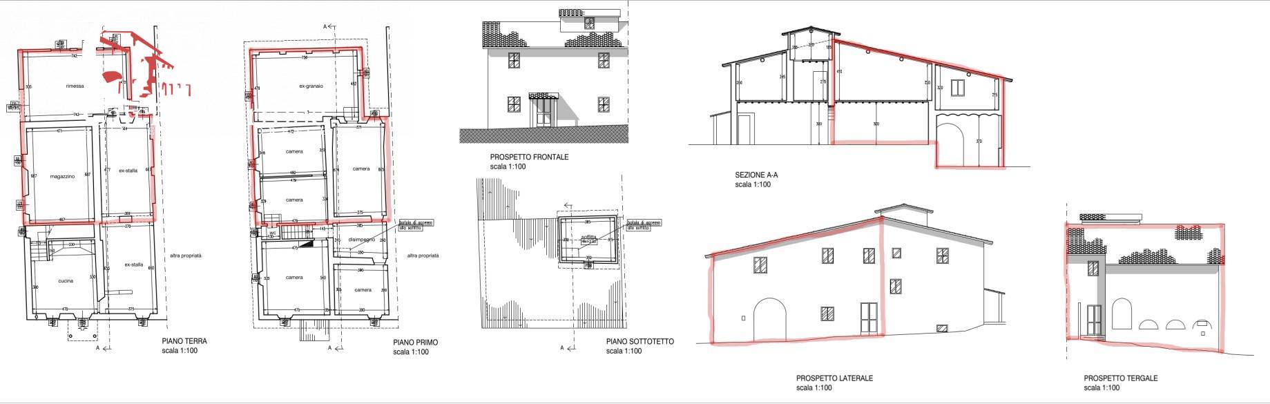 Al piano terra ci sono la cucina abitabile e altri 4 vani. Al primo piano troviamo 2 camere matrimoniali, altre 3 camere, un grande vano, oltre soffitta.