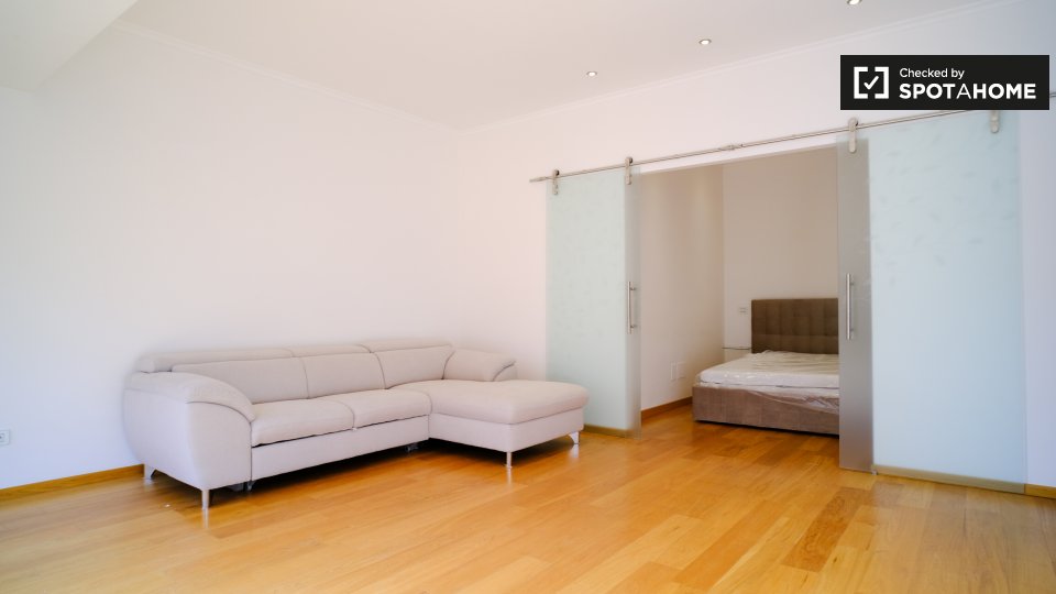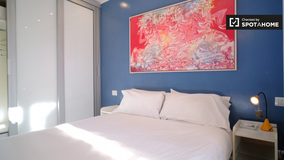 Un elegante appartamento con 1 camera da letto con balcone è a disposizione vicino al centro di Roma a Porta Pia. Nella camera da letto troverete un letto matrimoniale, un piccolo tavolo, una TV, l'accesso al balcone e la cucina. Ma non è tutto questo! Cerca, e troverai un secondo letto matrimoniale a mezzanino. L'area cucina moderna è completamente attrezzata, con una stufa a 4 fuochi e un forno a microonde. Attraverso la sala troverete un'area soggiorno che ha un grande tavolo da pranzo e un sacco di spazio. Sopra il soggiorno c'è un altro soppalco con un letto matrimoniale. Il bagno è pulito e ha una bella piastrellatura nella doccia e una lavatrice.