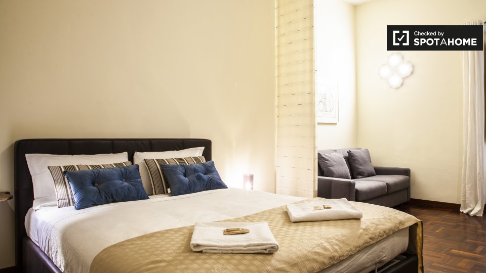 Questo monolocale in affitto a Centro Storico è di 35 m² e dispone di un balcone, di una cucina attrezzata e di un bagno. Questo appartamento dispone di un elegante letto matrimoniale, uno spazio ufficio e aria condizionata, ideale per l'estate.