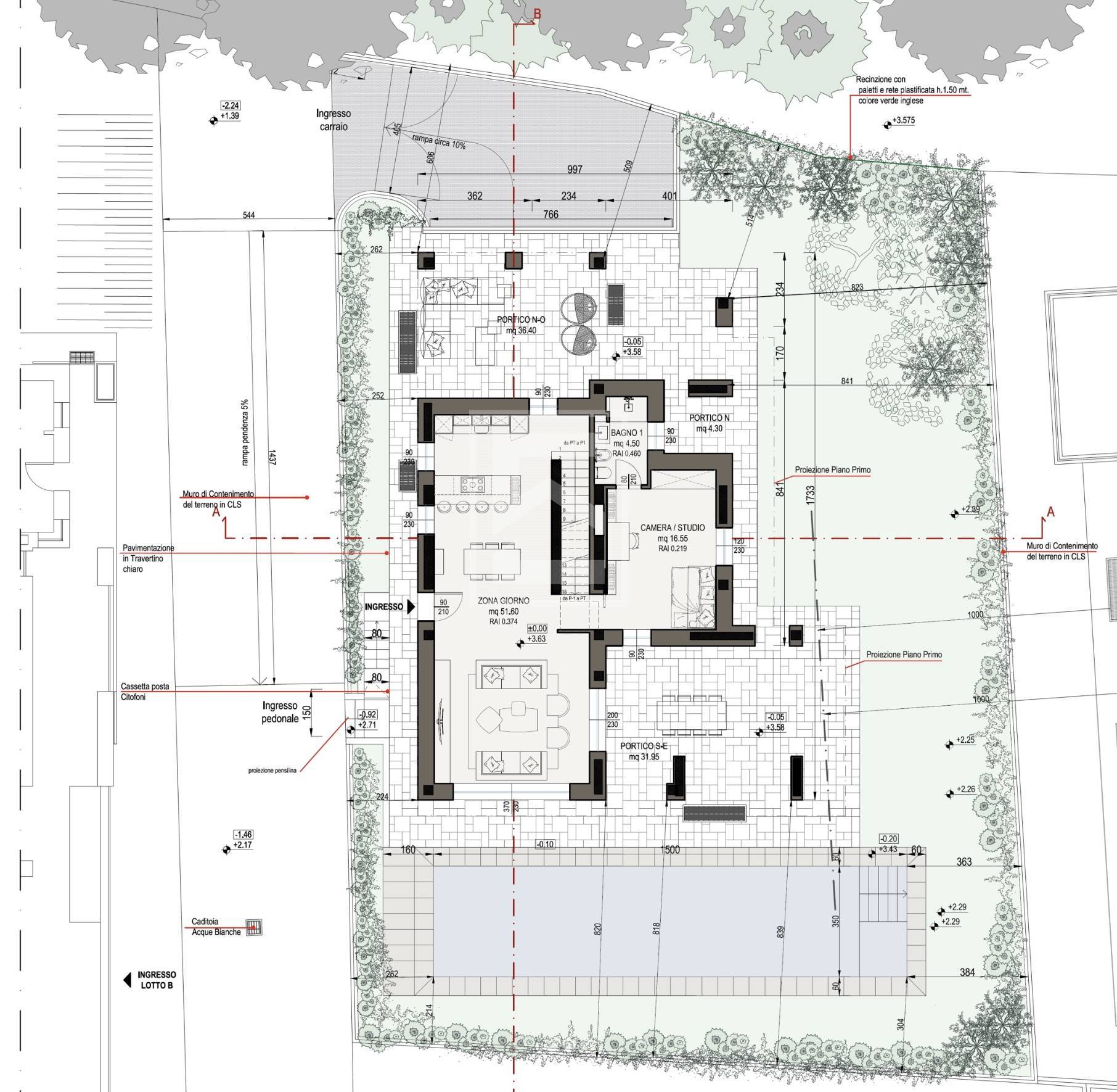 - piano terra: zona living con sala da pranzo, soggiorno e cucina open space, disimpegno, bagno di servizio e camera da letto/studio, porticati, giardino