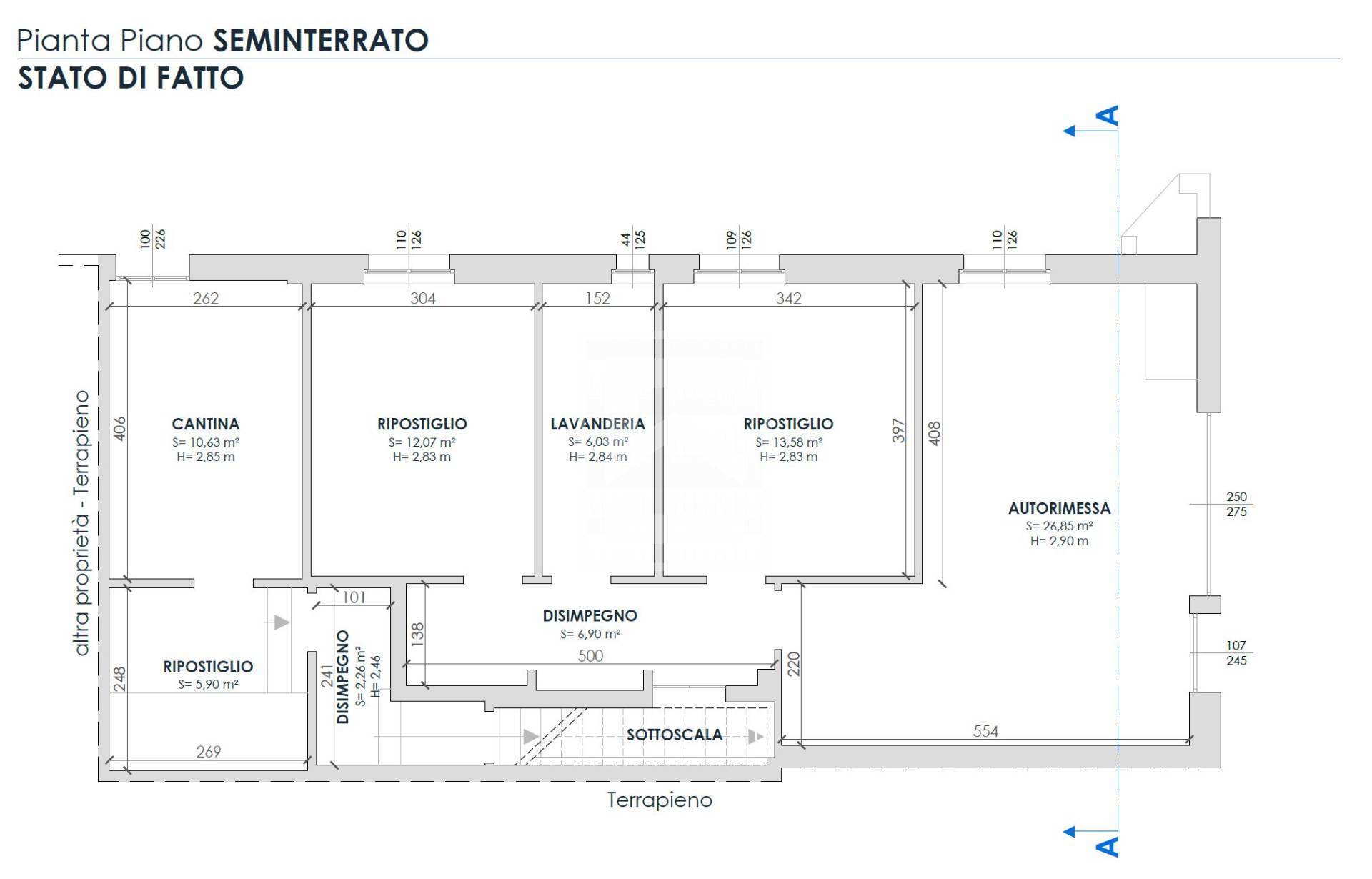 Al piano interrato, di circa 75 mq, troviamo 2 stanze, un bagno finestrato con vasca, cantina e garage di circa 33mq.