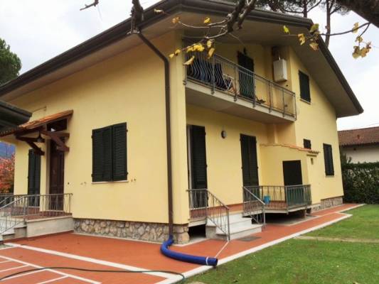 MARINA DI MASSA a circa 1km dal mare ,villa di 180 mq disposta su 3 livelli così suddivisa:p.seminterr.con taverna e grande angolo cottura,sala con camino,stanza lavanderia,cantina e scale che accedono direttamente all'esterno;p.terra con sala,cucina abitabile,bagno,terrazze perimetrali e veranda di 25 mq;p1 2 ampie camere matrimoniali e bagno grande con vasca ;grande giardino\ncon impianto di irrigazione automatico,barbecue in muratura con forno;depandance di 30 mq con bagno,pavimenti e rivestimenti in marmo pregiato,serramenti in legno,finiture eleganti e di alto pregio.Possibilità di avere la villa arredata