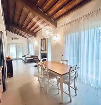 Il piano terra dell'edificio principale ospita, in ampi ed eleganti saloni, la zona giorno dell’appartamento padronale: soggiorno con grande camino in pietra e cucina abitabile (aperti sul giardino), sala pranzo, sala biliardo, studio, bagno di servizio (al mezzanino).