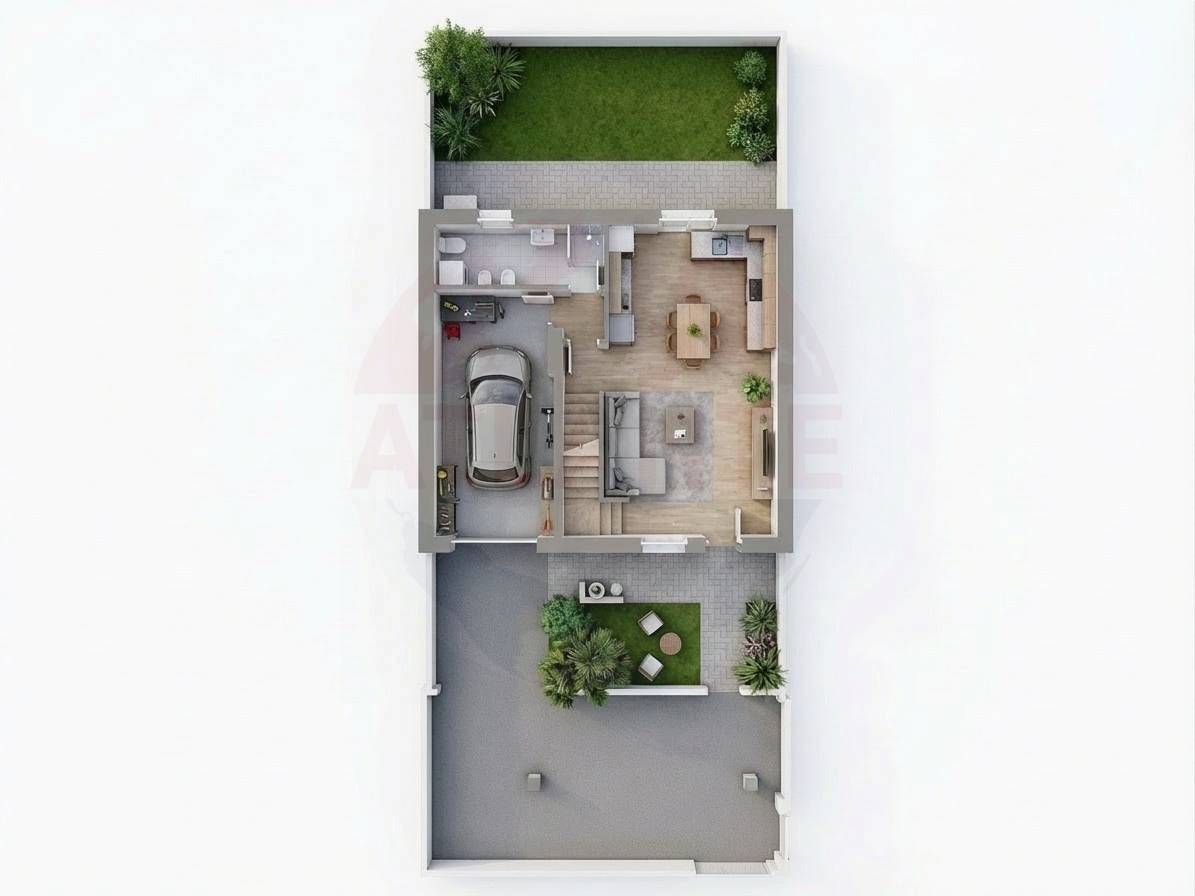Lingresso avviene attraverso il giardino privato frontale, che conduce allampia zona giorno composta da soggiorno e area pranzo con cucina open-space, un ambiente moderno e conviviale caratterizzato da grandi aperture verso il verde.