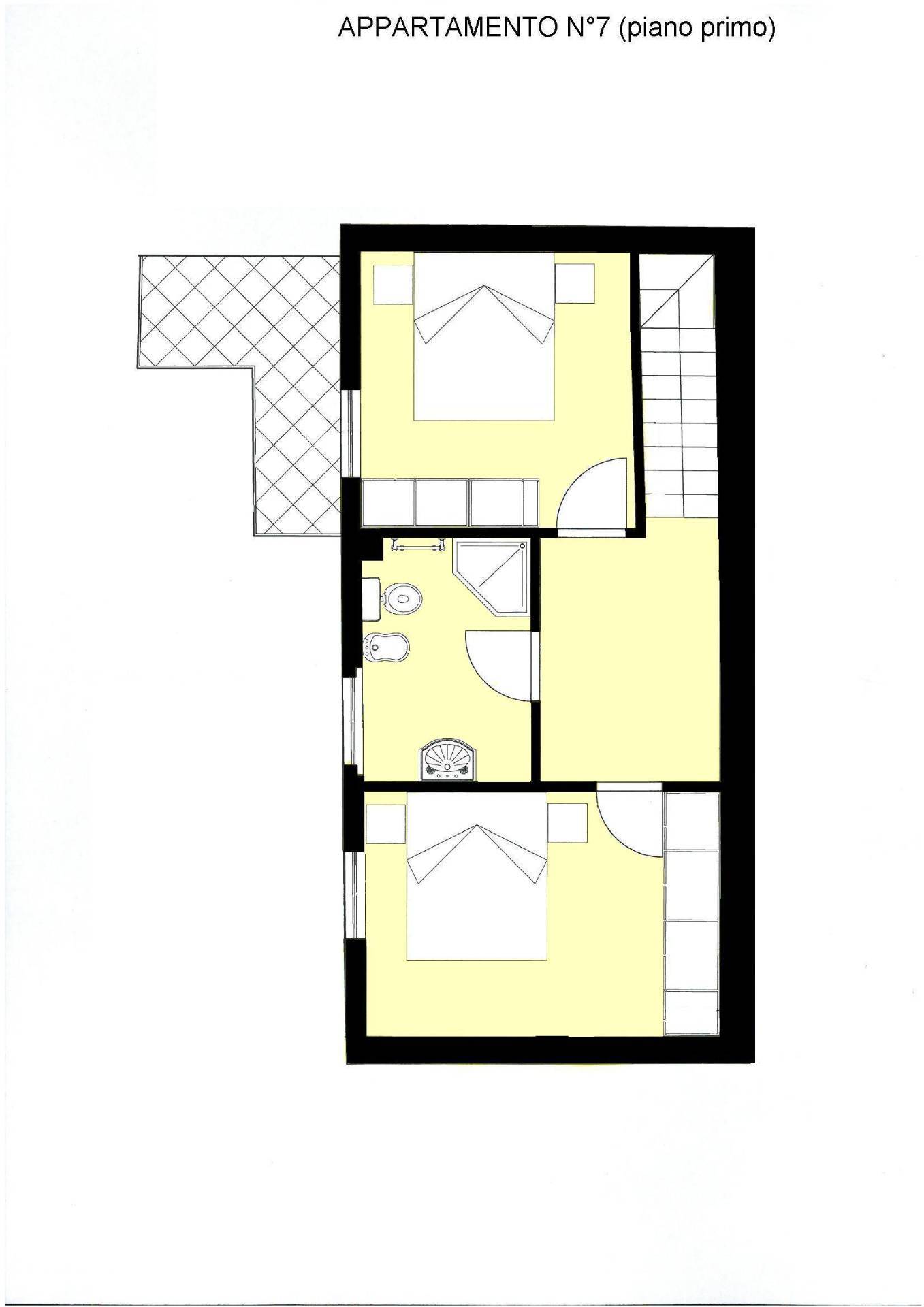Il piano primo è interamente dedicato alla zona notte, composta da due camere matrimoniali ampie e ben proporzionate, concepite come spazi di assoluto comfort e privacy. Un bagno raffinato e un terrazzo riservato completano il piano, offrendo luminosità naturale e un ulteriore affaccio esterno di grande piacevolezza.