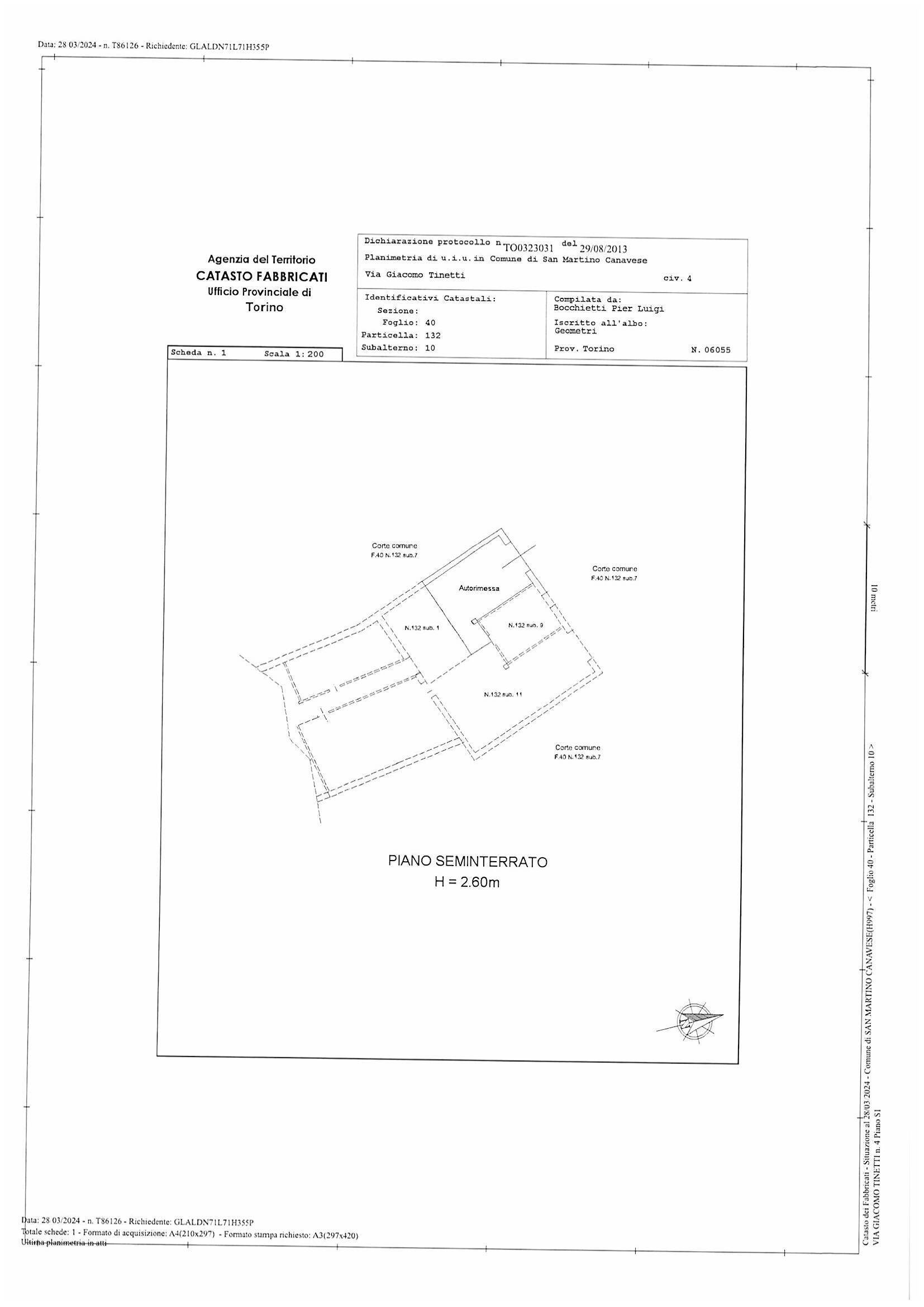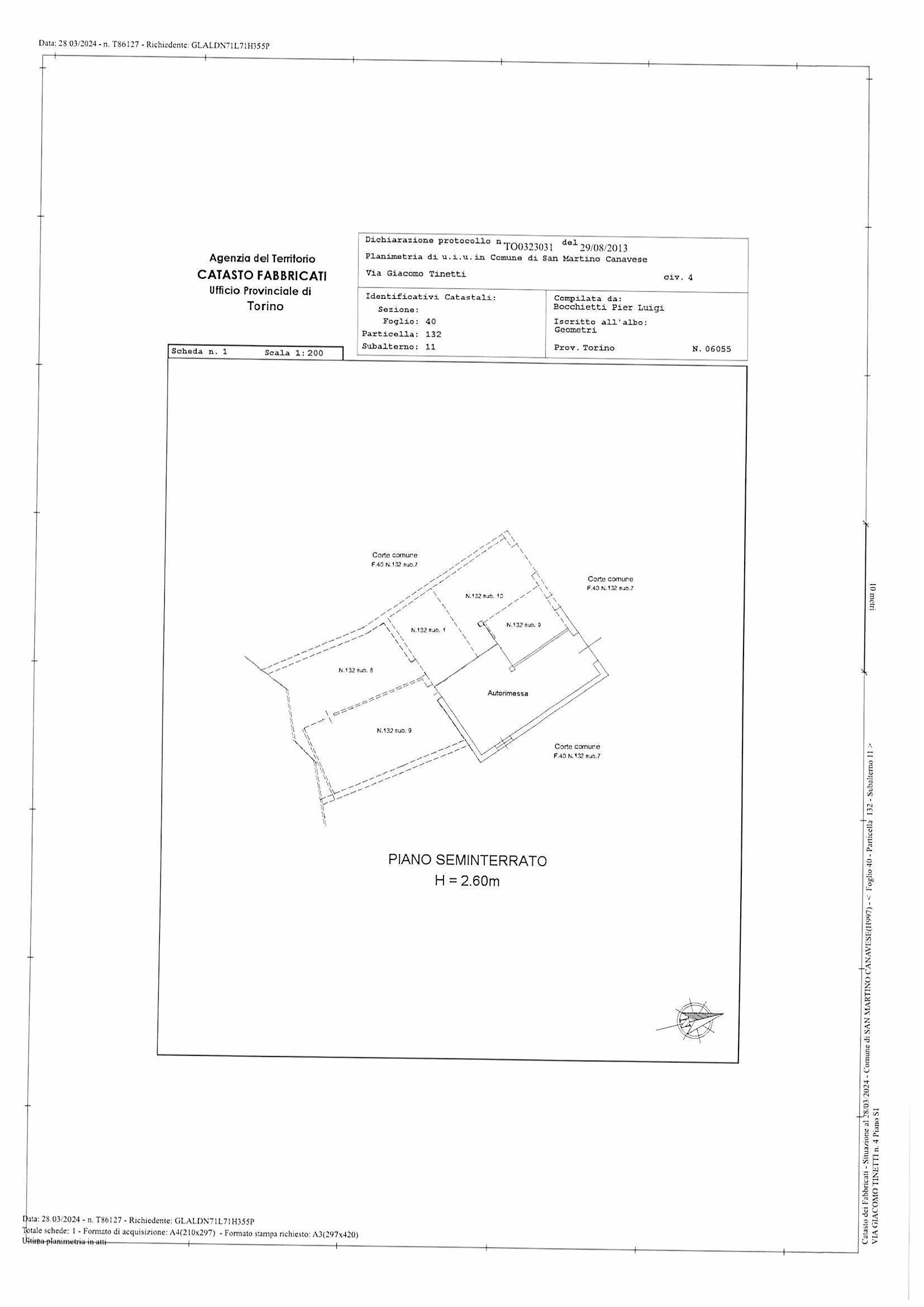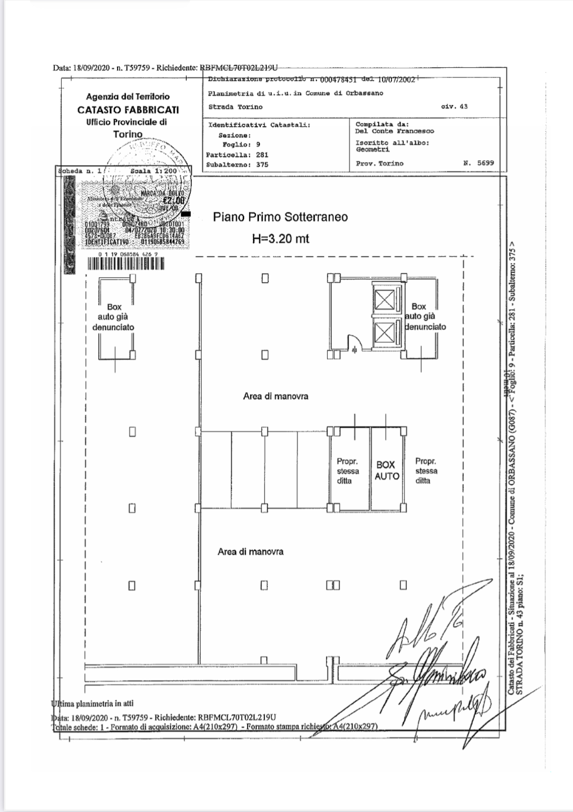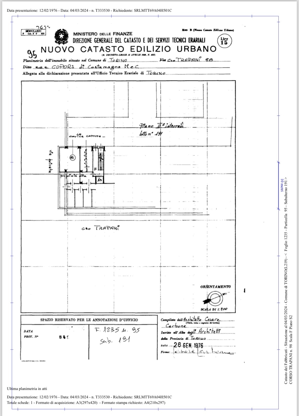 In corso Trapani 98 proponiamo Box Auto coperto al secondo piano interrato di 25,60 mq. Uscita pedonale con ascensore.Larghezza ingresso 2,17 metri. Altezza 2,6 m ; Larghezza interna 4,6 m ; Lunghezza 5 metri.