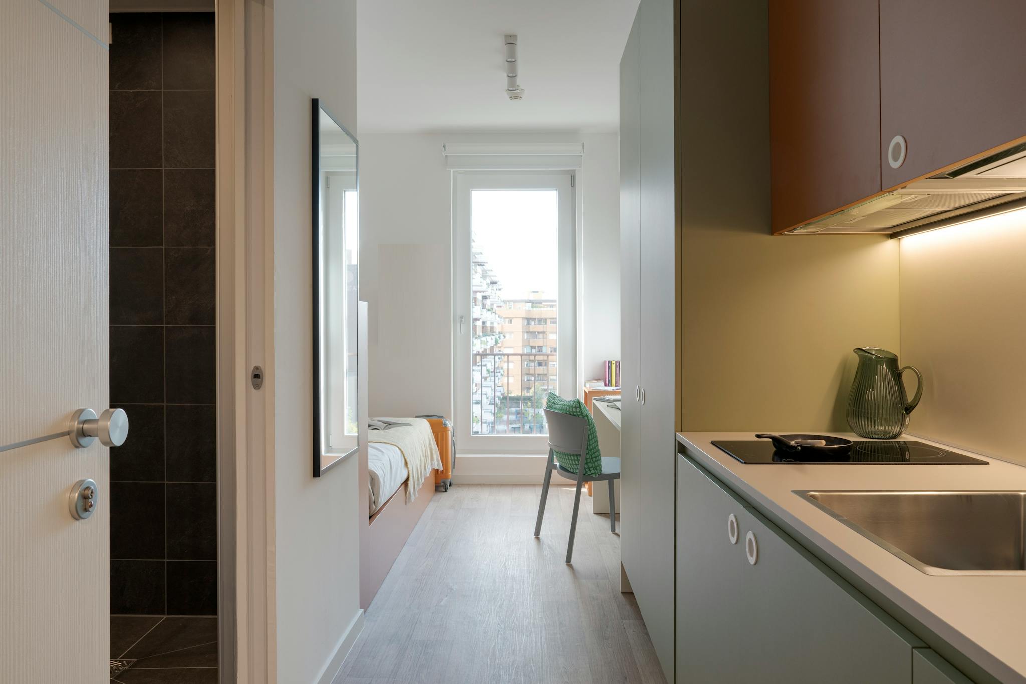 Bright and spacious single room with air conditioning and private veranda, in a quiet residential building in Milan. The room is fully furnished with a double bed, large wardrobe with drawers, desk, bedside table and shoe cabinet. The private v...
