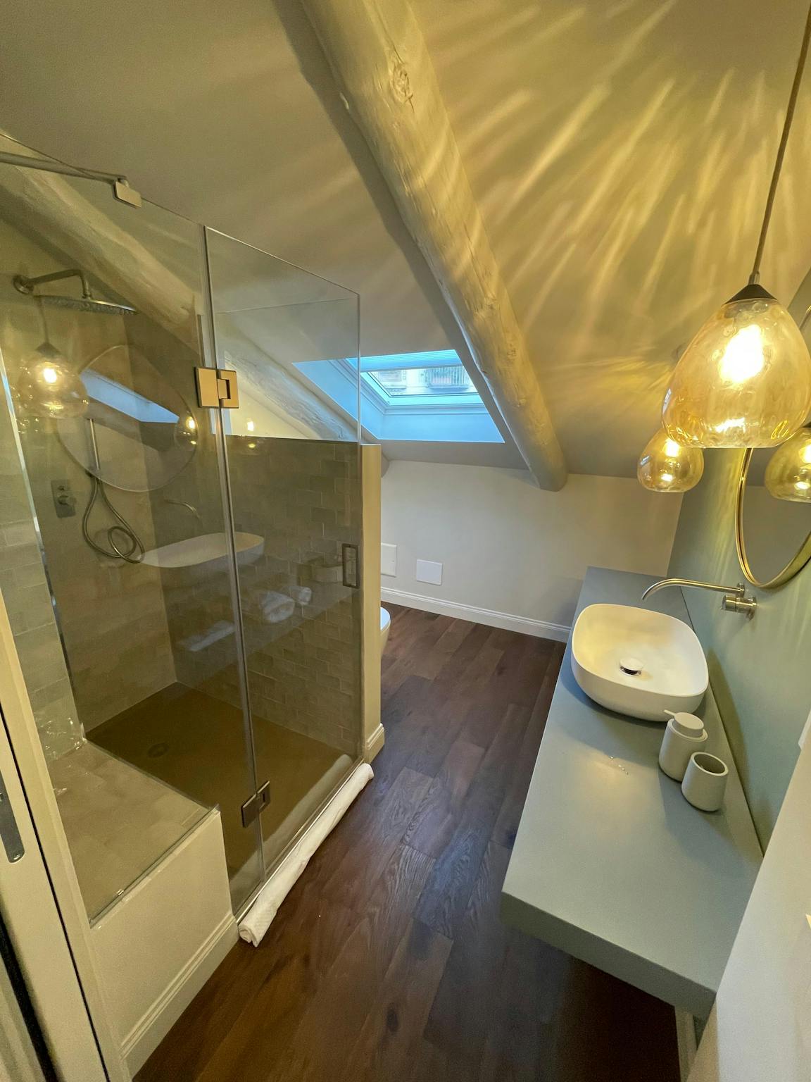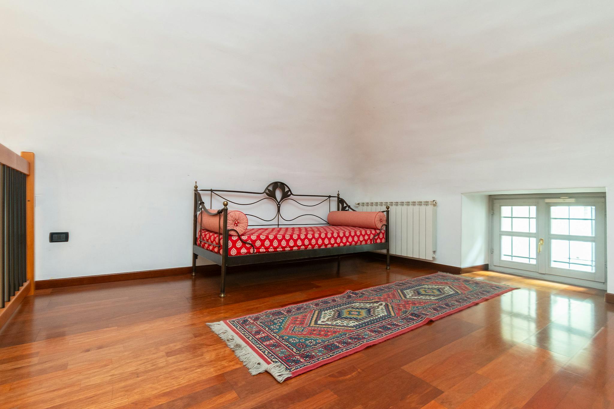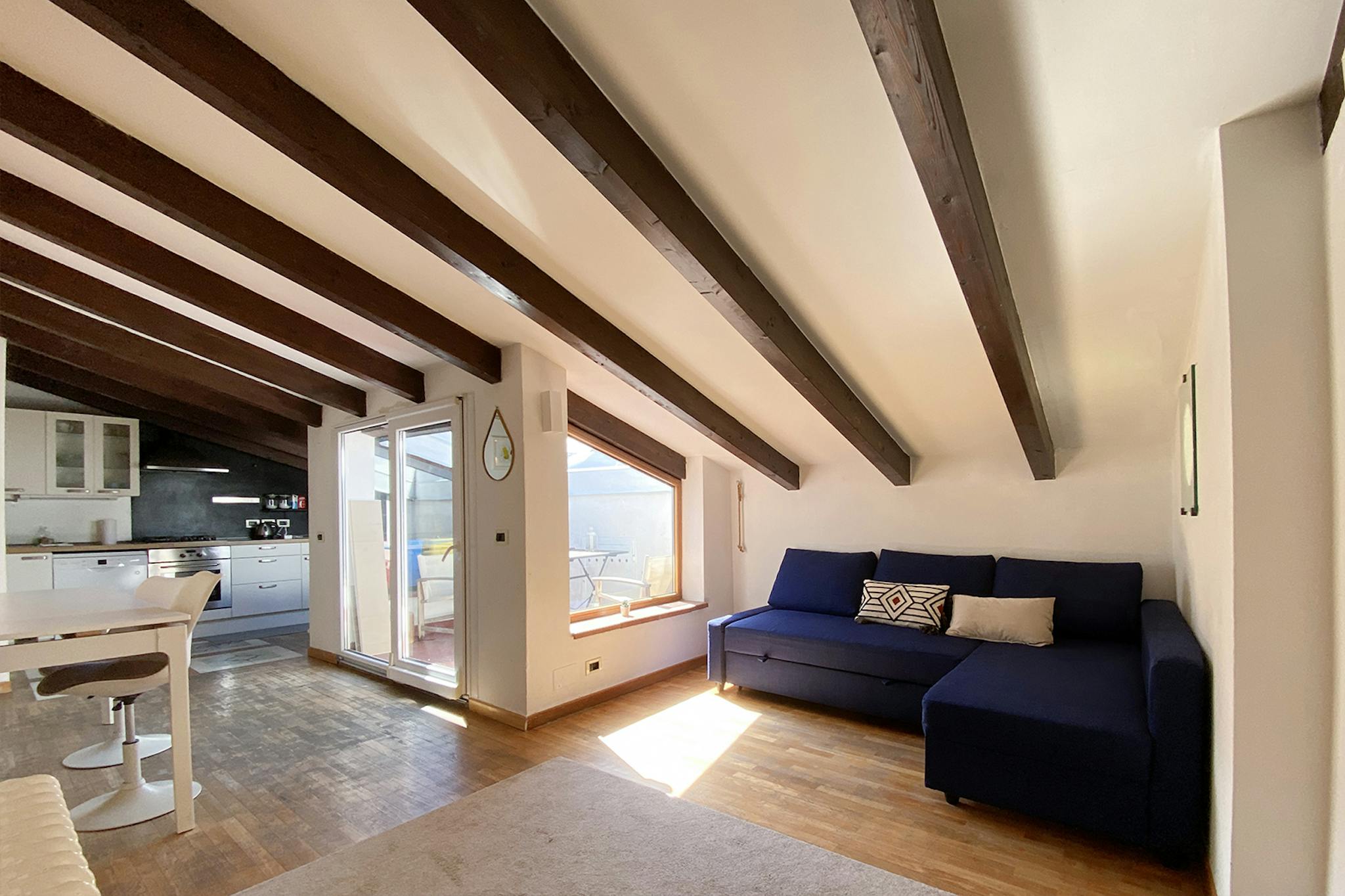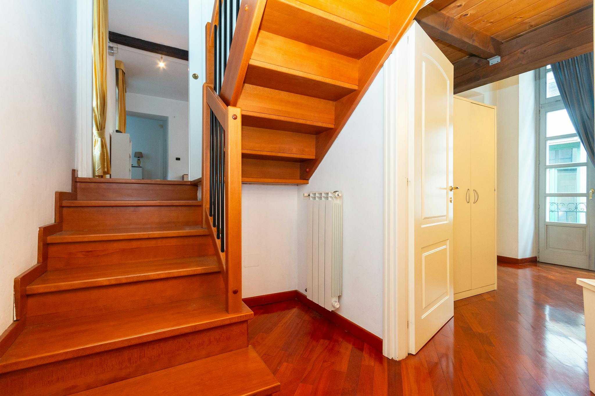 This apartment, located on the third floor of a building without a lift, opens onto a small entrance where a slightly steep staircase leads to the upper floor, to a very large and bright open space area, with access to a terrace equipped with a ta...