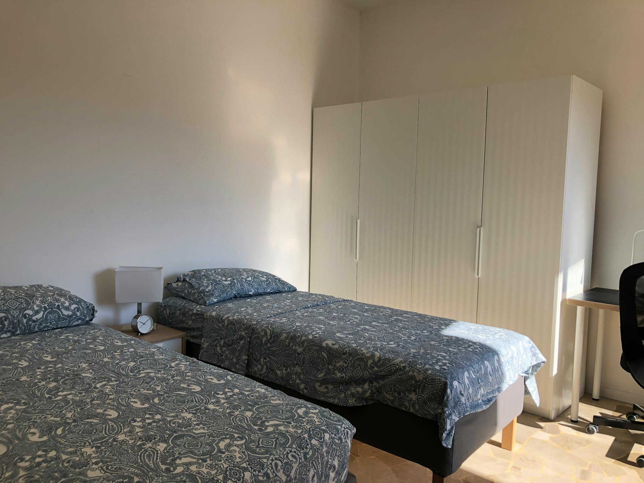 Each apartment - about 60 square meters - consists of 3 bedrooms (2 singles + 1 twin with single beds), a kitchen/living room and a bathroom. The flat has two balconies overlooking public greenery that gives the entire apartment silence and tranqu...
