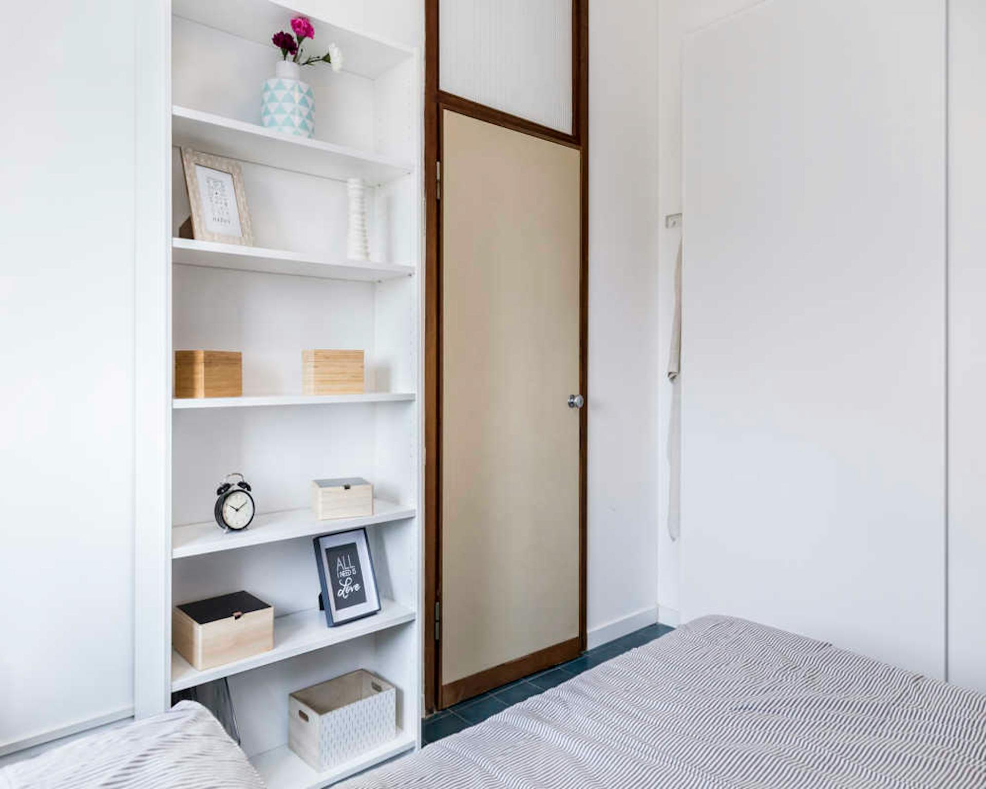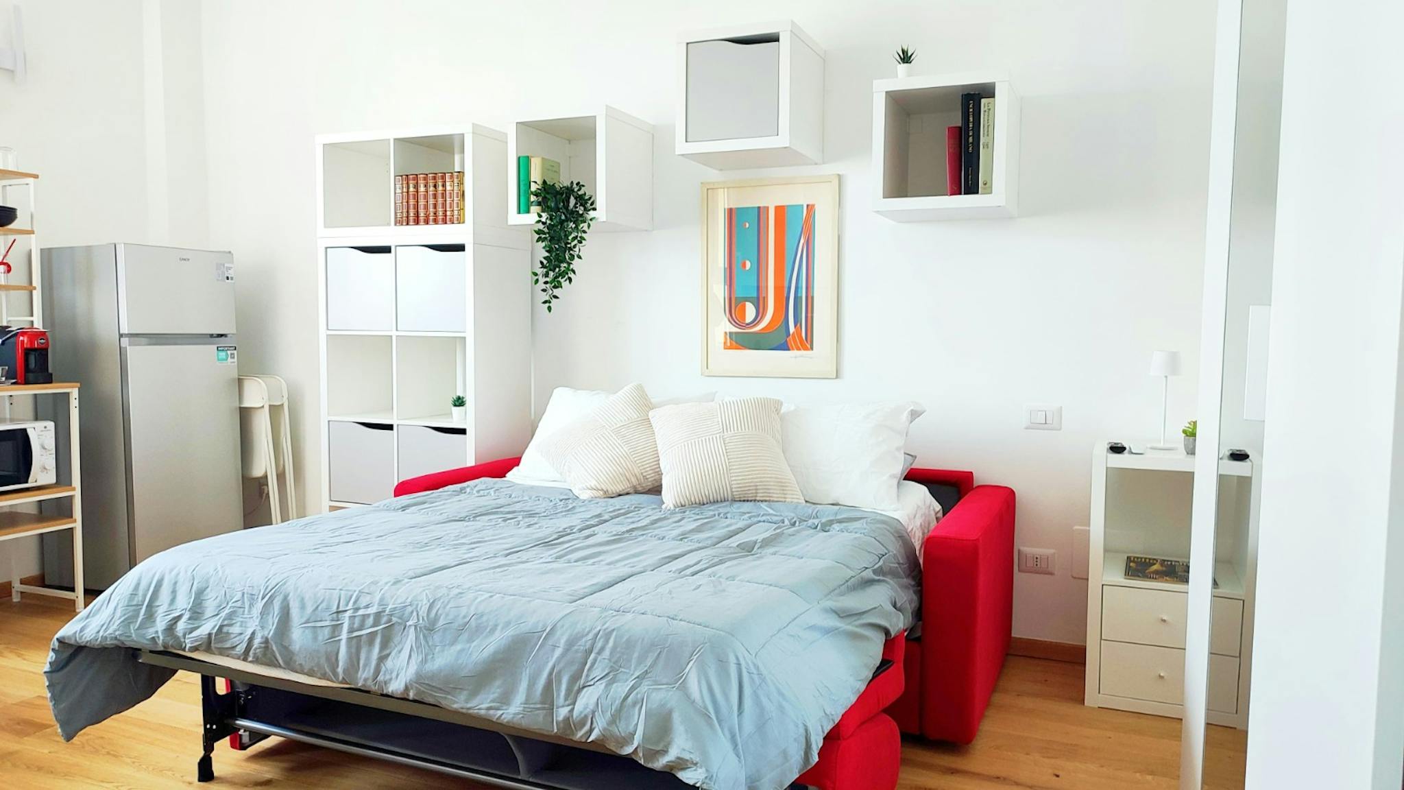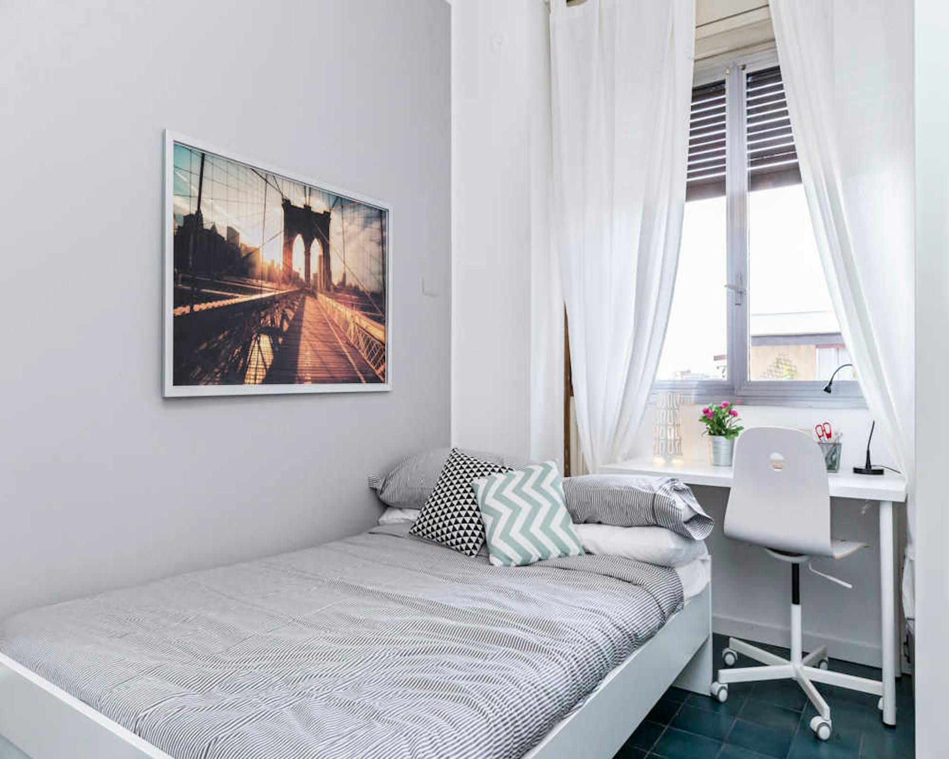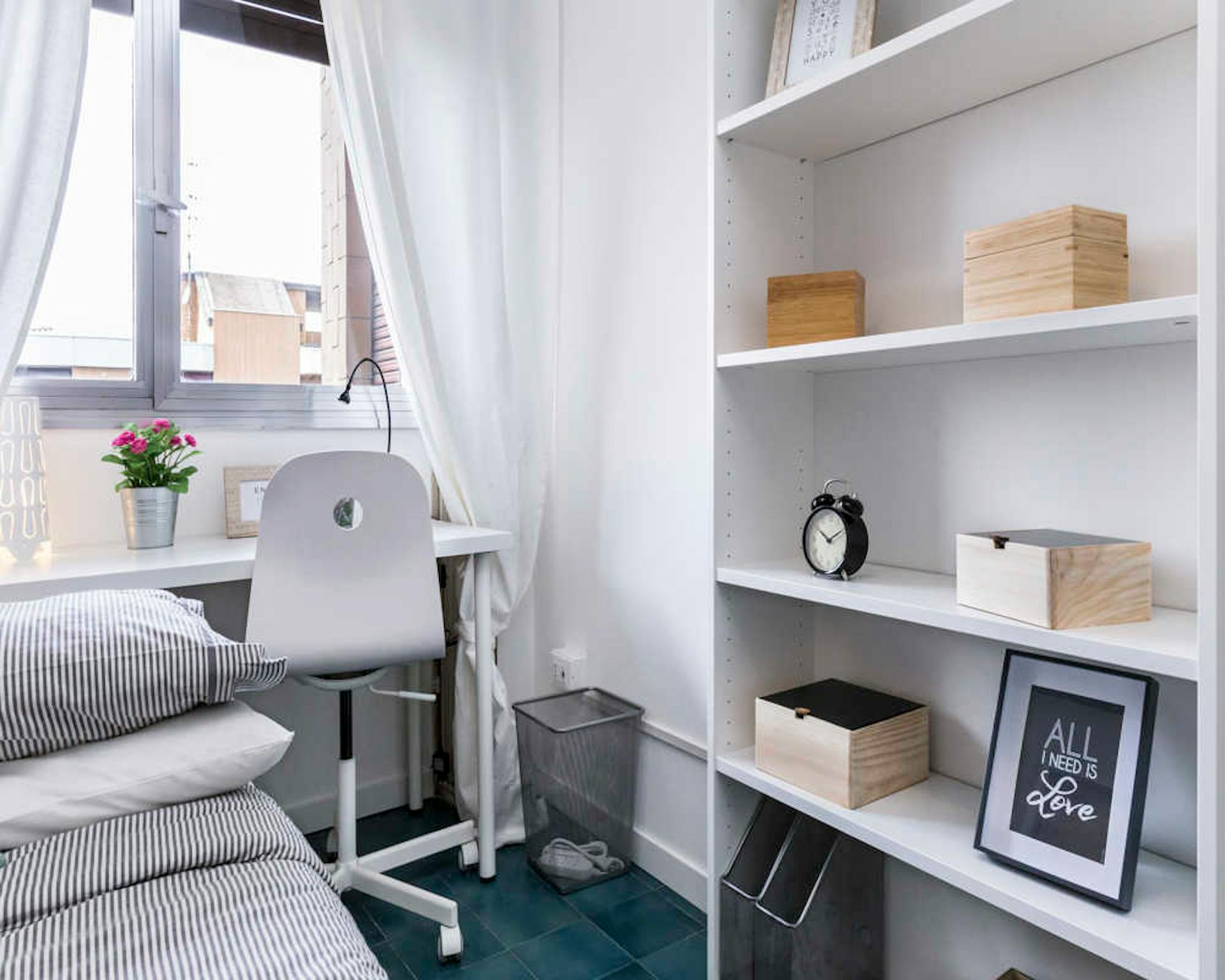 Bed place in a shared room with 2 beds, in a modern, comfortable, colorful and full of design house, with 3 rooms, with a big kitchen, dishwasher, oven, microwave, washing machine, a large living room with sofa bed, smart tv led, 2 bathrooms with ...