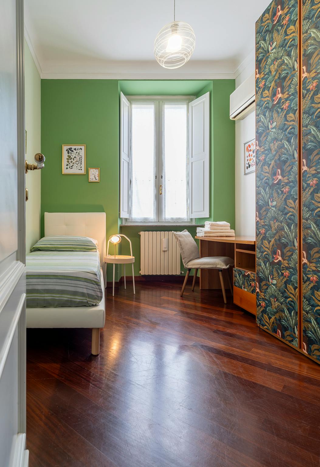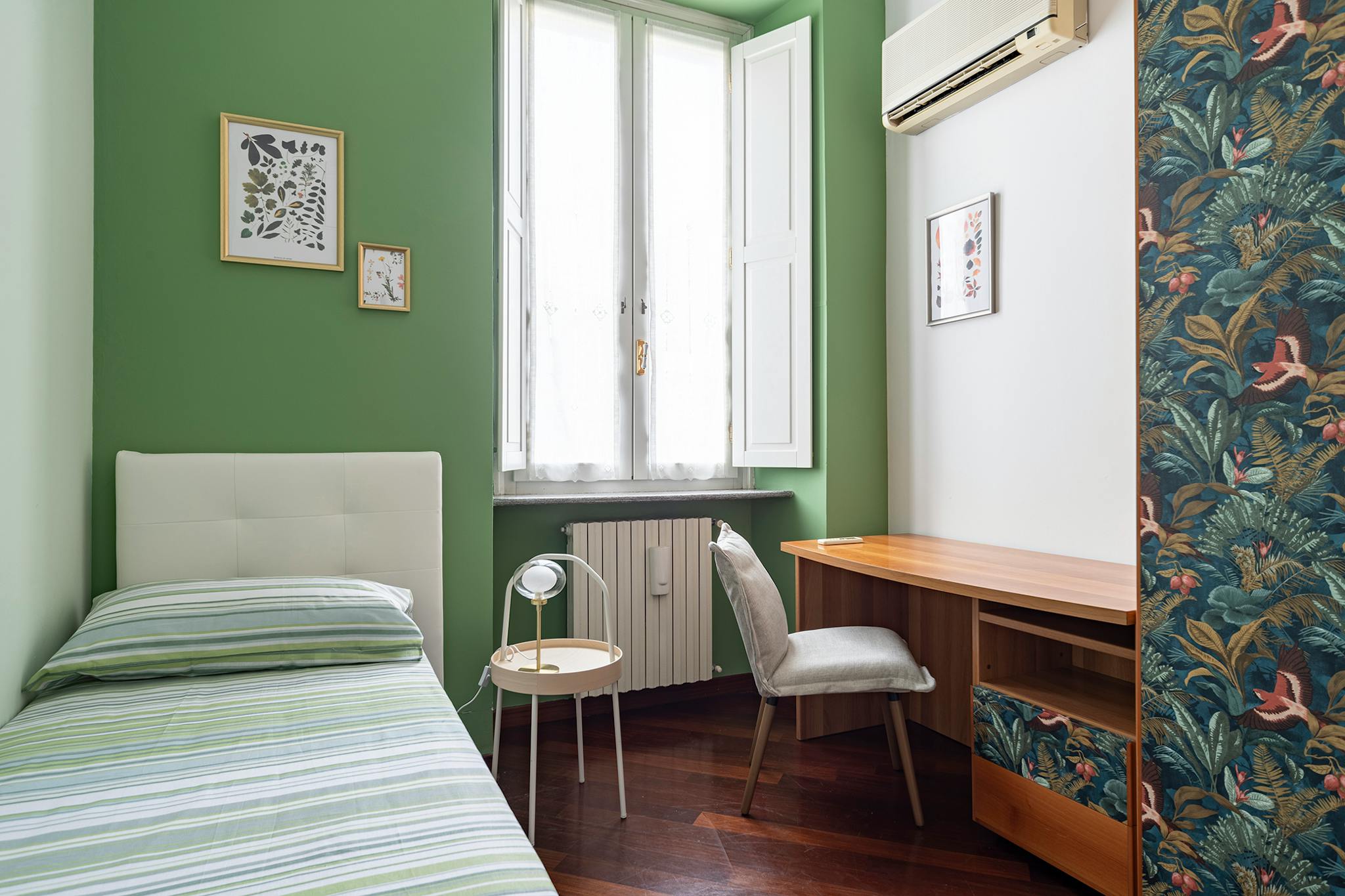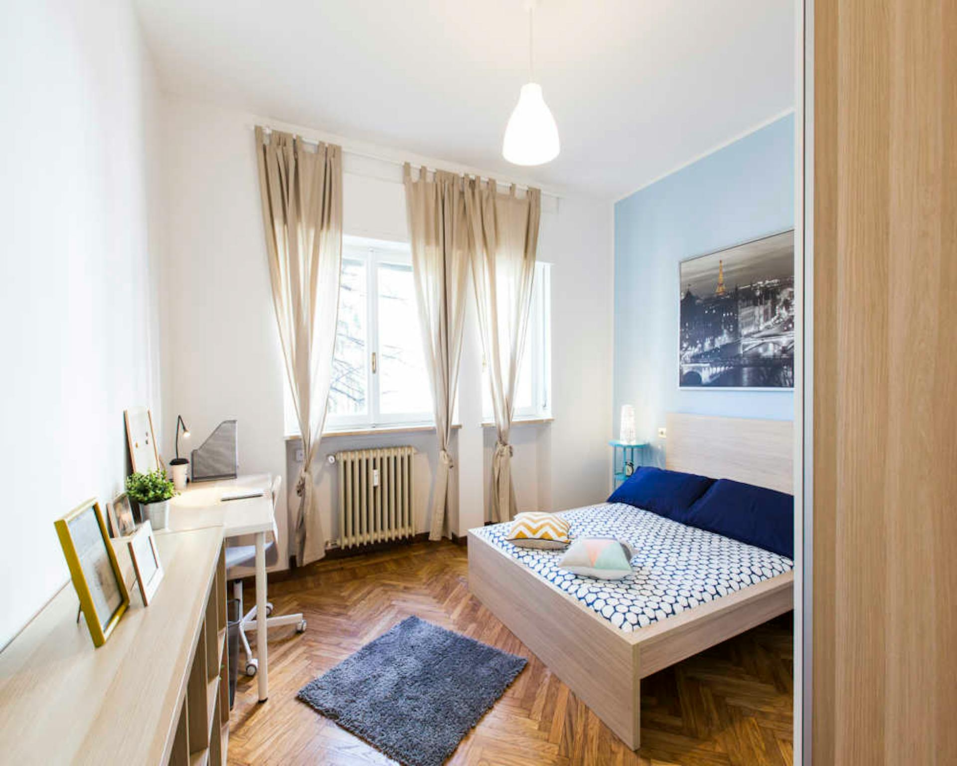 Bright and comfortable room, composed of two single beds, a wardrobe, a desk, and a chair. The room is situated in an apartment on the ground floor with three other bedrooms, one bathroom with a shower, and a fully equipped kitchen with access to...