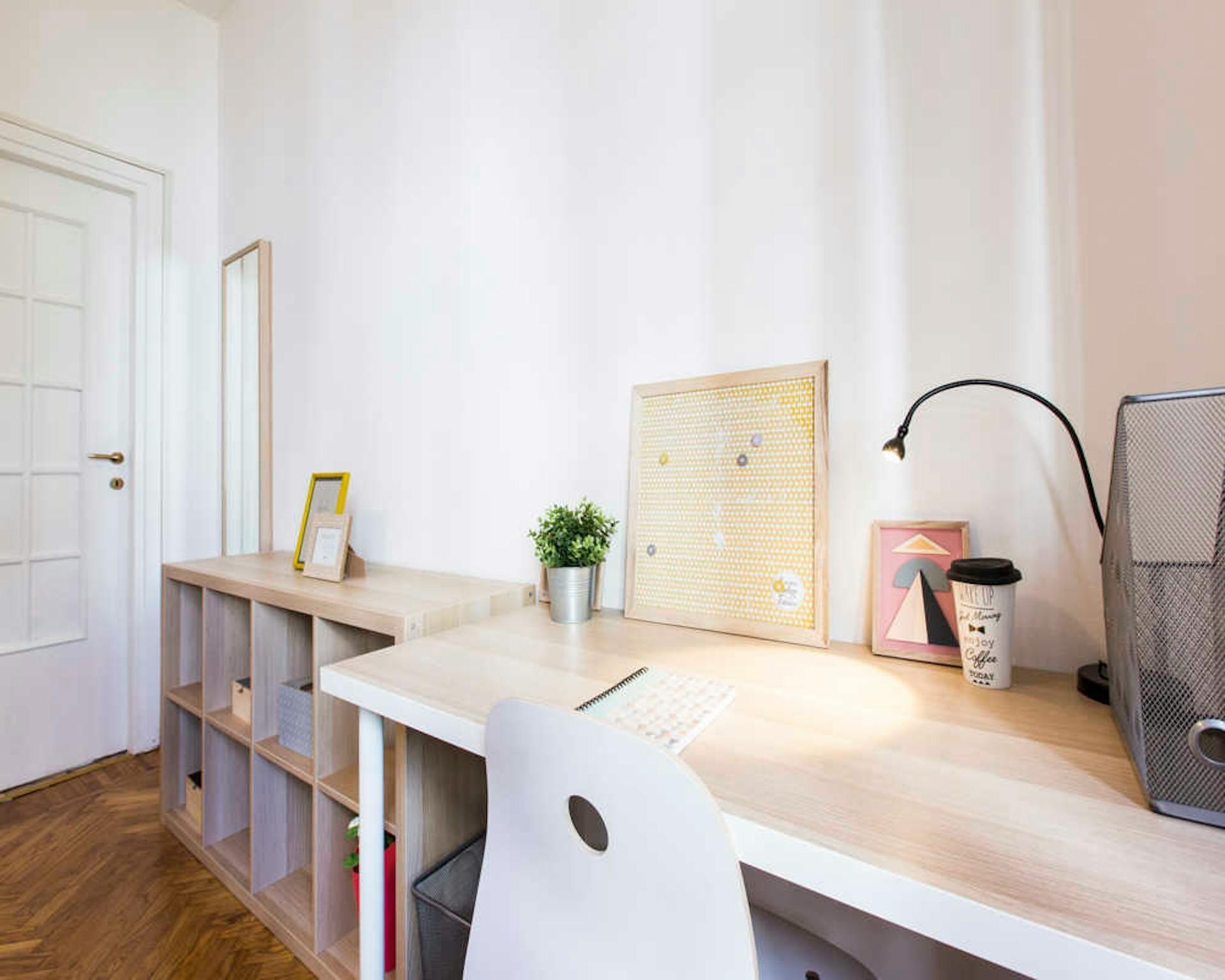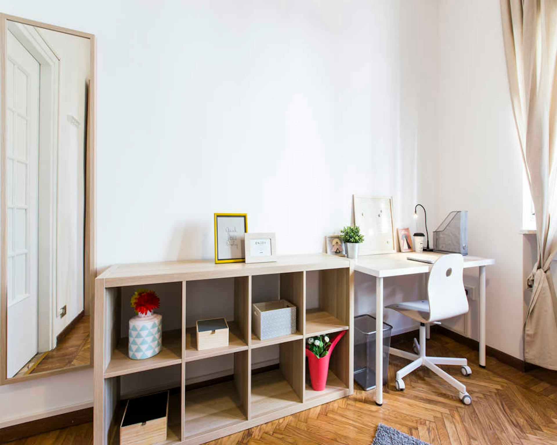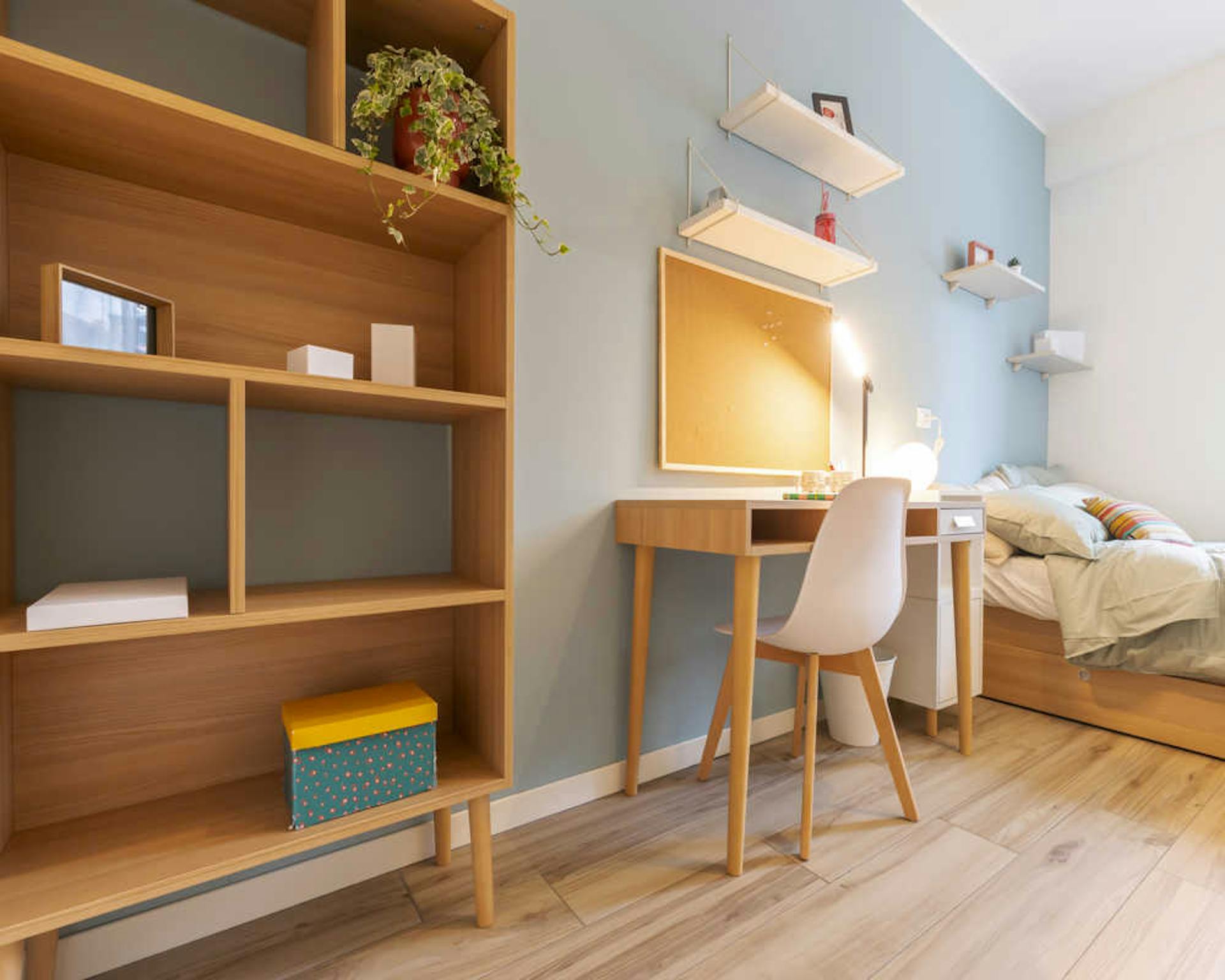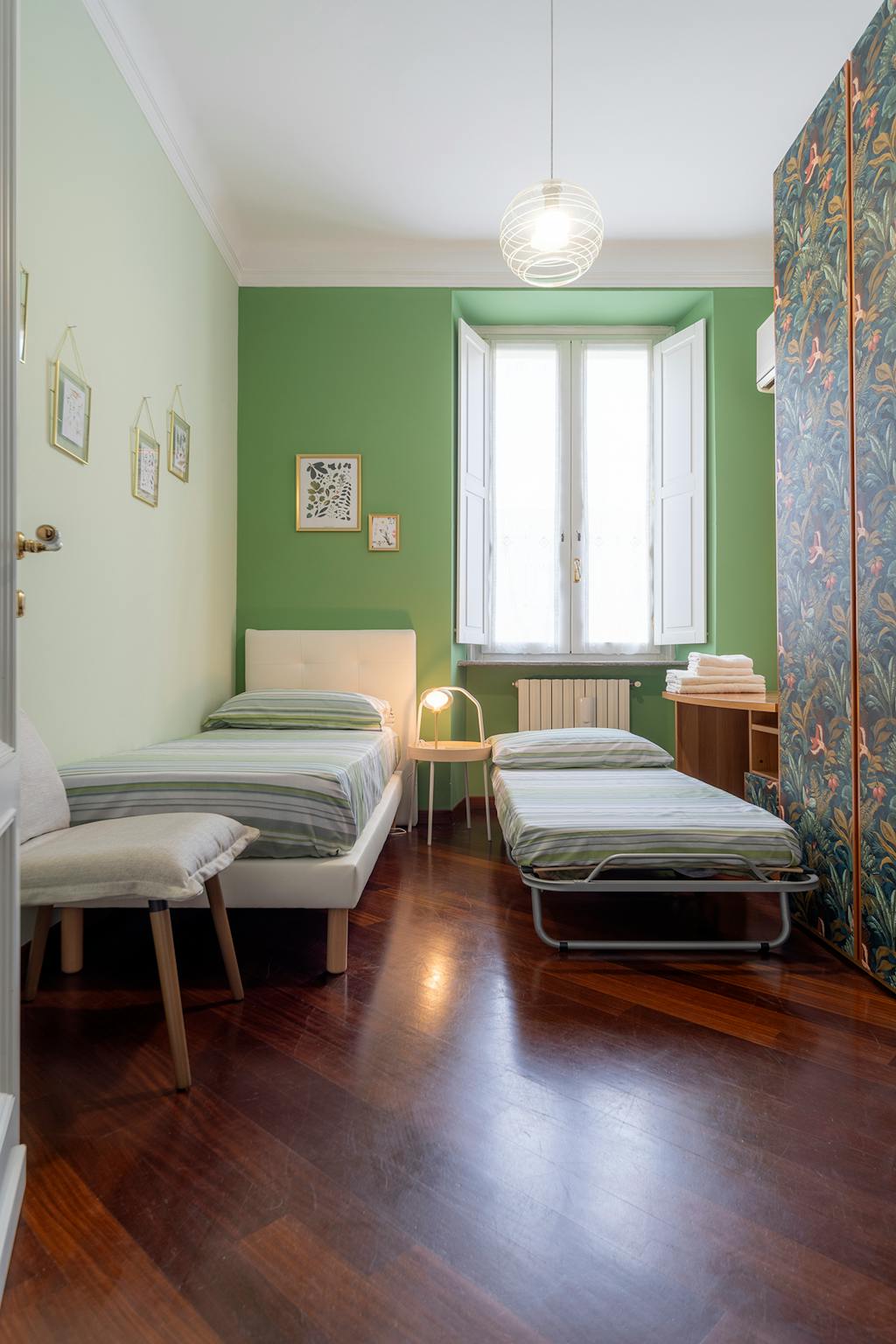 Bright and comfortable room, composed of two single beds, a wardrobe, a desk, and a chair. The room is situated in an apartment on the ground floor with three other bedrooms, one bathroom with a shower, and a fully equipped kitchen with access to...