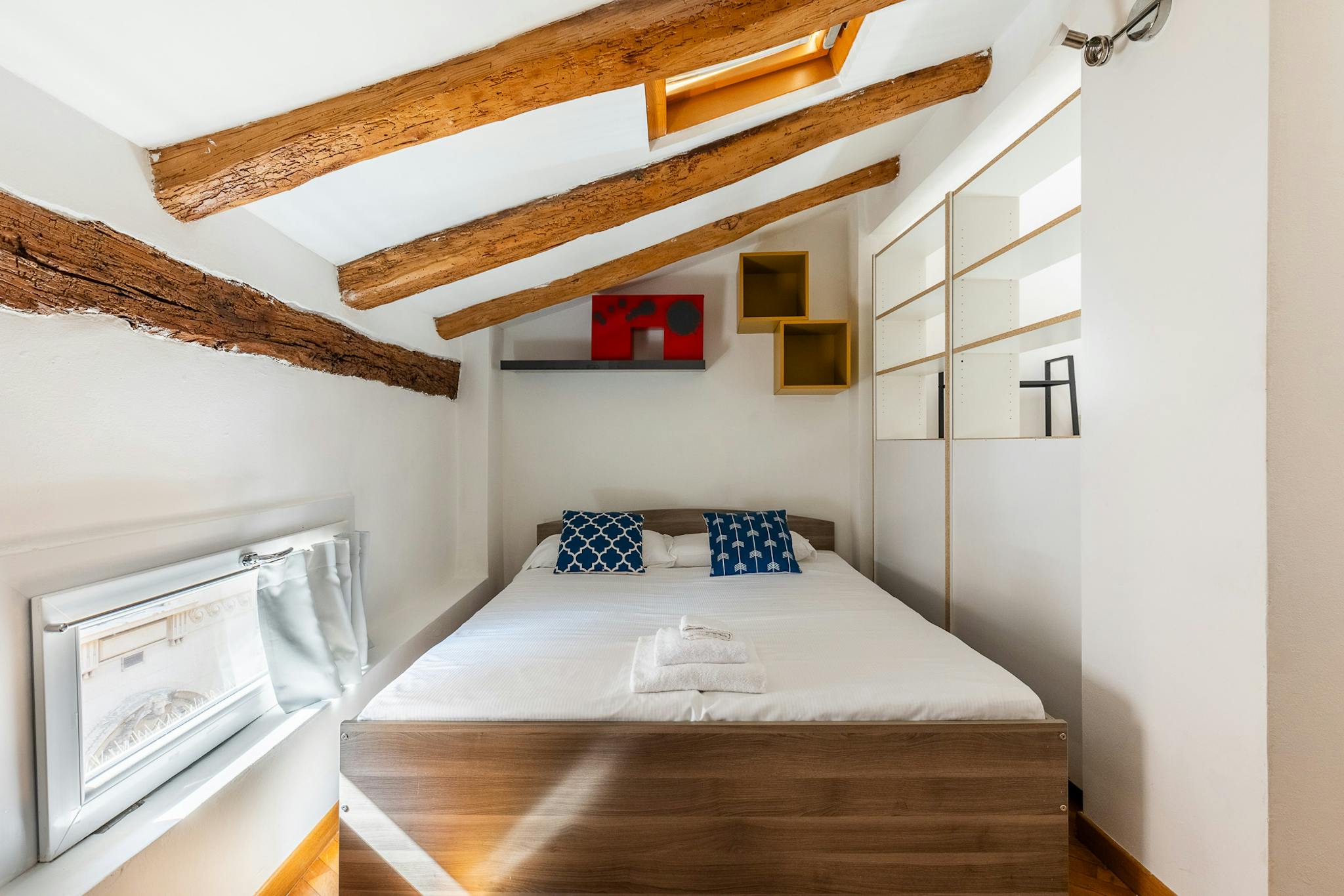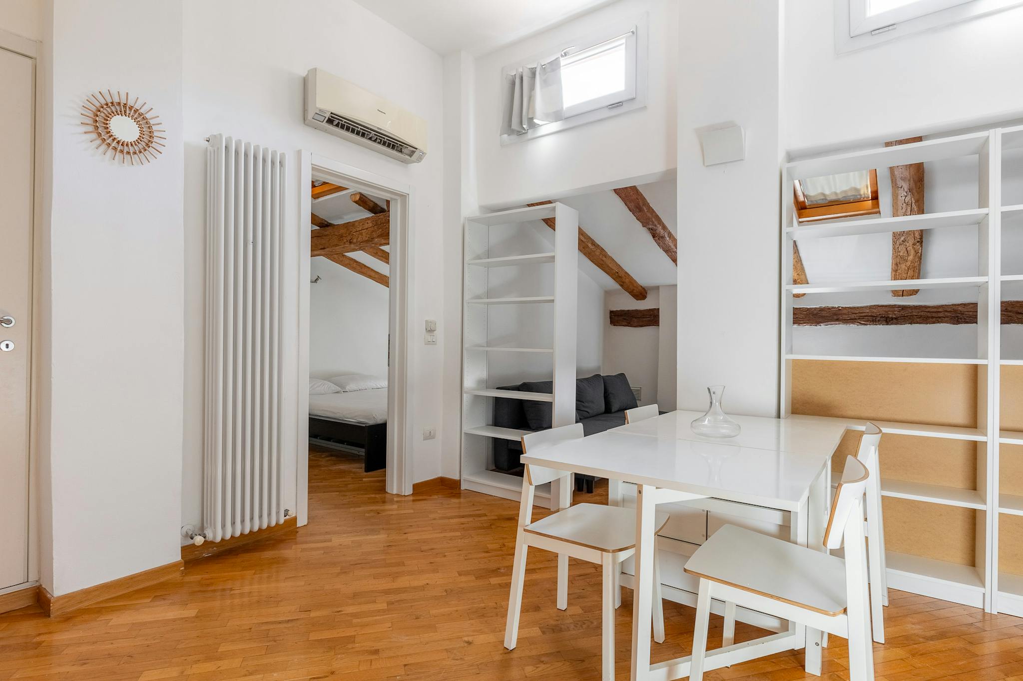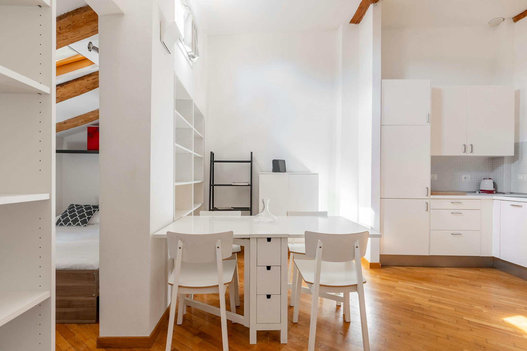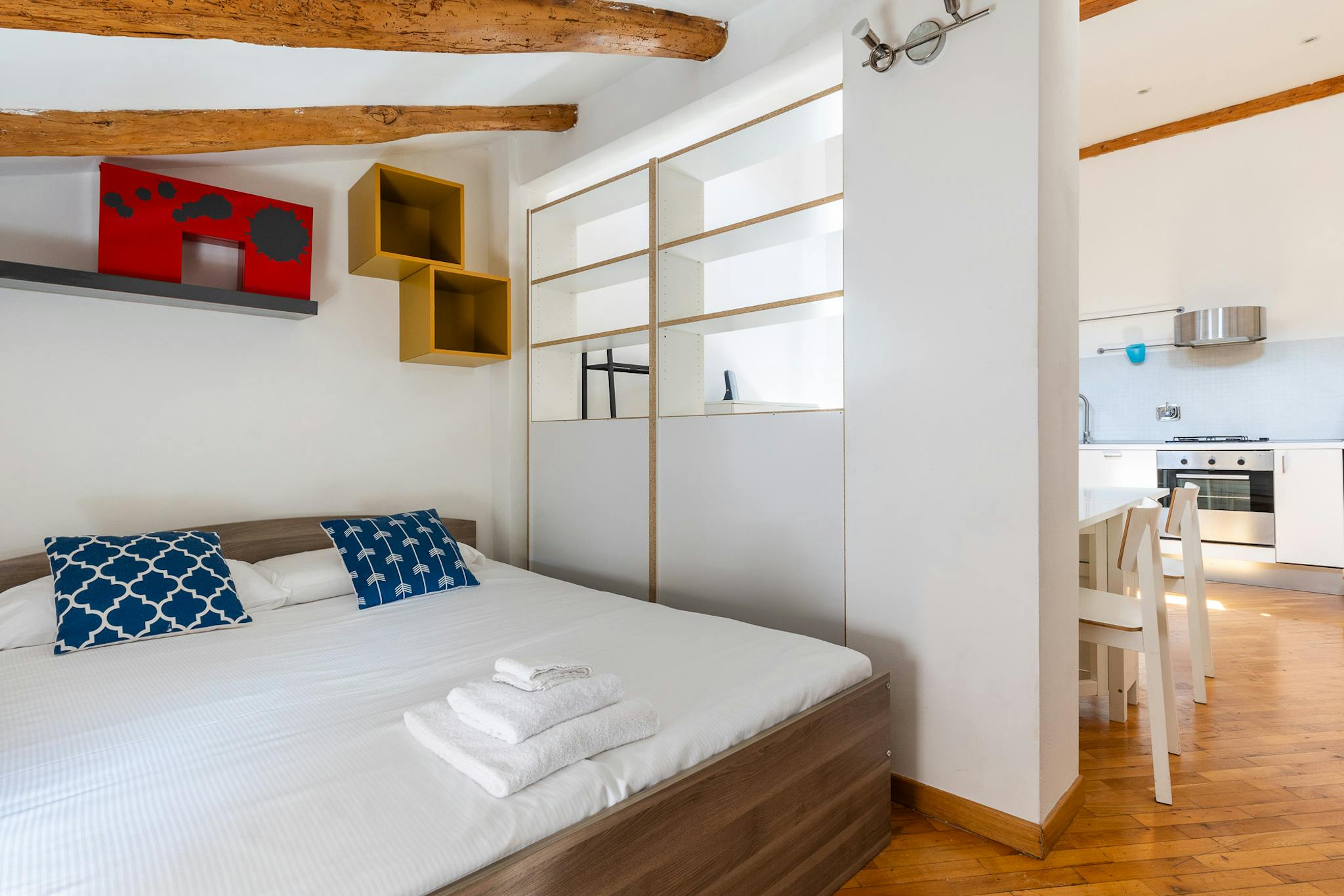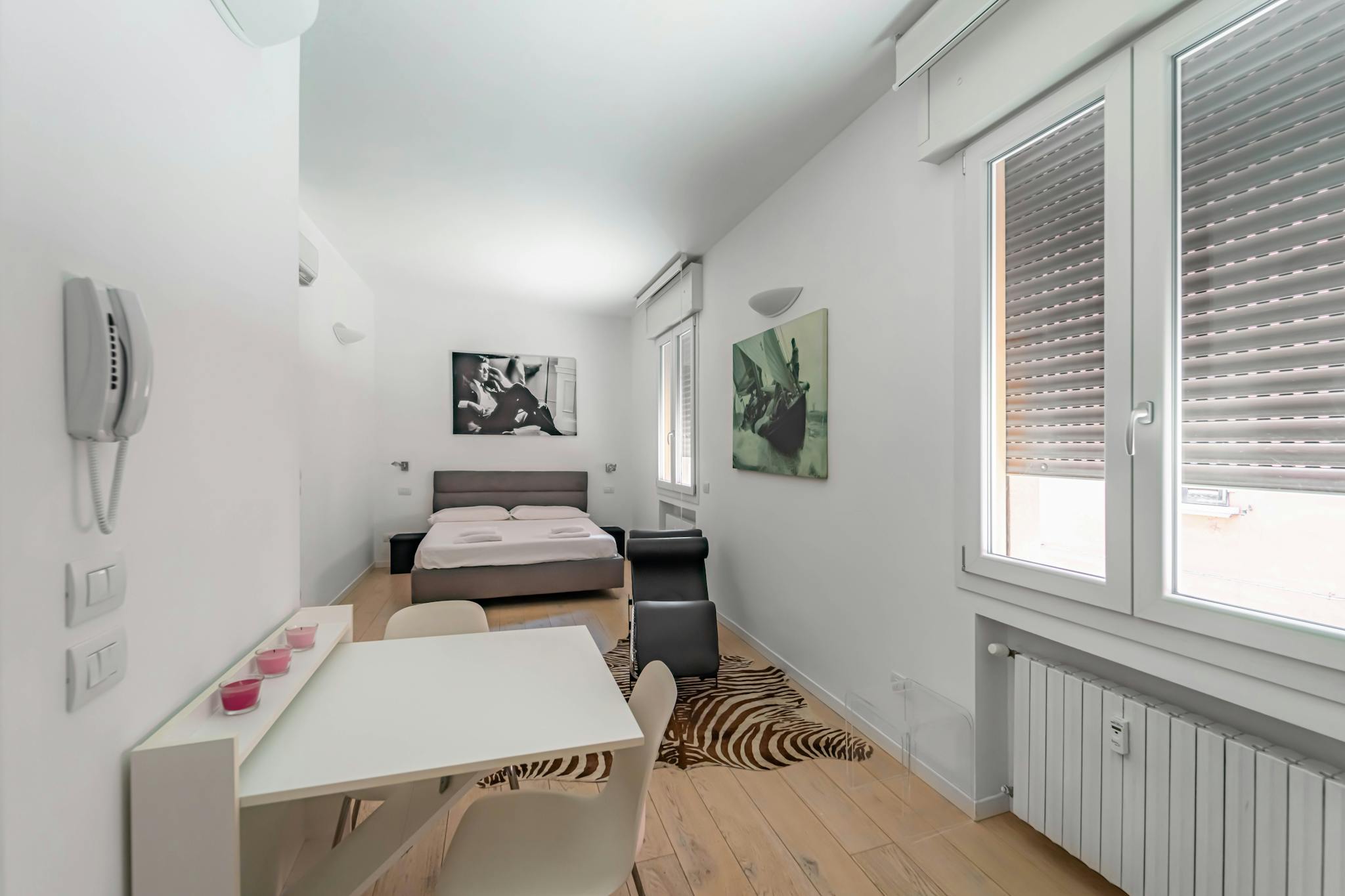 Modern and charming apartment of about 50 sqm, located in the heart of the historic center of Bologna. The apartment is on the third floor without elevator and consists of: living room with dining area and kitchen, bedroom with double bed, small b...