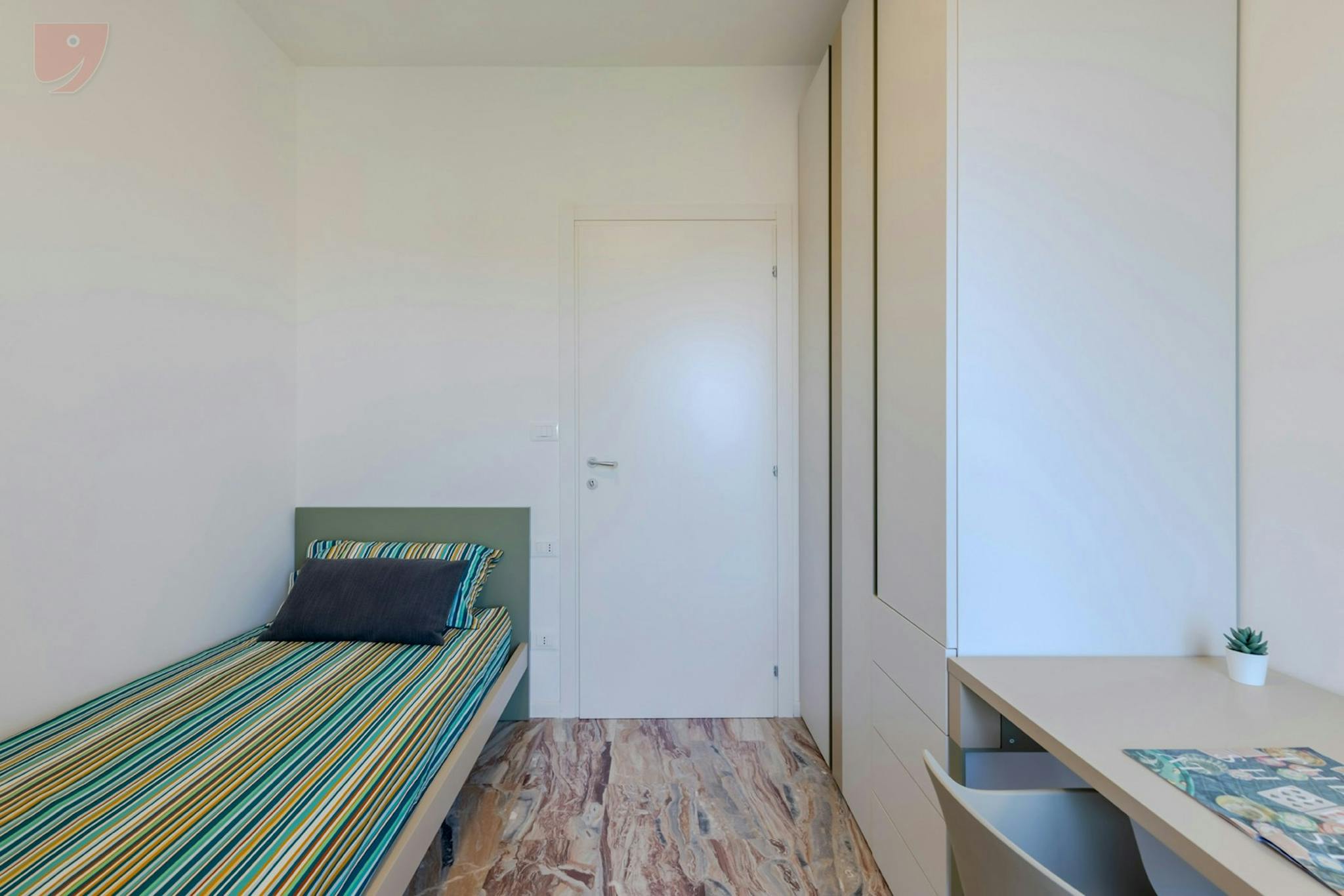 Single room in a shared apartment, composed by 7 bedrooms and 3 bathrooms. Of about 10 sqm with a one and a half bed and a work station. With wifi, concierge services, dishwasher, washing machine. Energy class: C, IPE 133.85 Kwh/Sqm year. Curren...