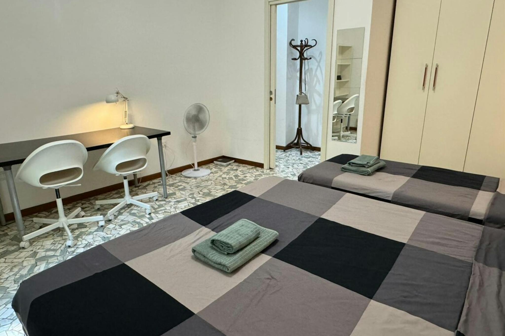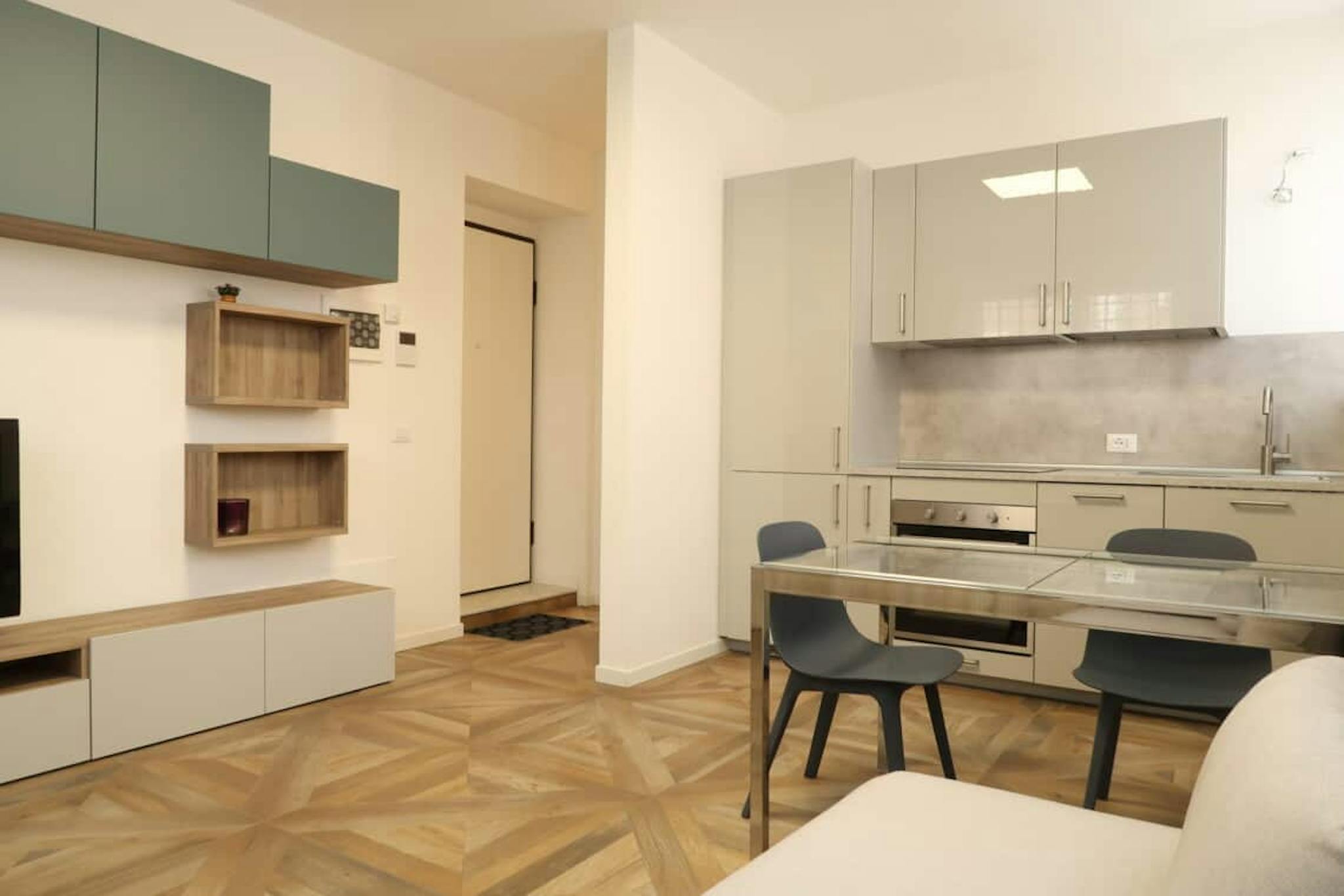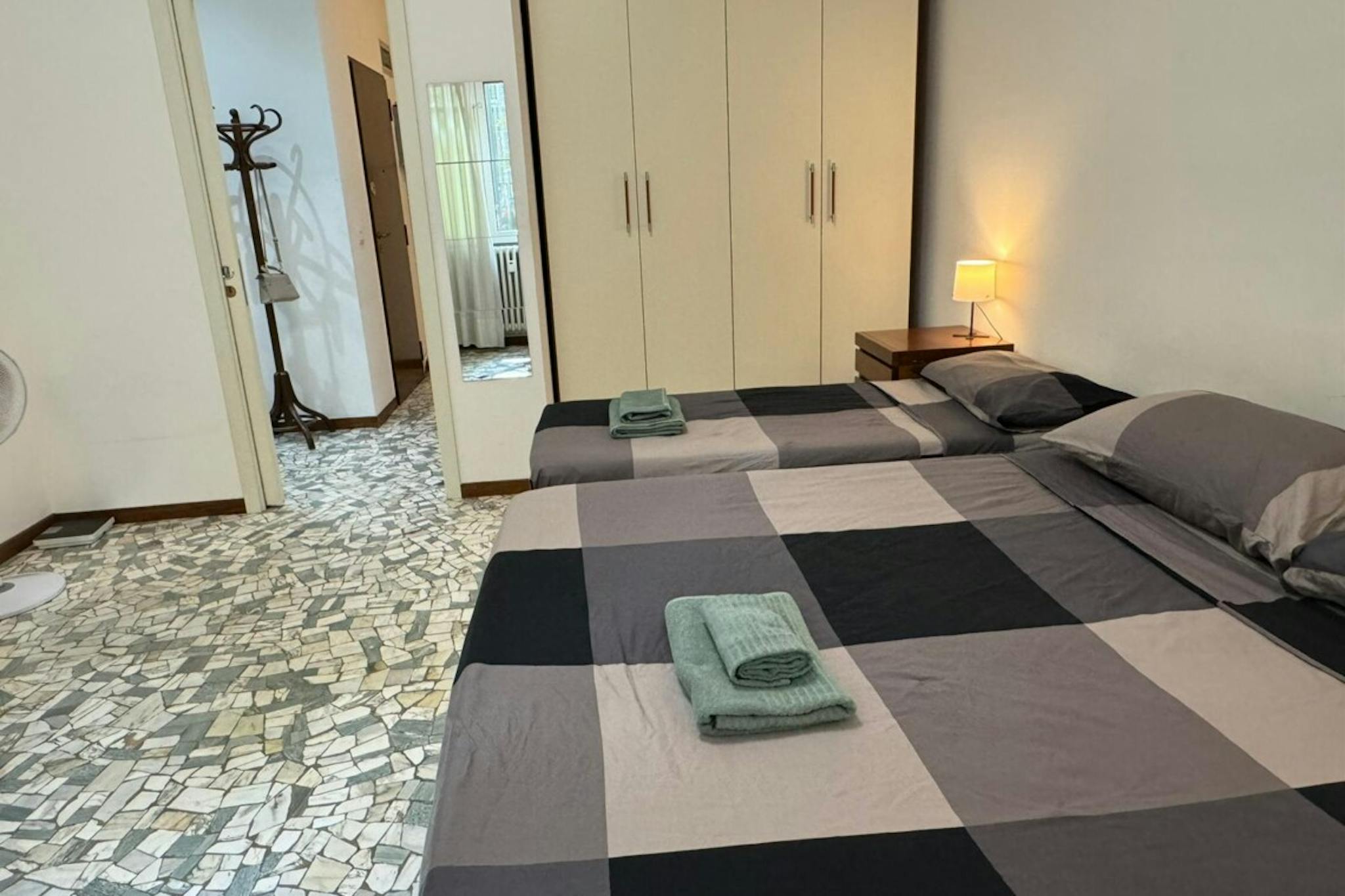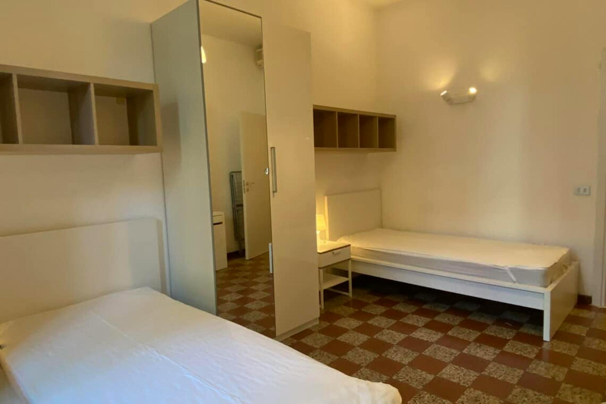 Apartment Description Entering in the apartment, from the corridor, on the left there is the fully equipped kitchen with table and chairs, the TV, the washing machine. In the larger bedroom with the parquet wooden floor, there are 2 single beds, ...