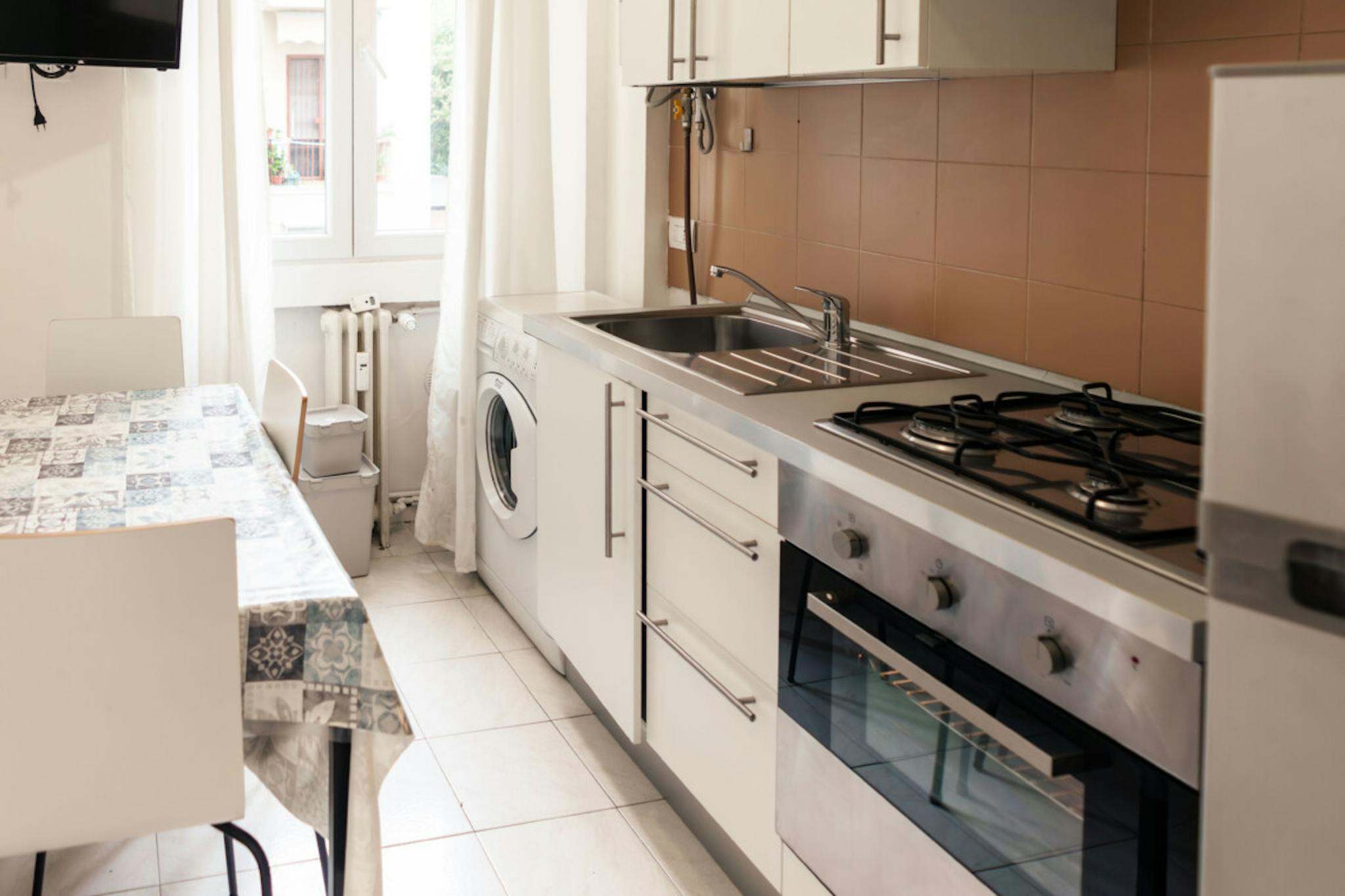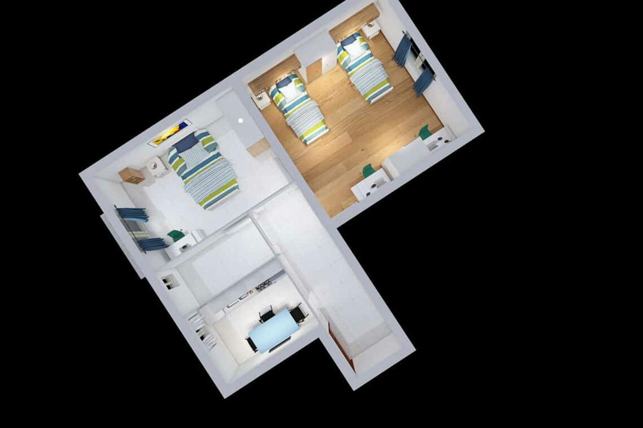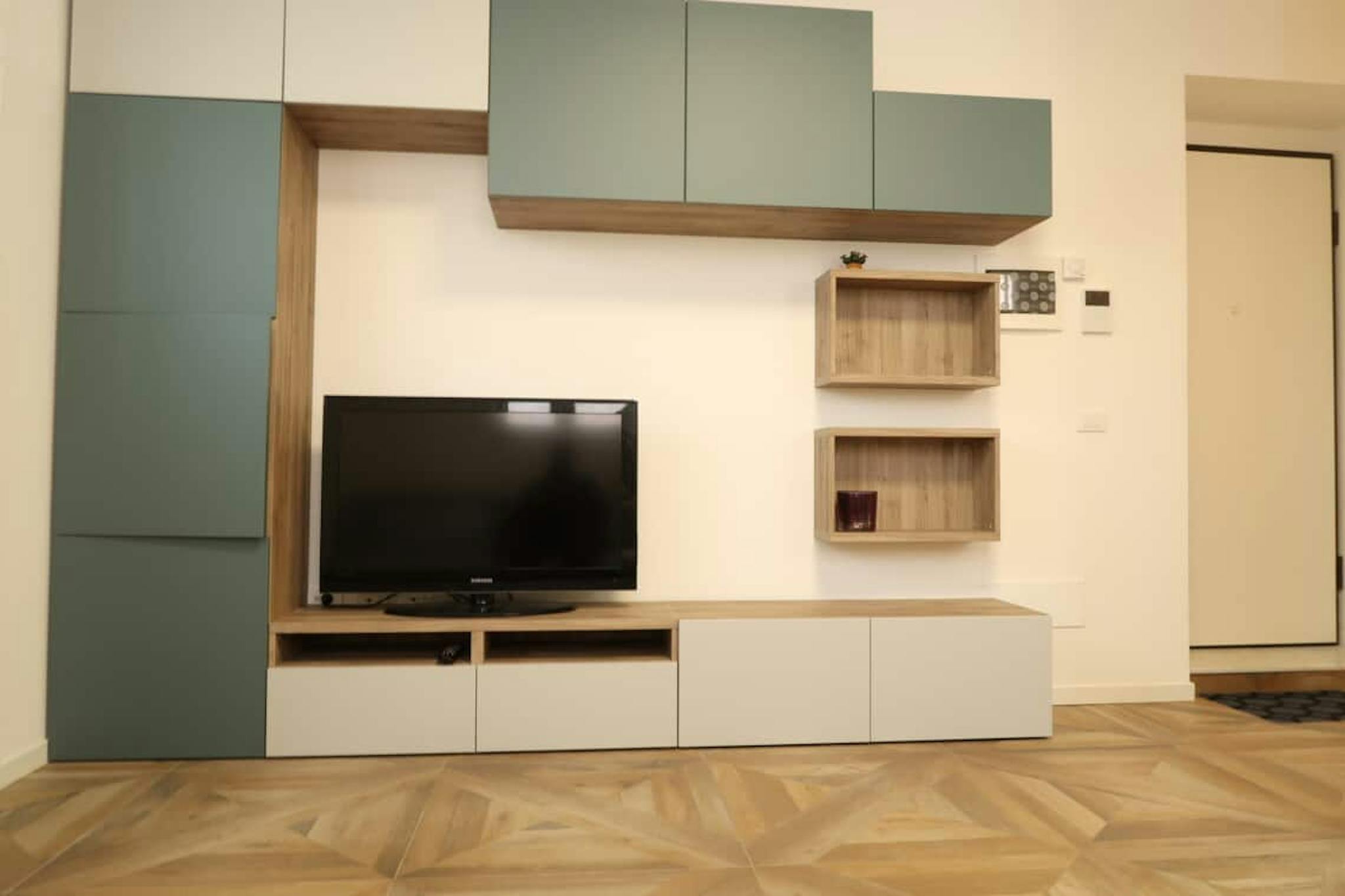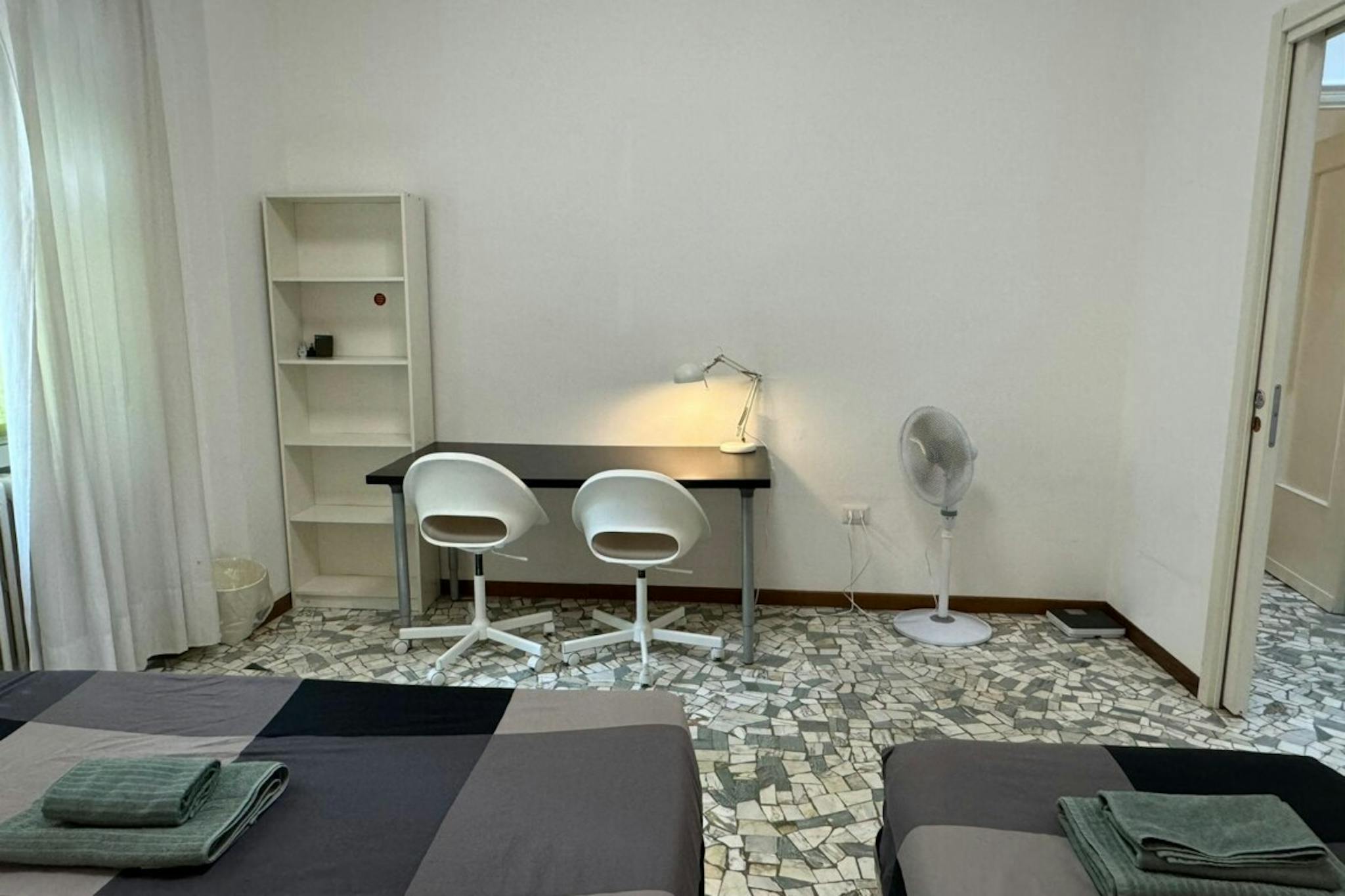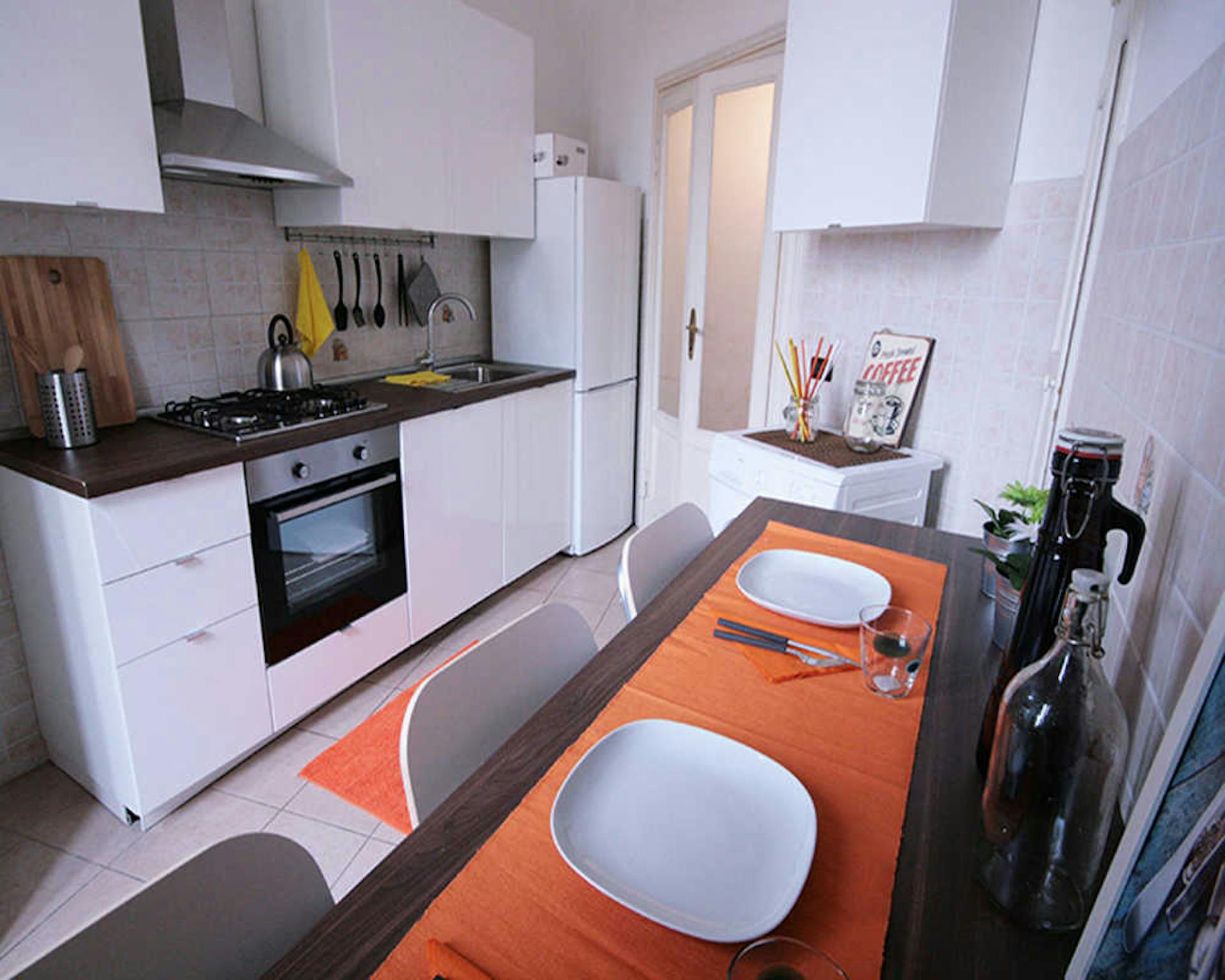 Apartment Description Entering in the apartment, from the corridor, on the left there is the fully equipped kitchen with table and chairs, the TV, the washing machine. In the larger bedroom with the parquet wooden floor, there are 2 single beds, ...