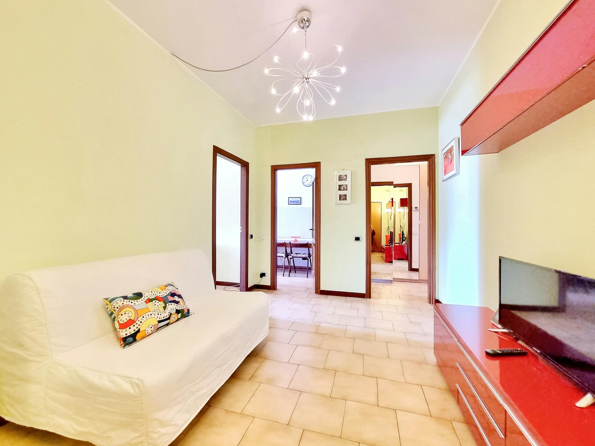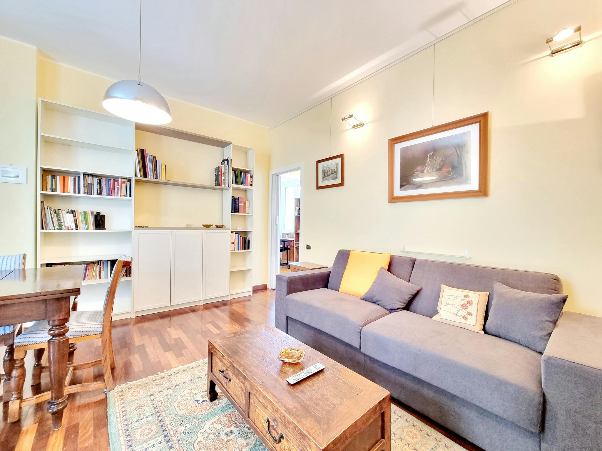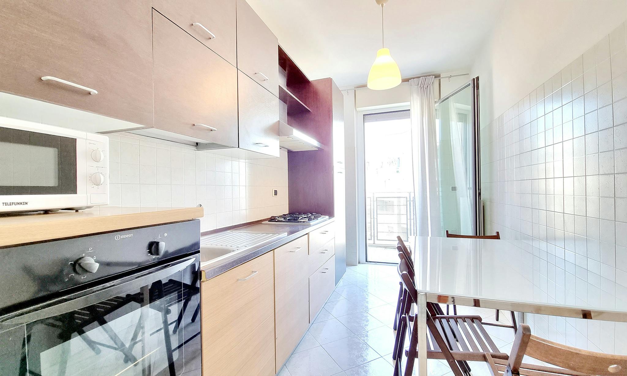 Spazioso, completamente ristrutturato e moderno bilocale composto da ampio ingresso contenente la scrivania, scaffali in legno e libreria. Salotto arredato con divano, tavolo da pranzo, mobile con la tv e l'ingresso sul balcone. La cucina nuova e ...