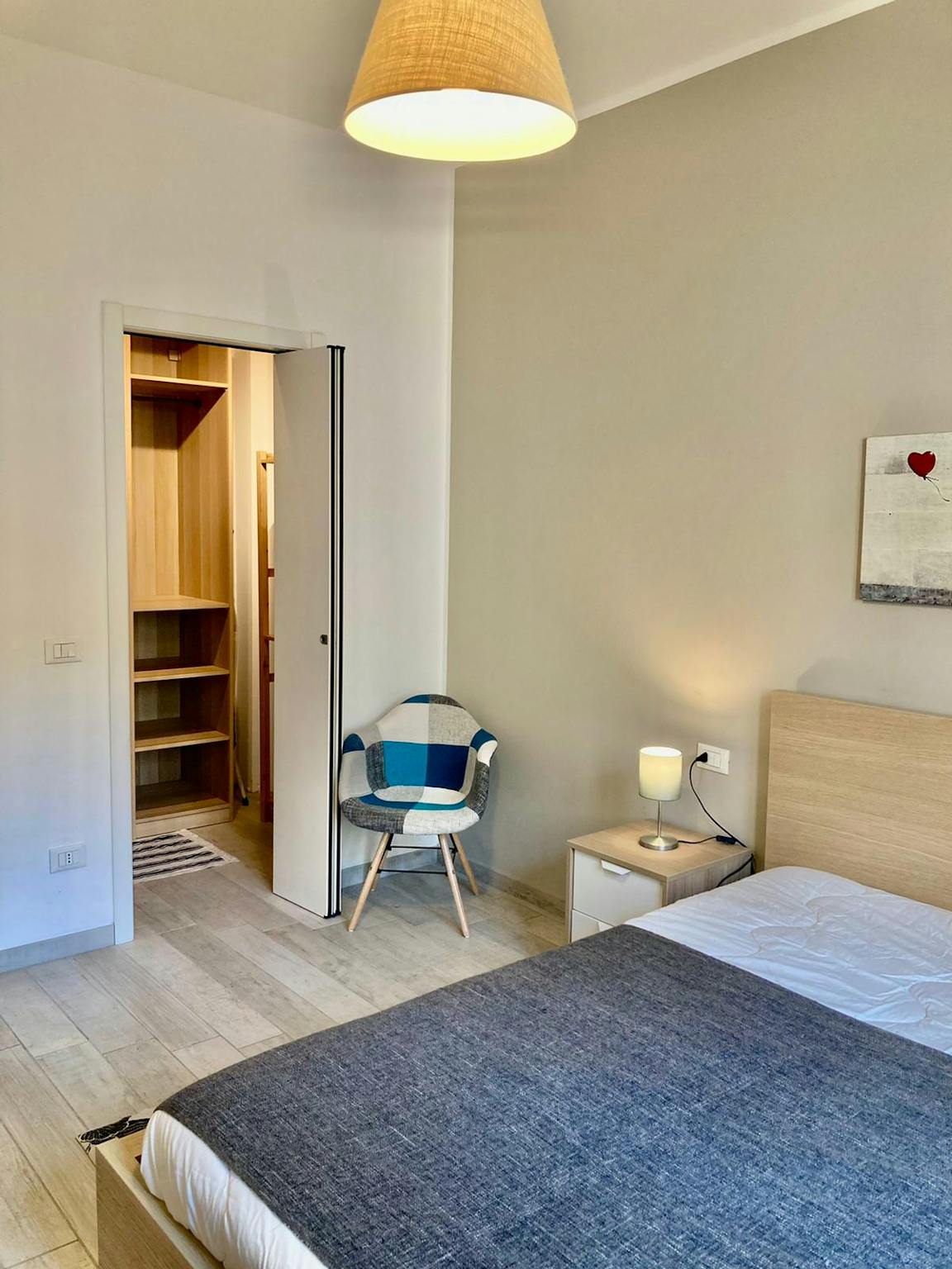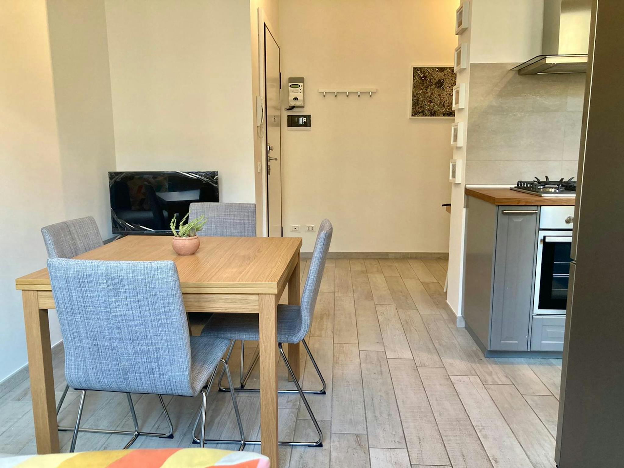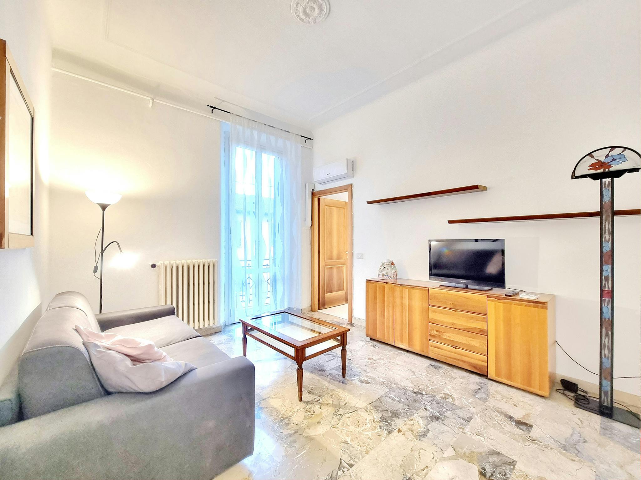 Spazioso, completamente ristrutturato e moderno bilocale composto da ampio ingresso contenente la scrivania, scaffali in legno e libreria. Salotto arredato con divano, tavolo da pranzo, mobile con la tv e l'ingresso sul balcone. La cucina nuova e ...