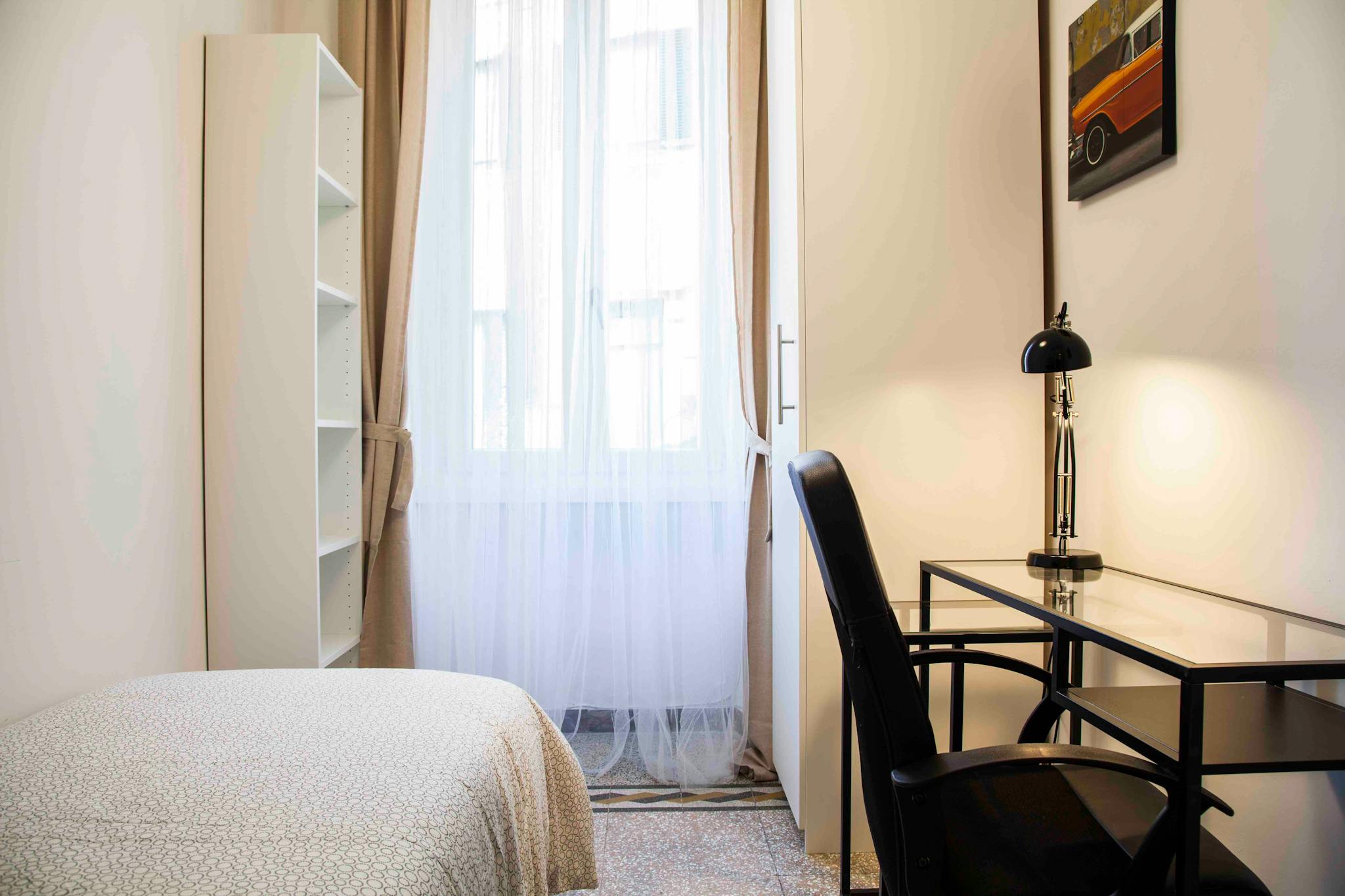 In the Politecnico area, via Barge 15, a single room. Second floor with lift. Room equipped with bed, wardrobe, desk. In the apartment there is only one other single room rented to a student of the polytechnic. Apartment has only 2 single room: on...