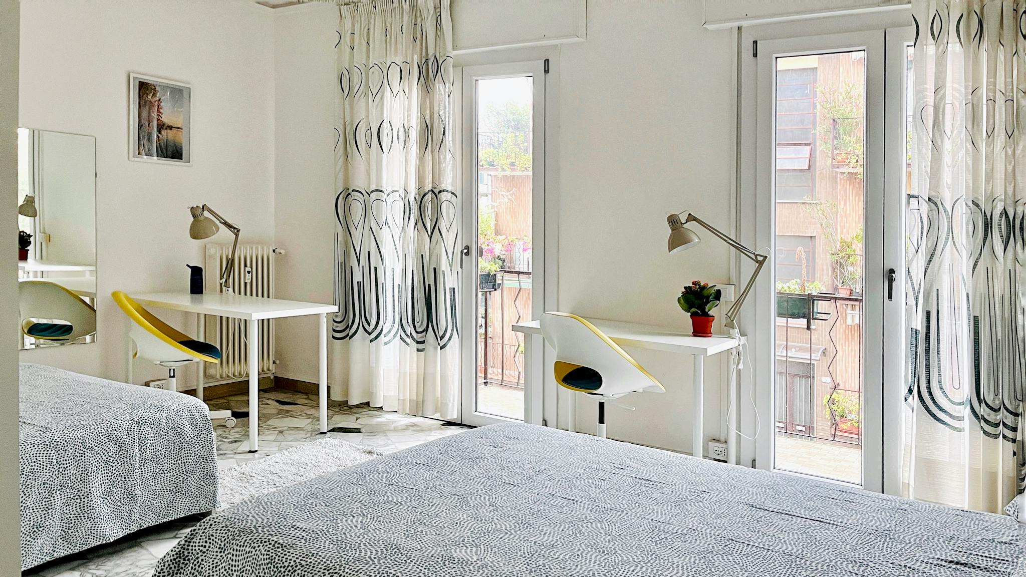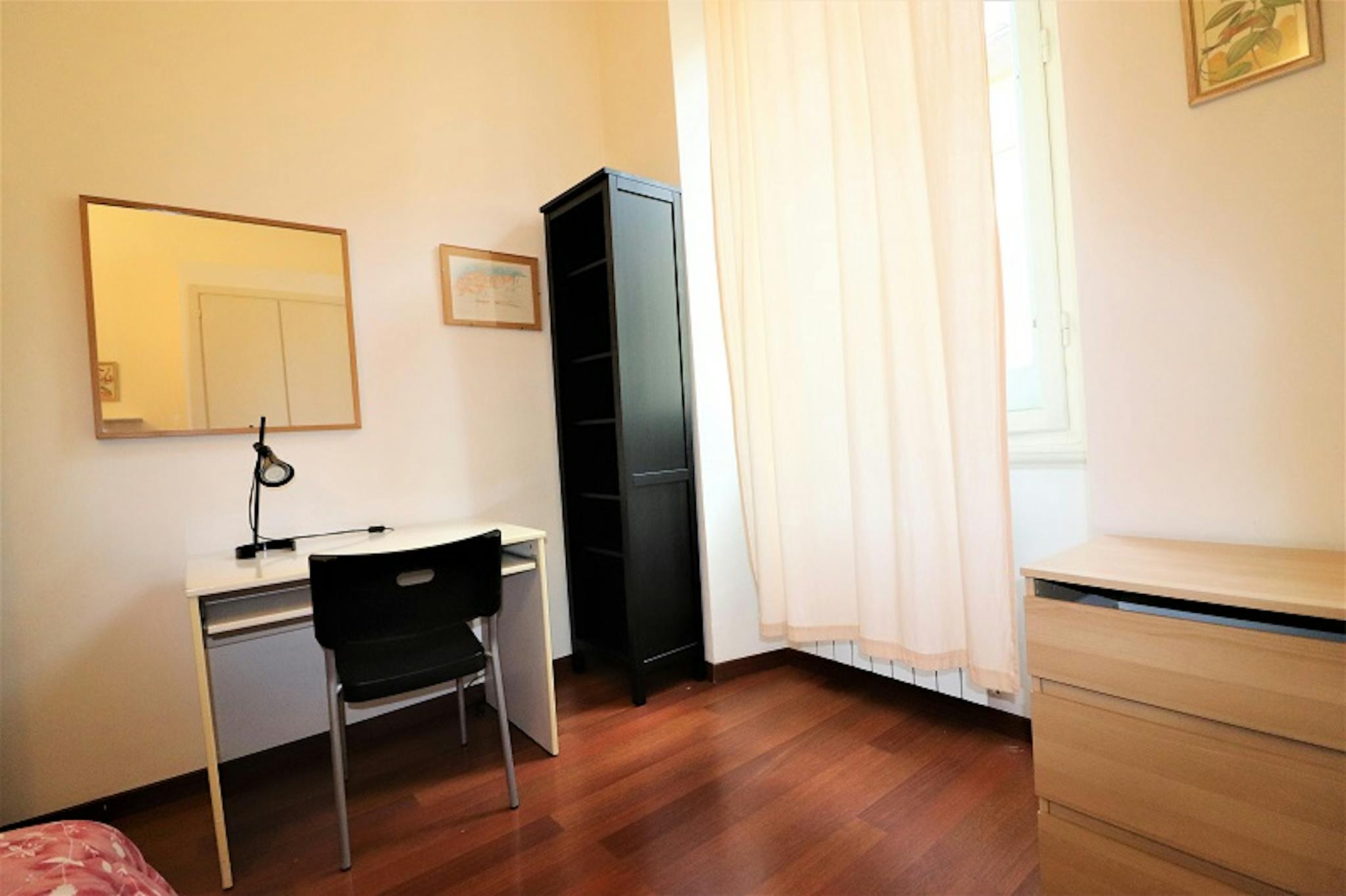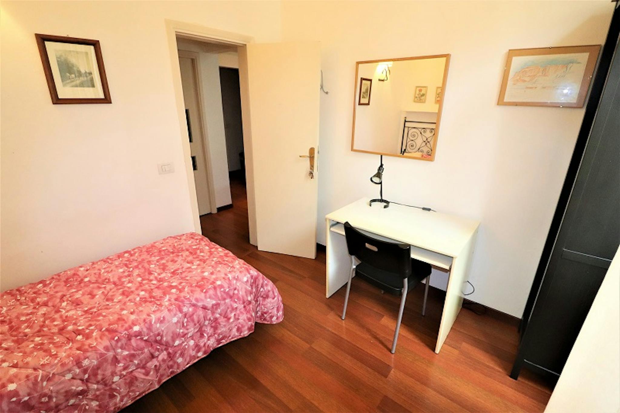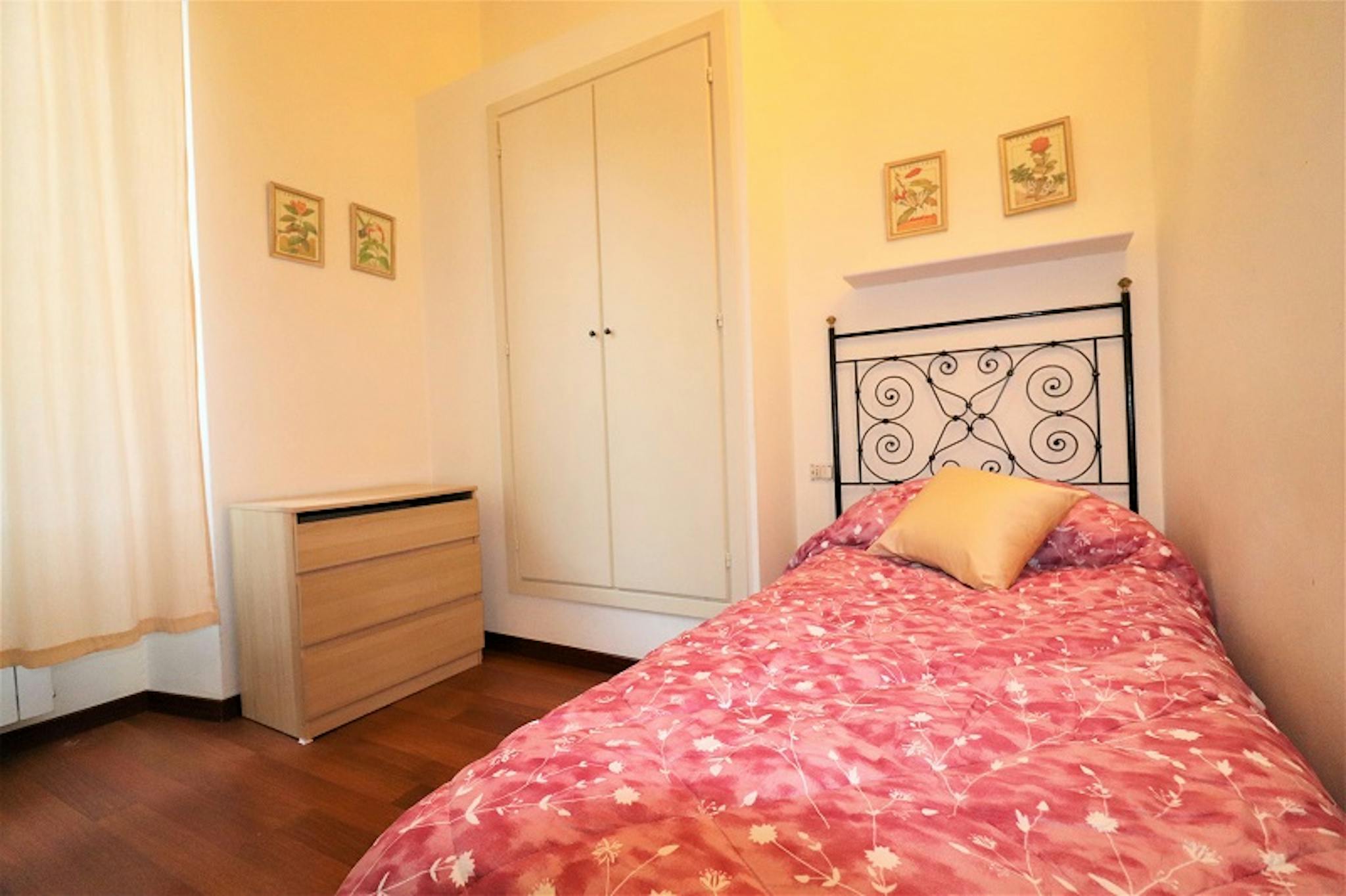 Bright and comfortable room, composed of a bed, a wardrobe, a desk, and a chair. The room is situated in an apartment on the second floor with 2 single bedrooms, one bathroom, and a totally equipped kitchen. The bills for water, gas, electricity...