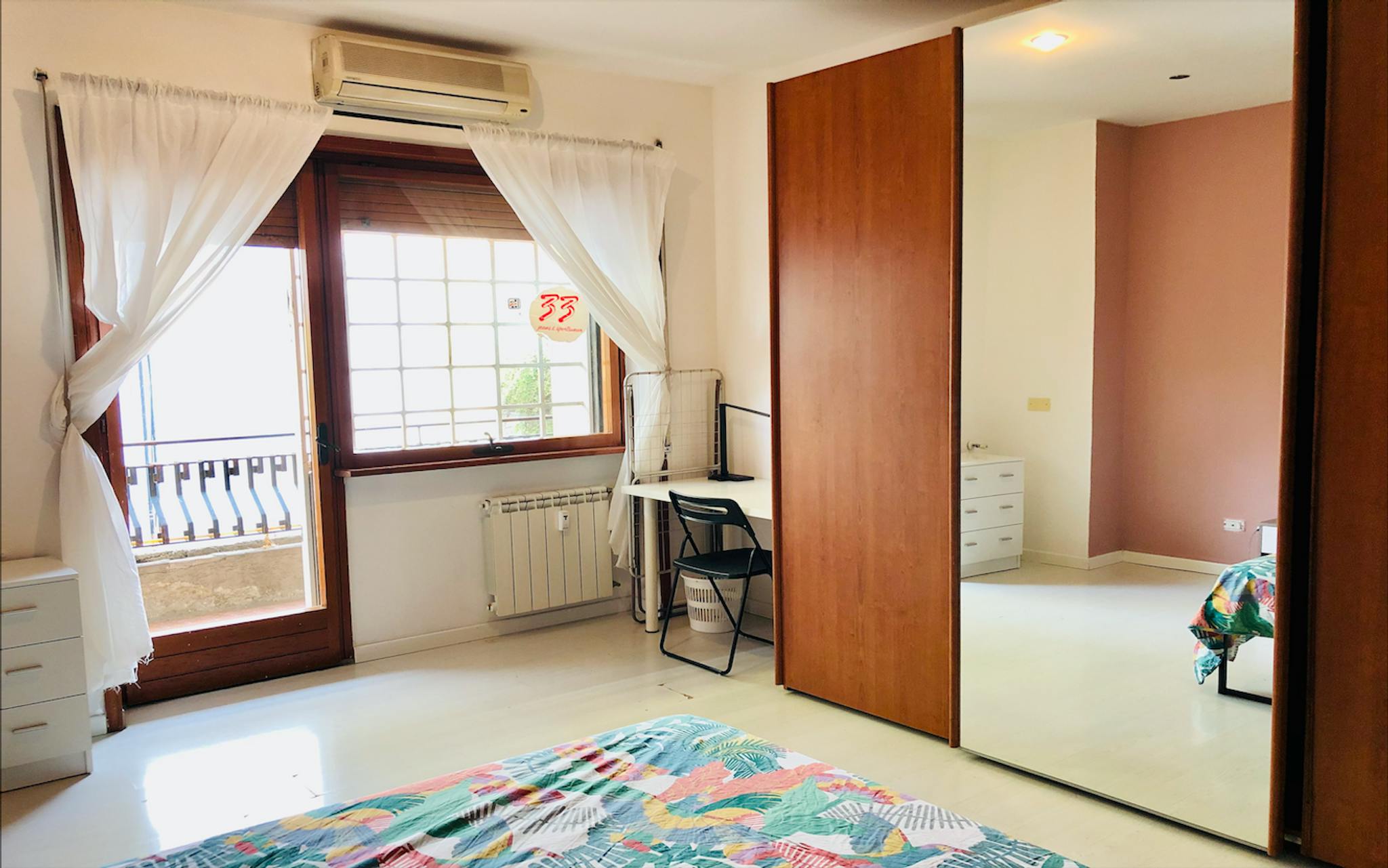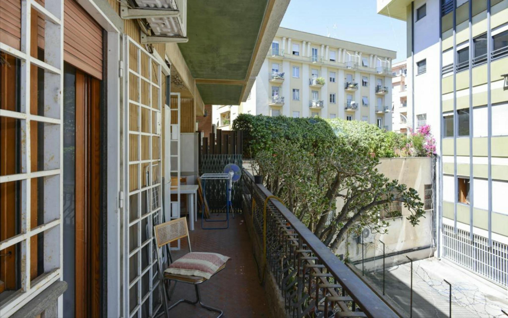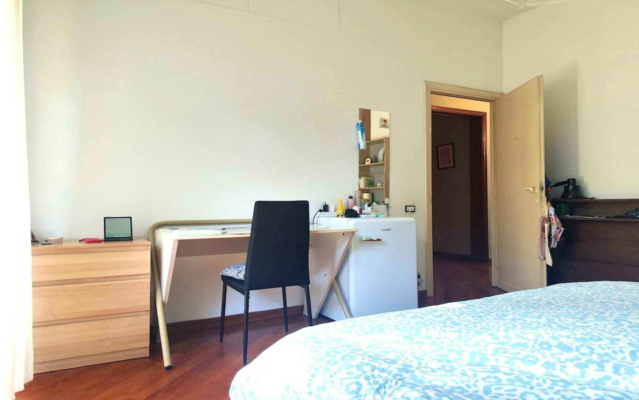 Large room with double bed size and private balcony for rent in a 5 (hidden)/young workers apartment with 2 bathrooms in Piazza Bologna, near La Sapienza University. The apartment is on the 2nd floor with lift, it is 4 minutes walking far from Pia...