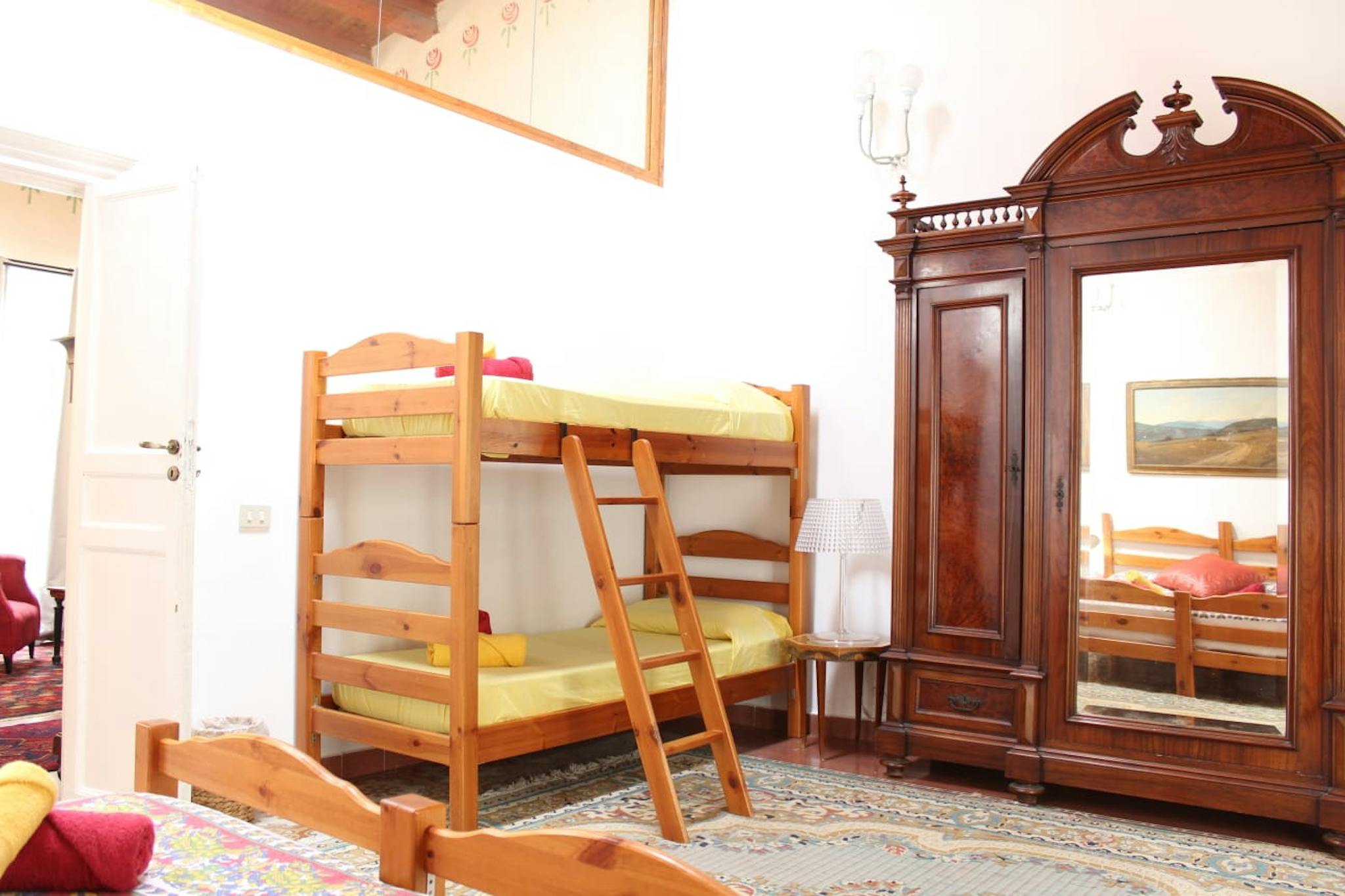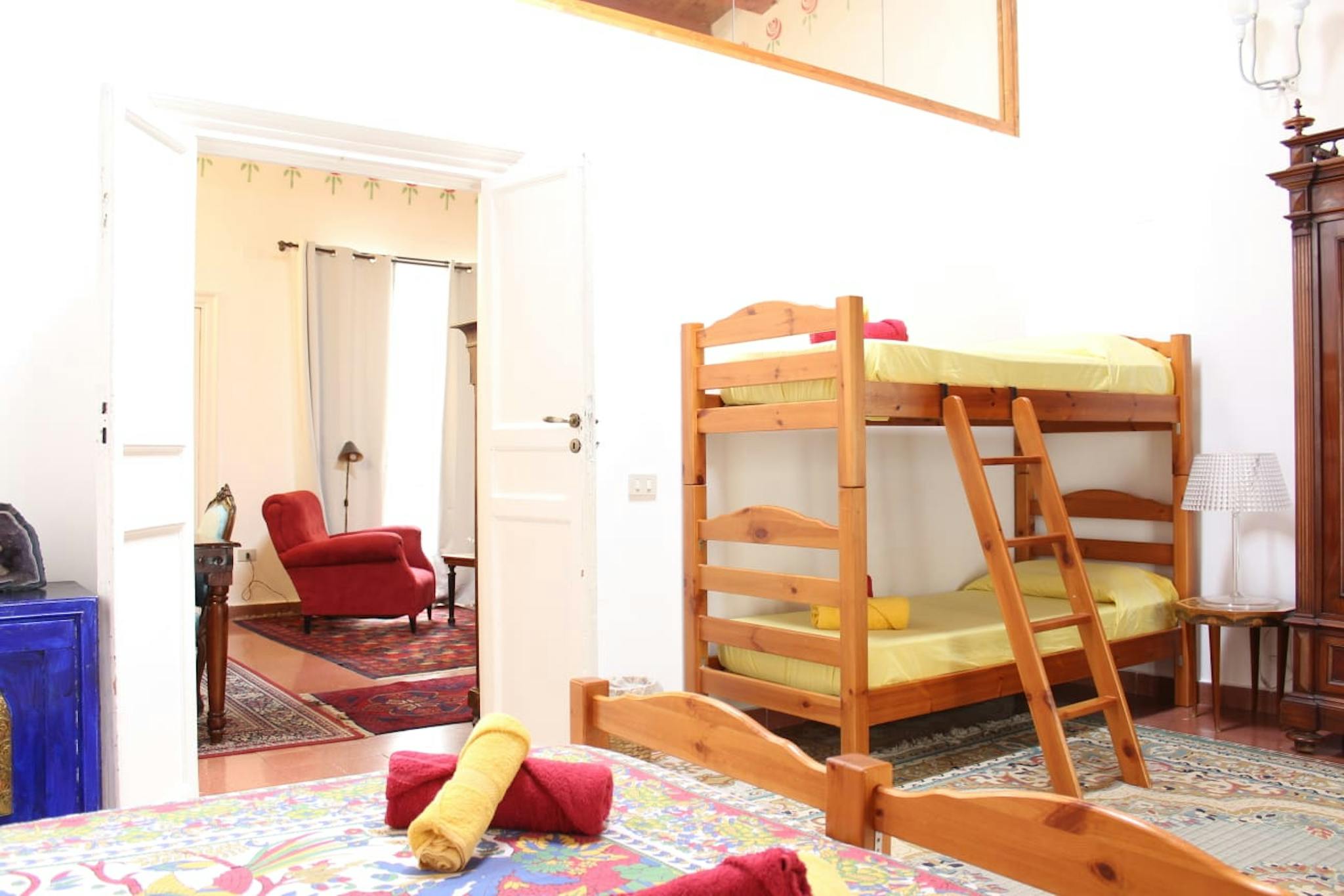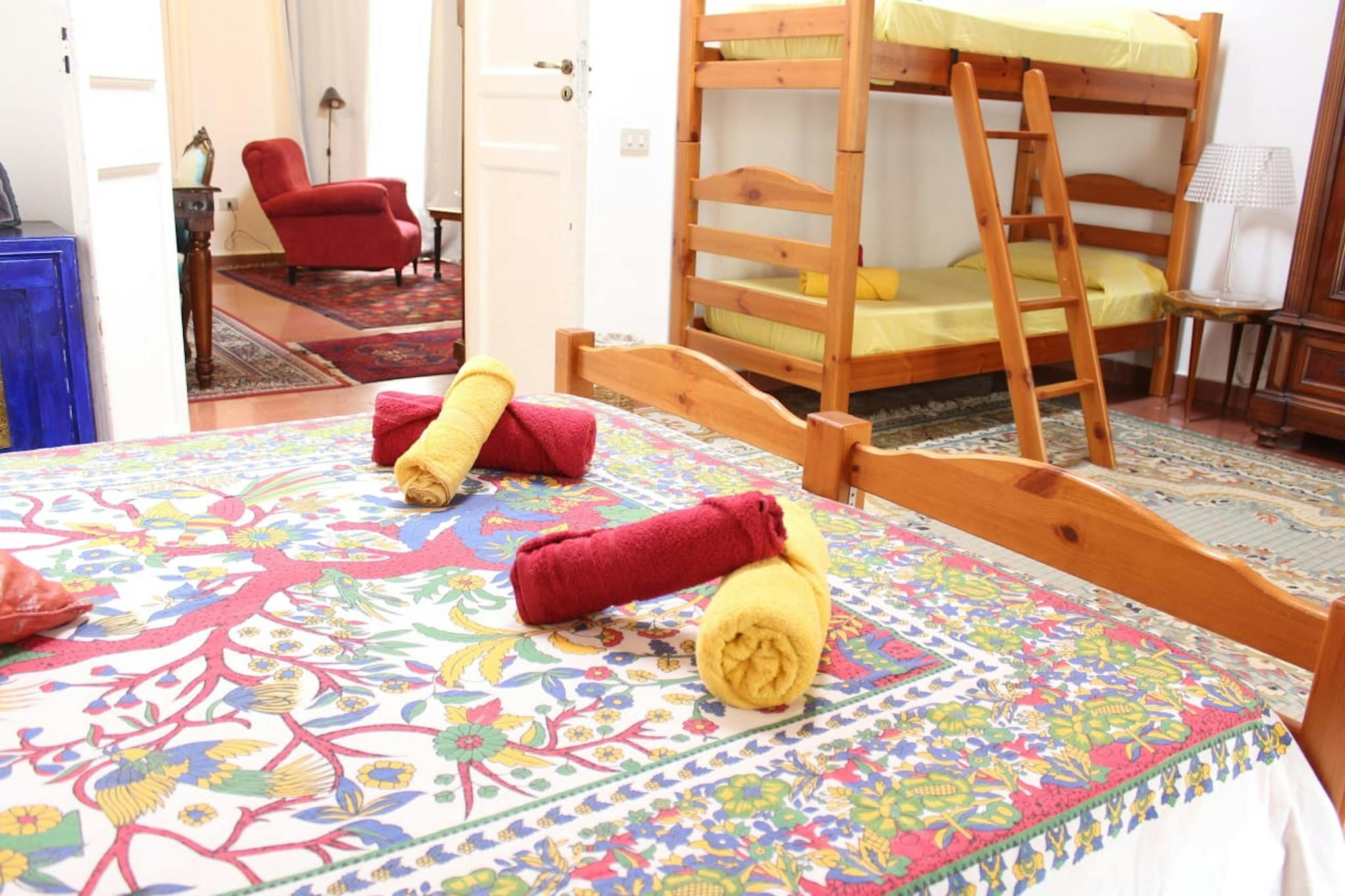 Hello there, I am renting a room in Florence! It has a double bed (or two singles), plus a single bed, bedside tables, open wardrobe, desk, flat screen satellite TV, mini bar, safe, electric kettle with coffee and tea, suitcase rest, air conditio...