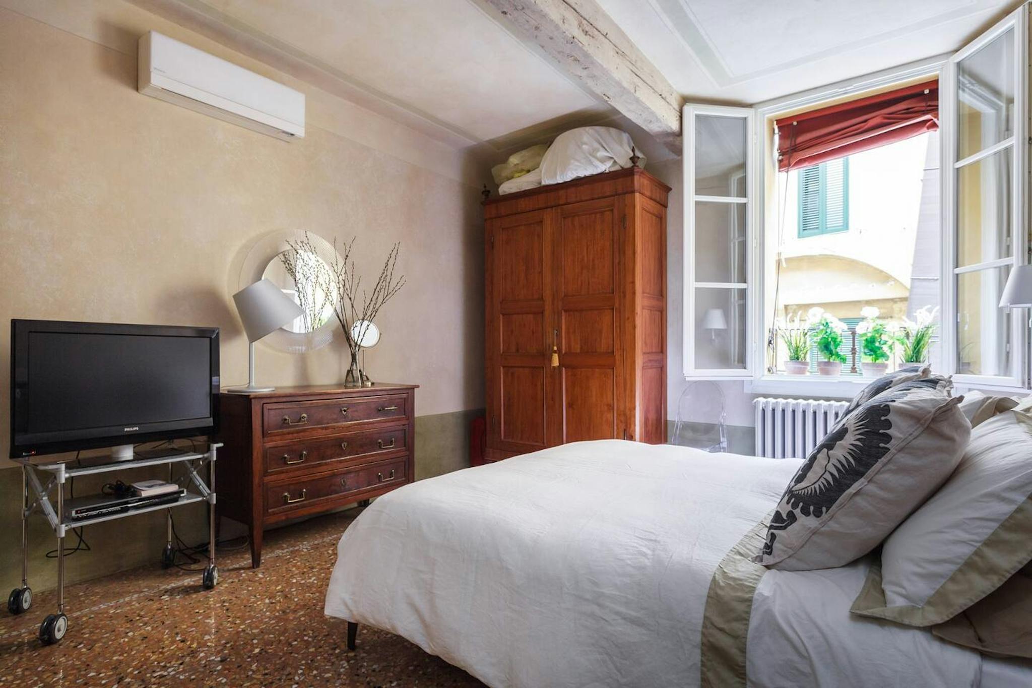Beautiful apartment with fine finishes with a small terrace overlooking Piazza Maggiore. Equipped with a double bedroom, spacious lounge with sofas and TV, audio system with CD, equipped kitchen, bathroom with marble walls and complete with everyt...