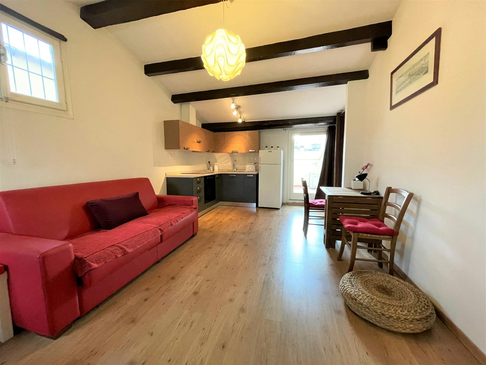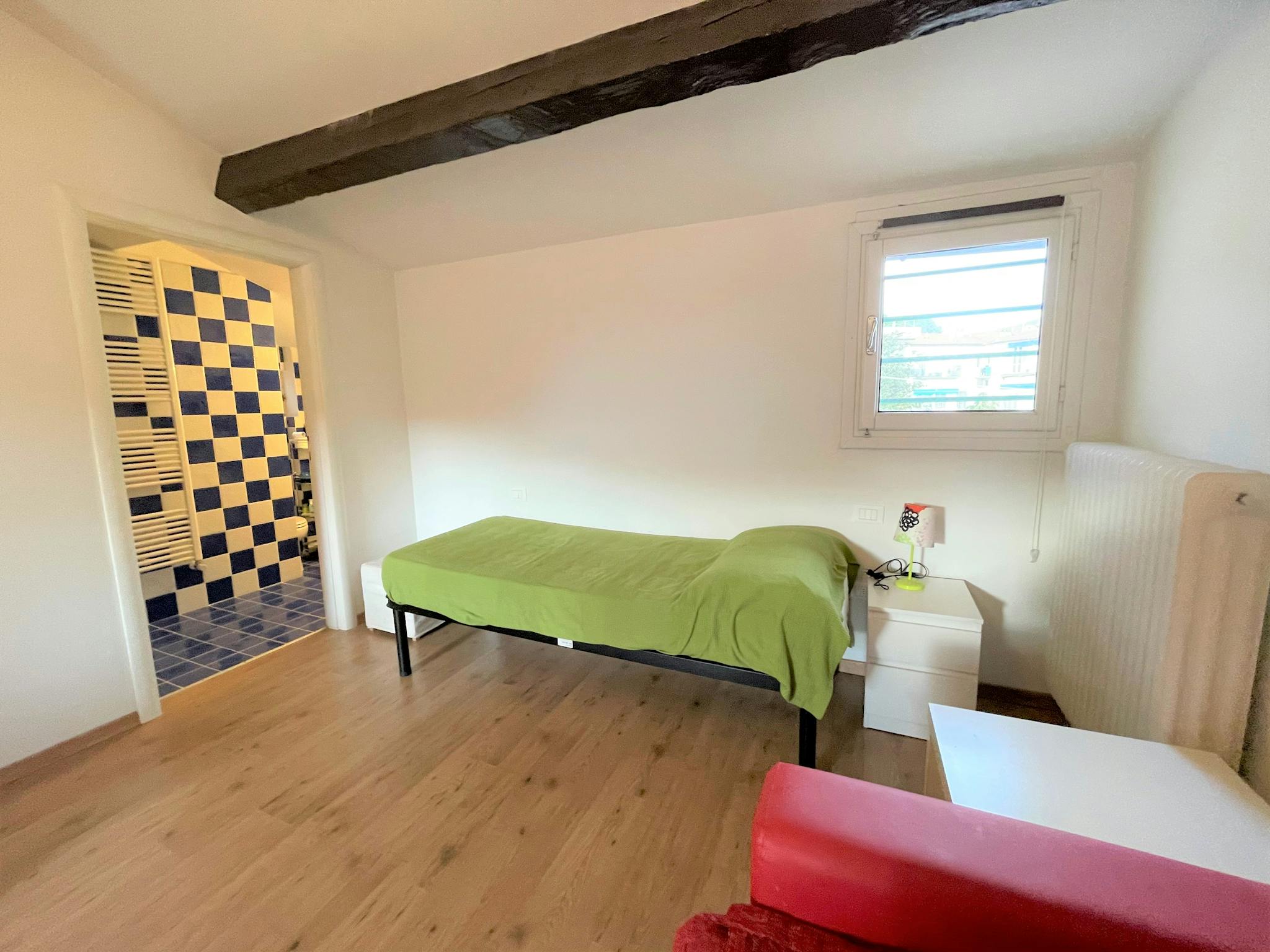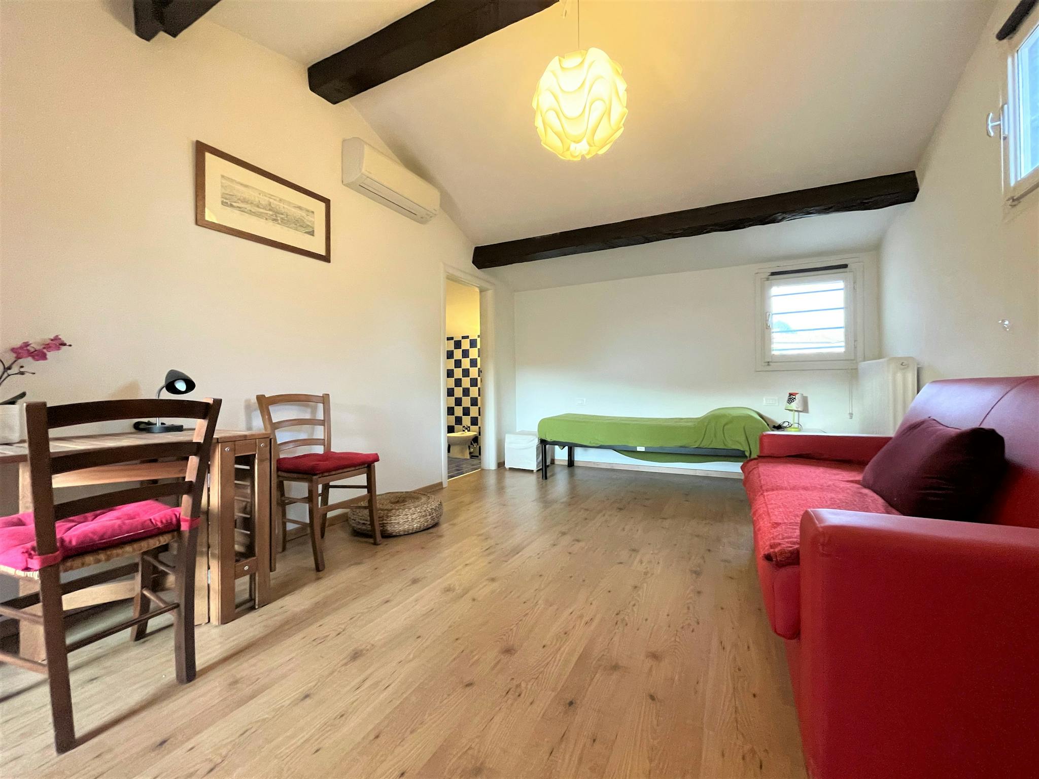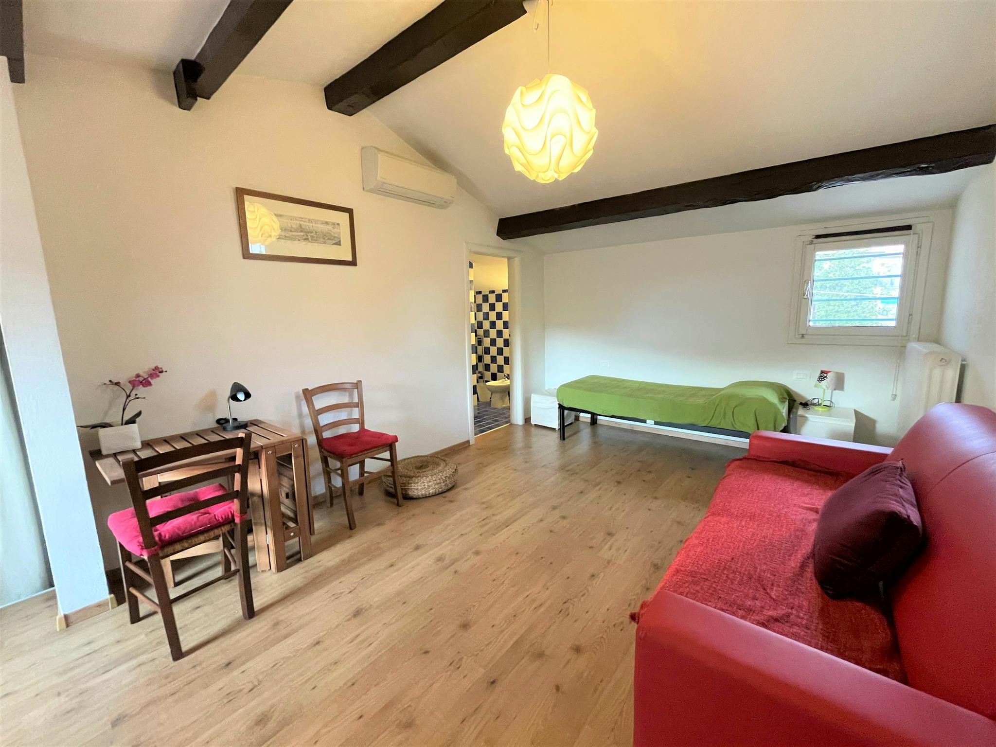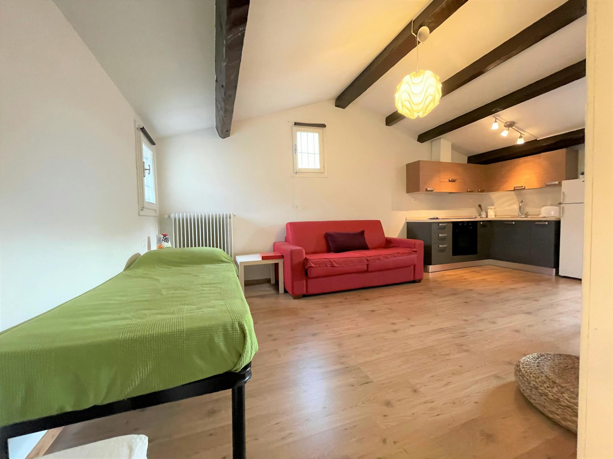 Spacious, bright and comfortable single-room apartment, composed of a single bed, a sofa, table with chairs, a small walk-in closet. The Apartment is situated at the second floor, it has a private bathroom with a shower, a totally equipped kitche...