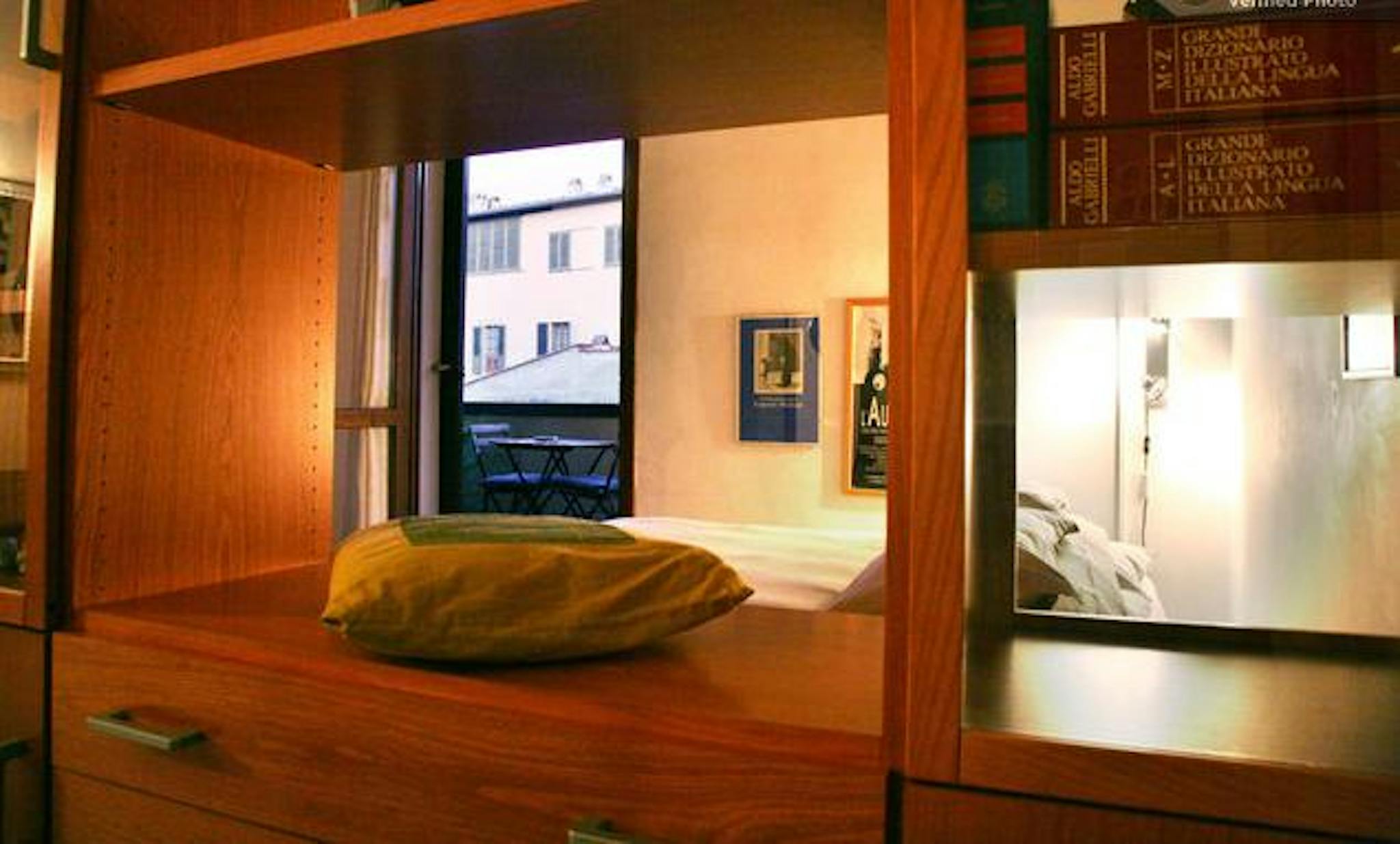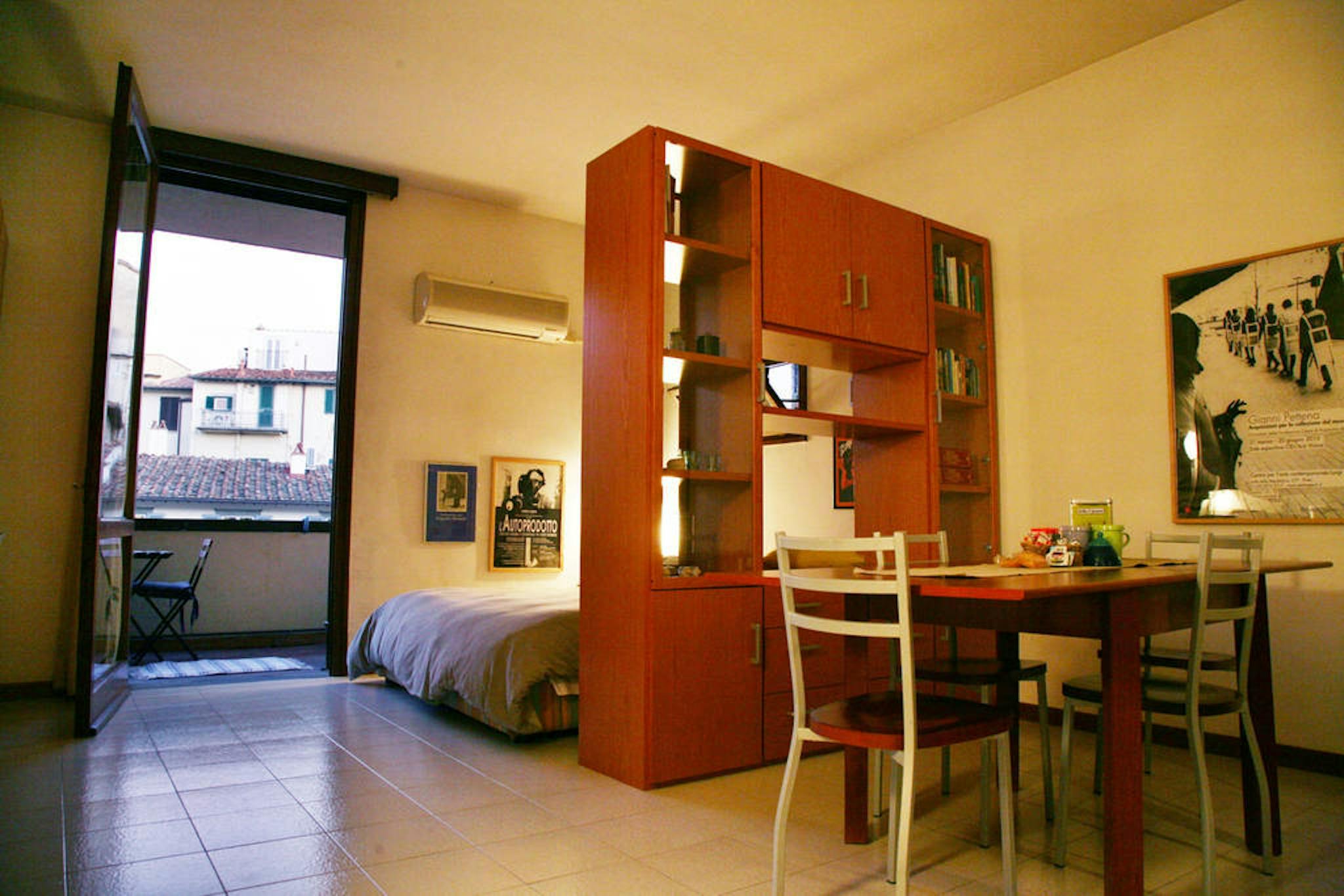 Luminoso ampio monolocale nel centro storico di Firenze, a 50 metri da Piazza Duomo. L'ampio balcone con magnifica vista sulla cupola del Brunelleschi si affaccia su un silenzioso cortile interno.Letto matrimomiale, zona cucina, condizionatore. Sp...