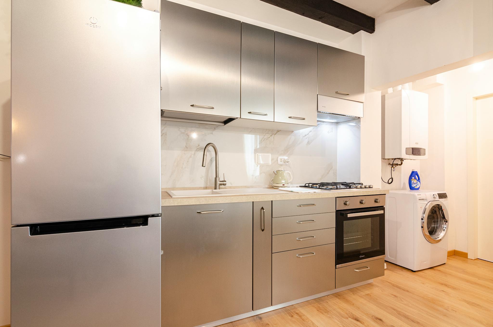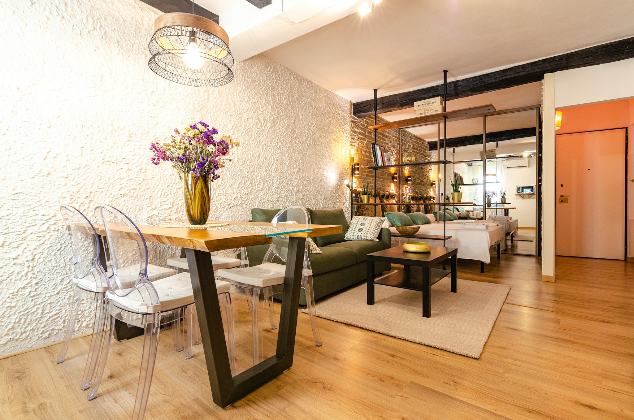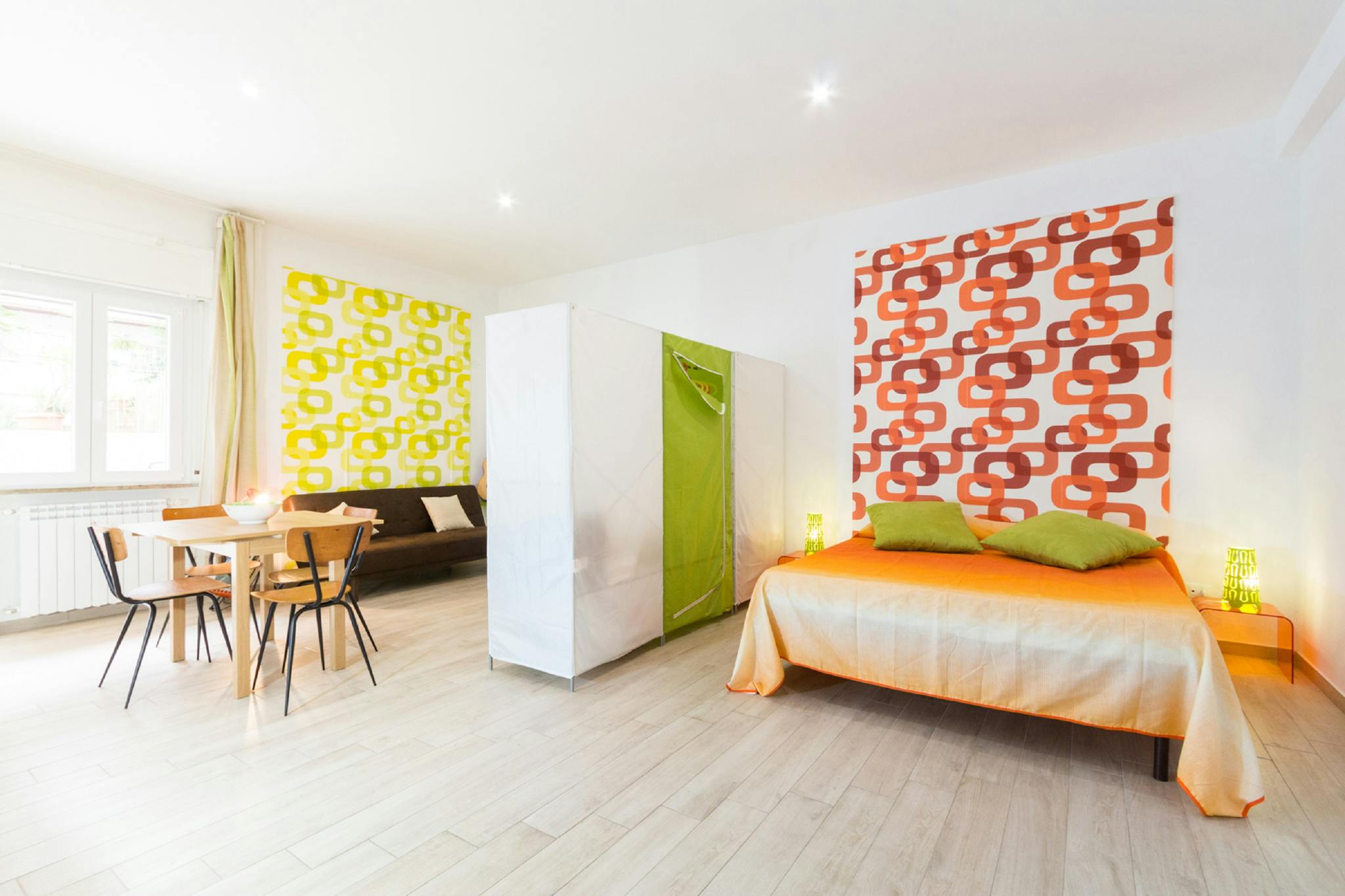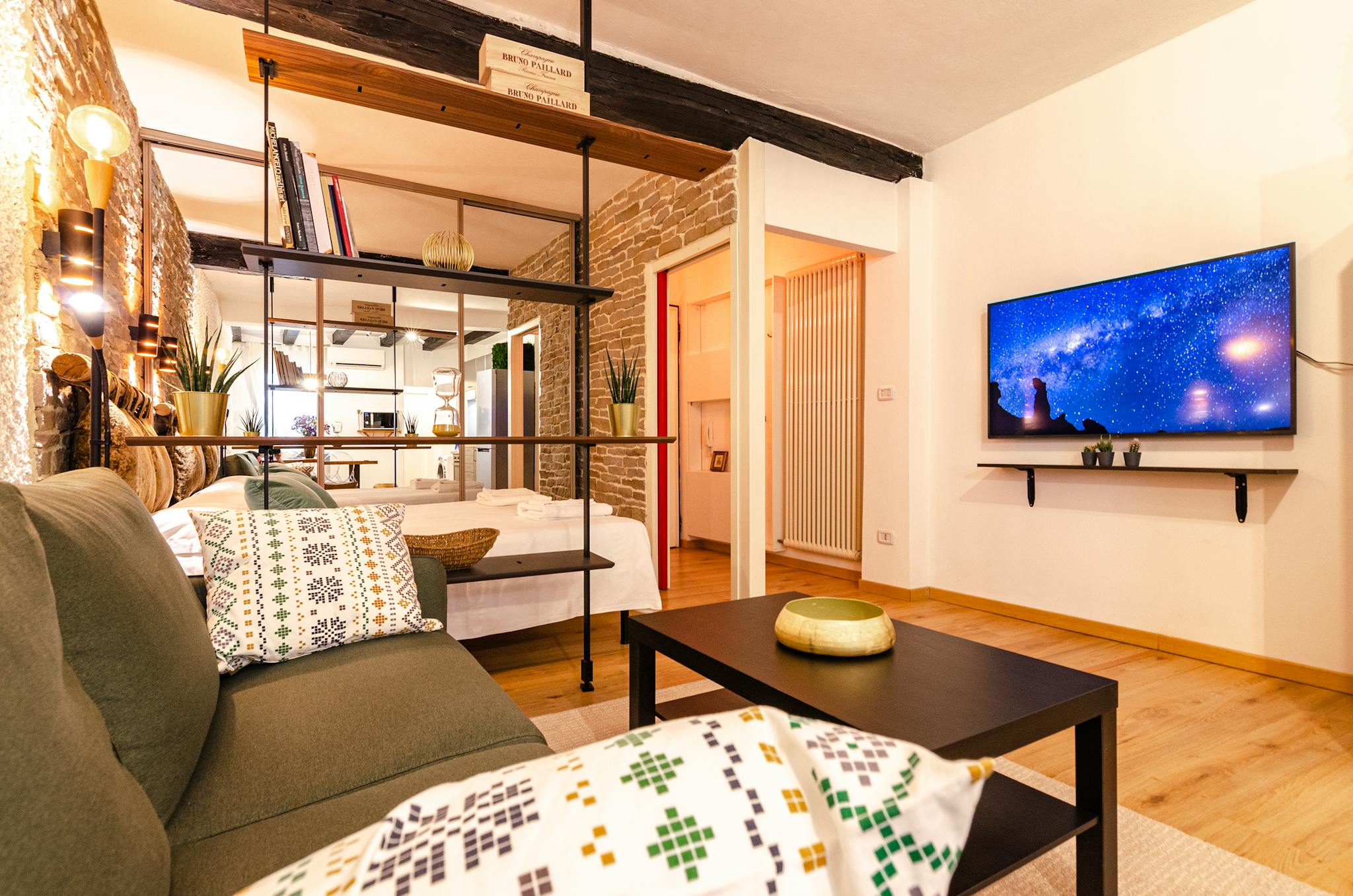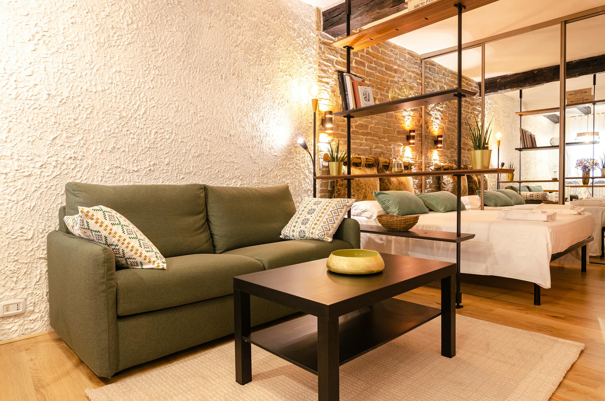 Cozy studio apartment in a strategic position in the historic center of Bologna. Equipped with sleeping area with double bed and large walk-in closet, double sofa bed, 52 "HD Smart TV, fully equipped kitchen and dining / work table, washing machin...