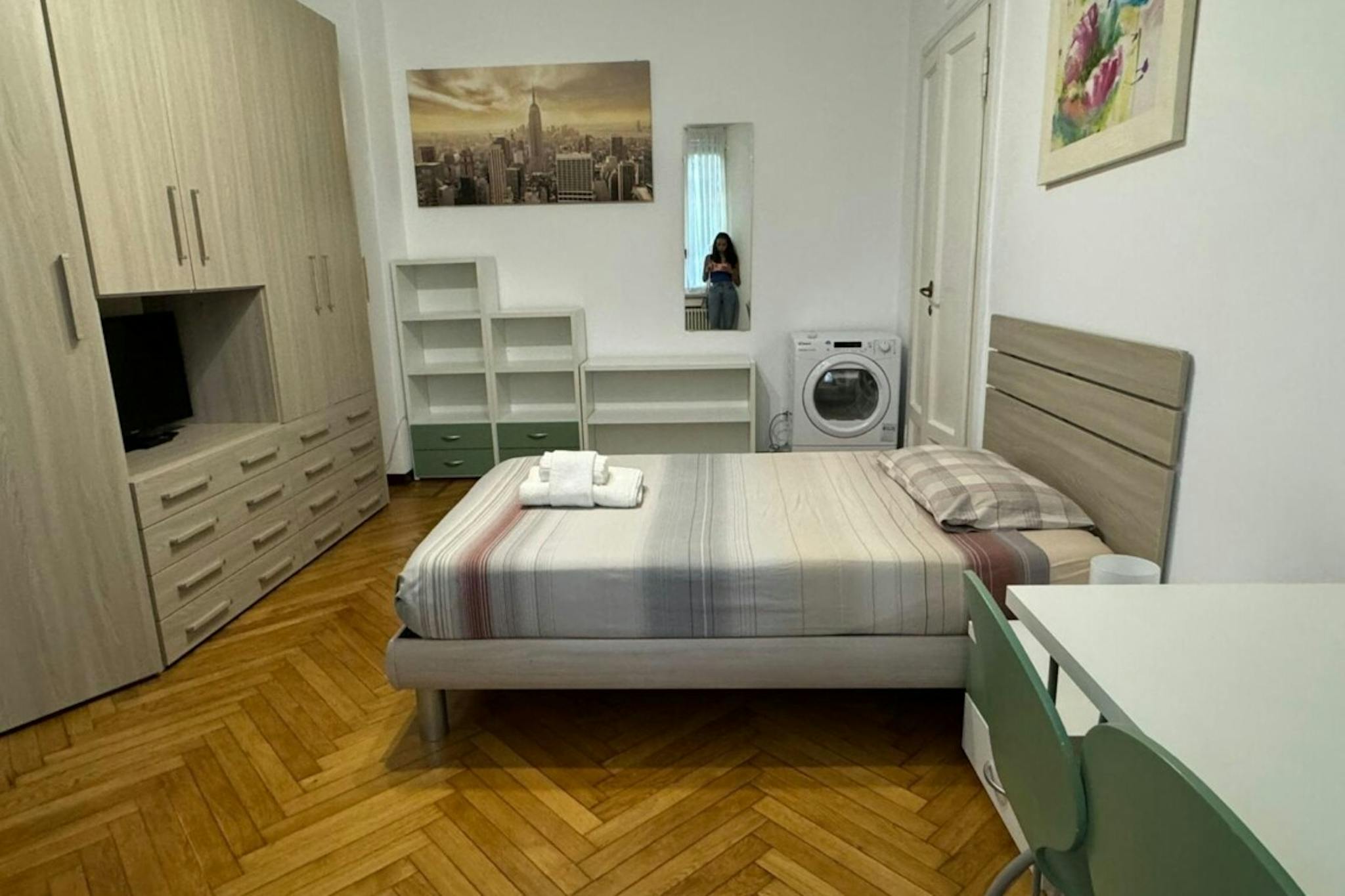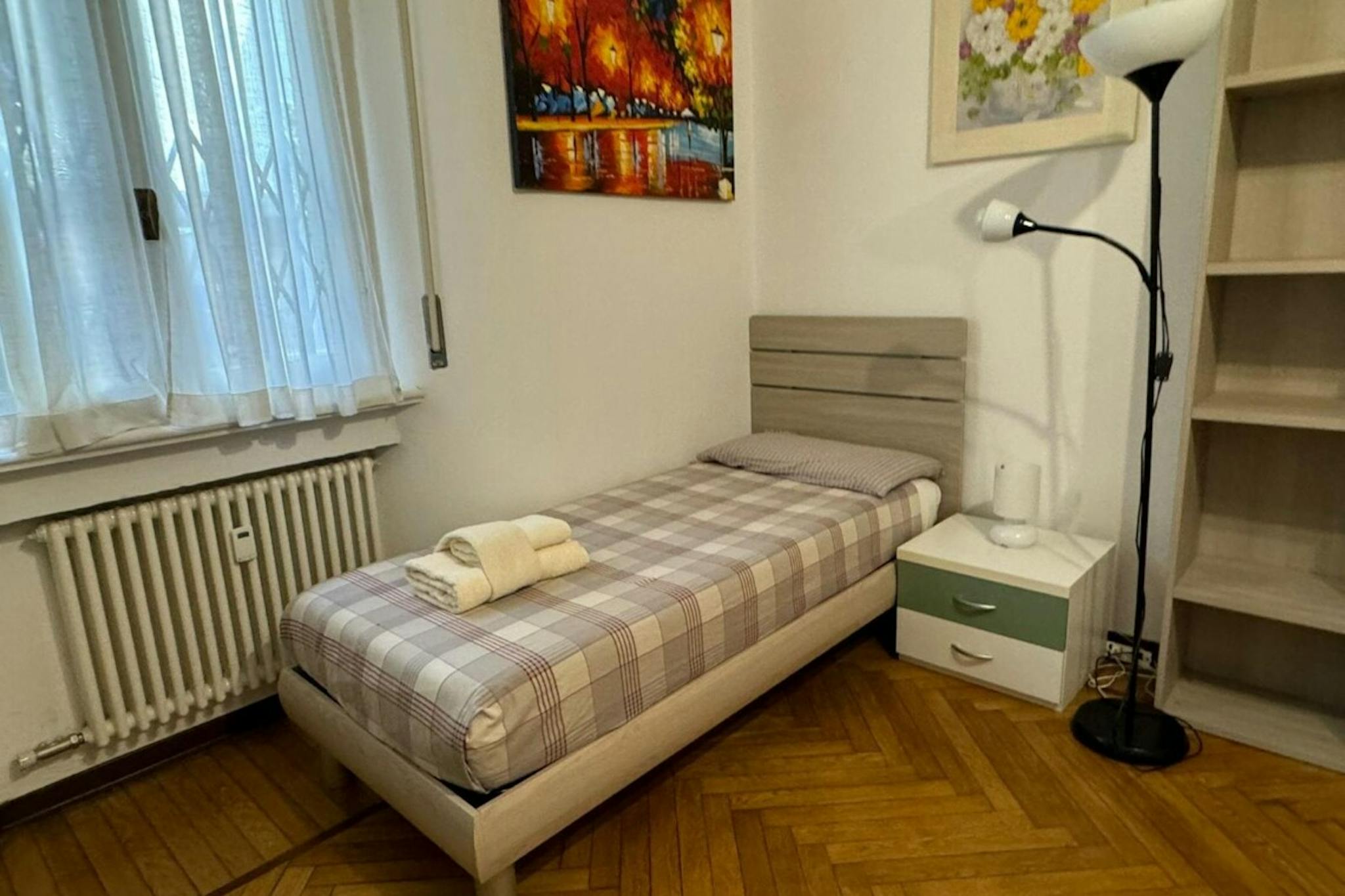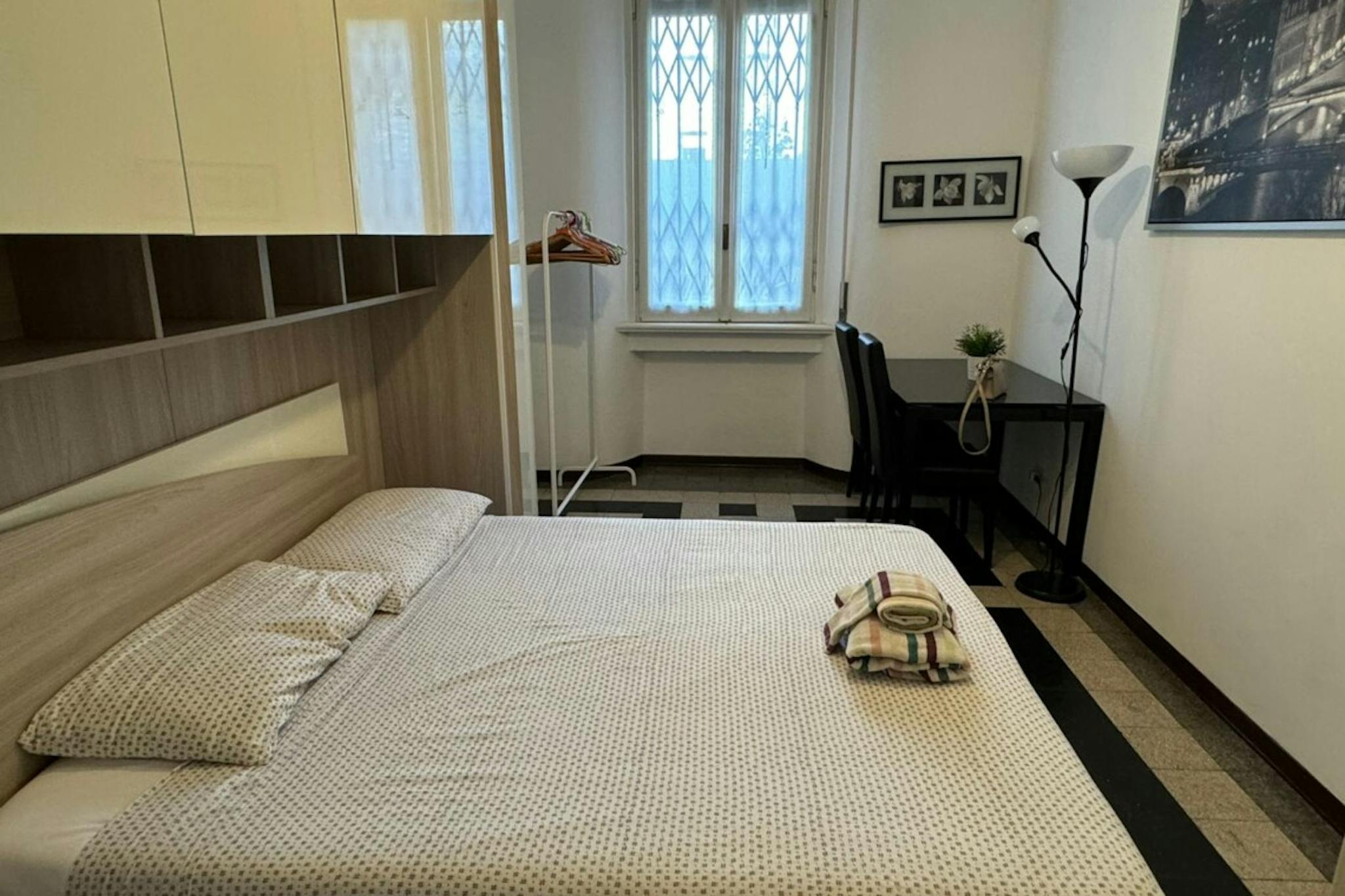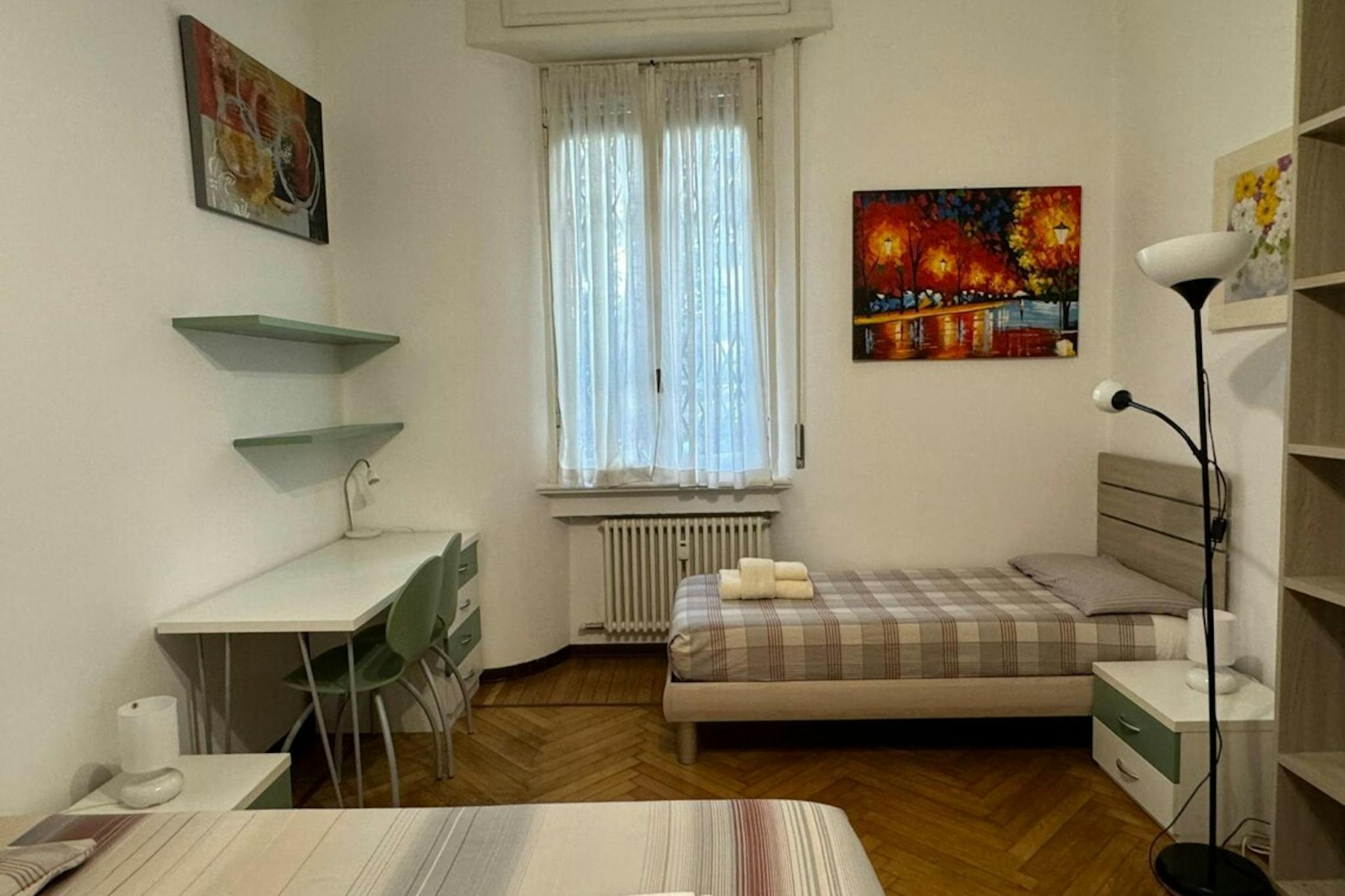 Apartment Description Two-bedroom apartment in Milan, recently renovated and fully furnished with modern furniture and wooden flooring. The apartment opens onto an entrance hall. On the right, there is a spacious bedroom furnished with a single b...