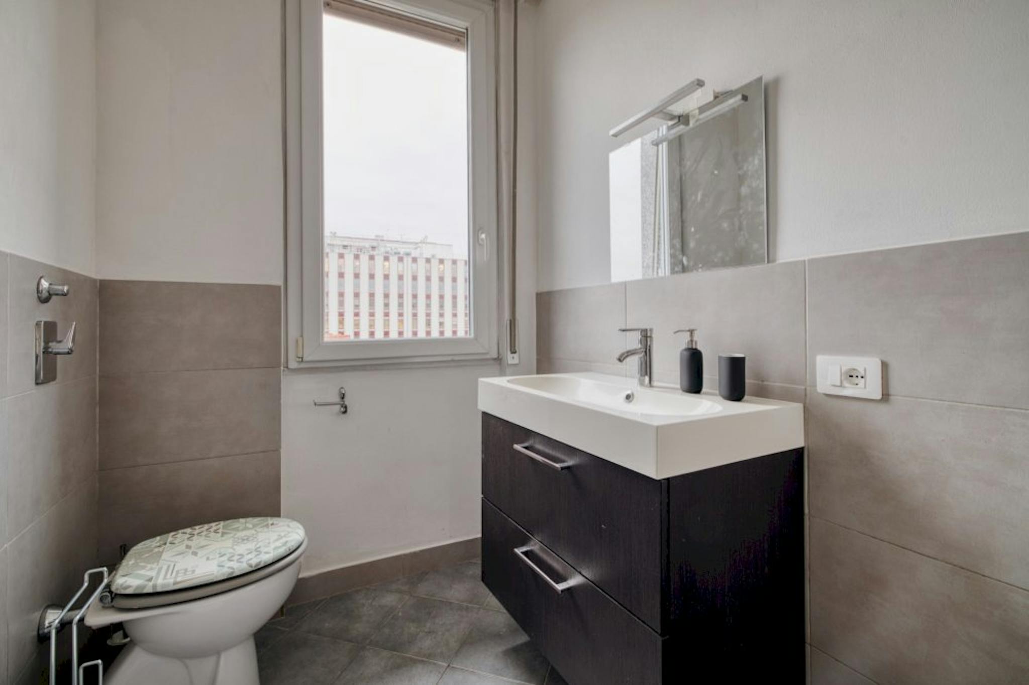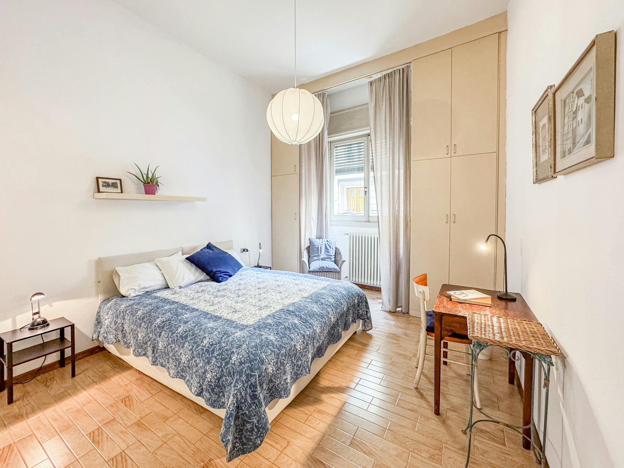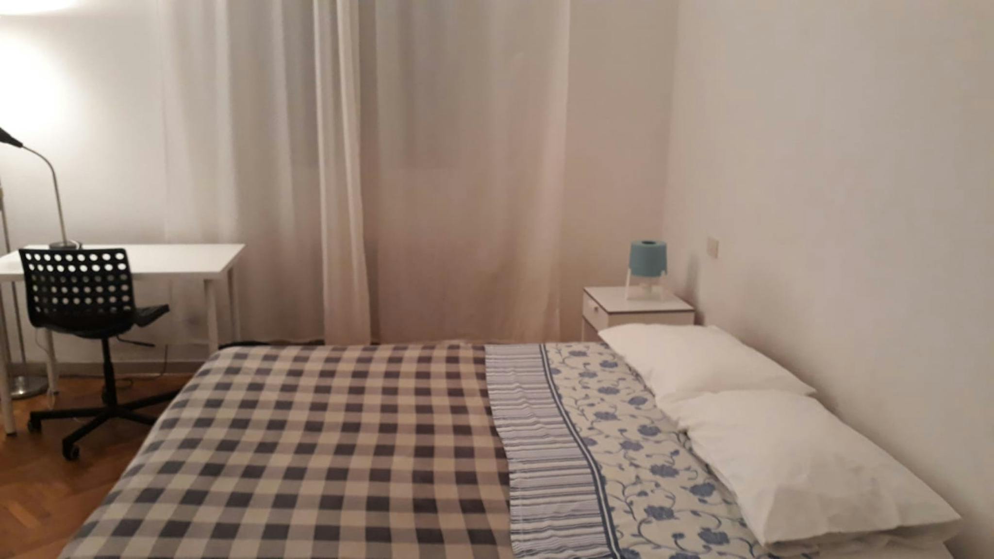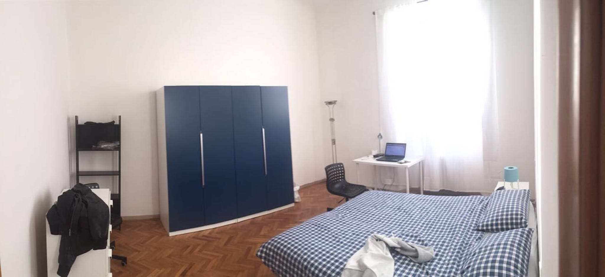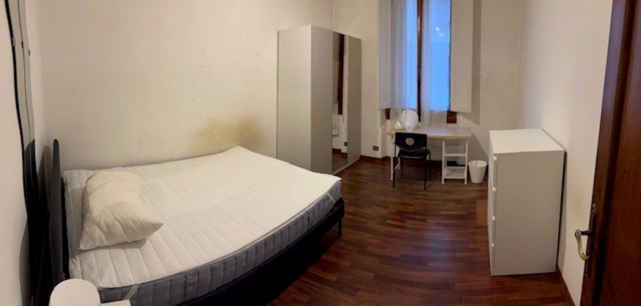 The room is large and really bright having a large window. With a king bed (or divided in two single), double wardrobe and big drawer The flat is composed by 5 single rooms with two bathrooms one for male one for female The apartment has a washi...