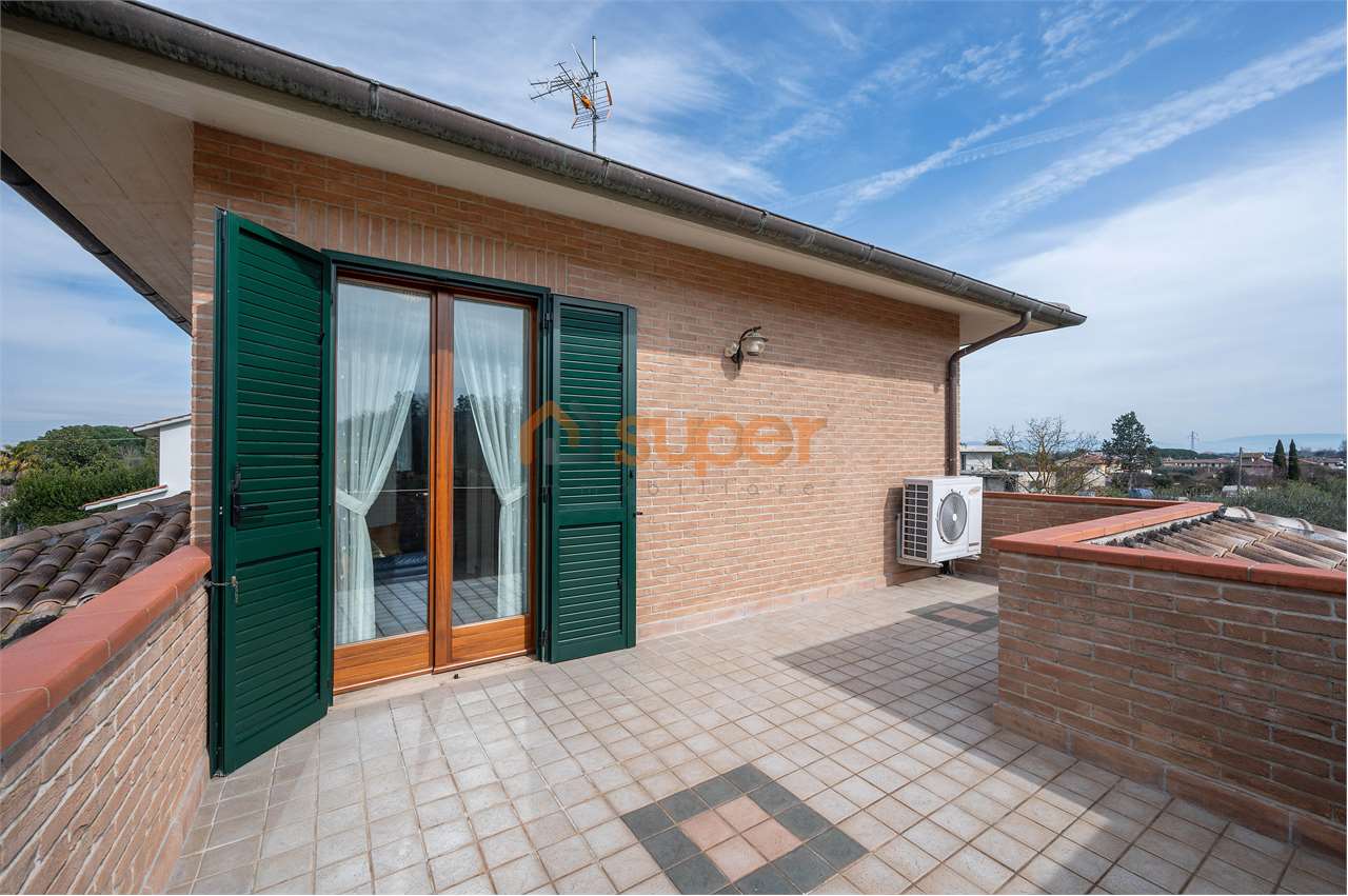 Nelle immediate vicinanza di Castiglione del Lago, Villa di recente costruzione con ampio terreno di circa 1100 mq. In posizione pianeggiante, la villa gode di un invidiabile tranquillità e privacy con un bellissimo panorama sulla campagna circost...