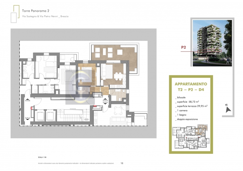 Esclusivo bilocale tipologia D4 disponibile al secondo piano con doppia esposizione e terrazza angolare di 30 mq così disposto luminoso soggiorno con zona cucina e affaccio sulla terrazza, ripostiglio, camera e bagno finestrato. Le finiture sono p...