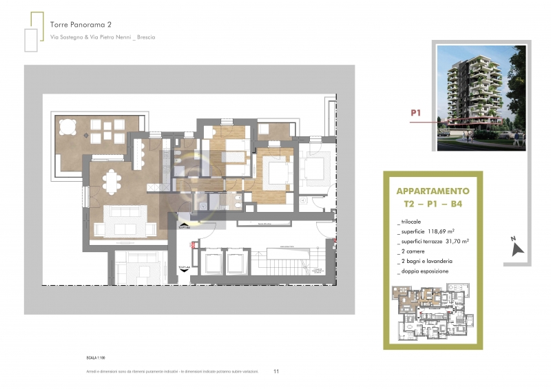 Esclusivo trilocale con terrazza al decimo piano con esposizione Nord / Est La tipologia C3 è così disposta: soggiorno con angolo cottura e terrazza, disimpegno, 2 camere di cui una matrimoniale e una singola e due bagni di cui uno finestrato, pos...