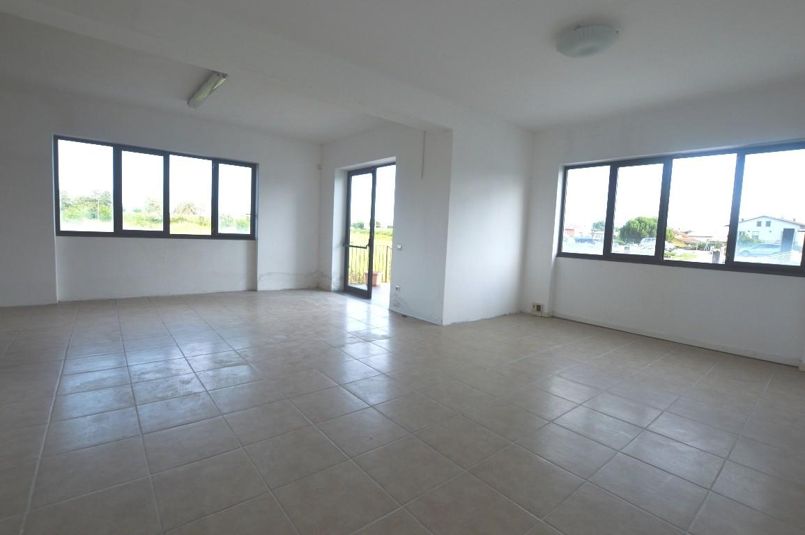 SAN MICHELE IN ESCHETO - In complesso commerciale con ampio parcheggio e su strada principale, ampio locale uso ufficio di 110mq totali, posto al P1 ed ultimo e corredato da terrazza di 140mq. Ingresso in ampia sala d'attesa, 5 vani, antibagno e b...