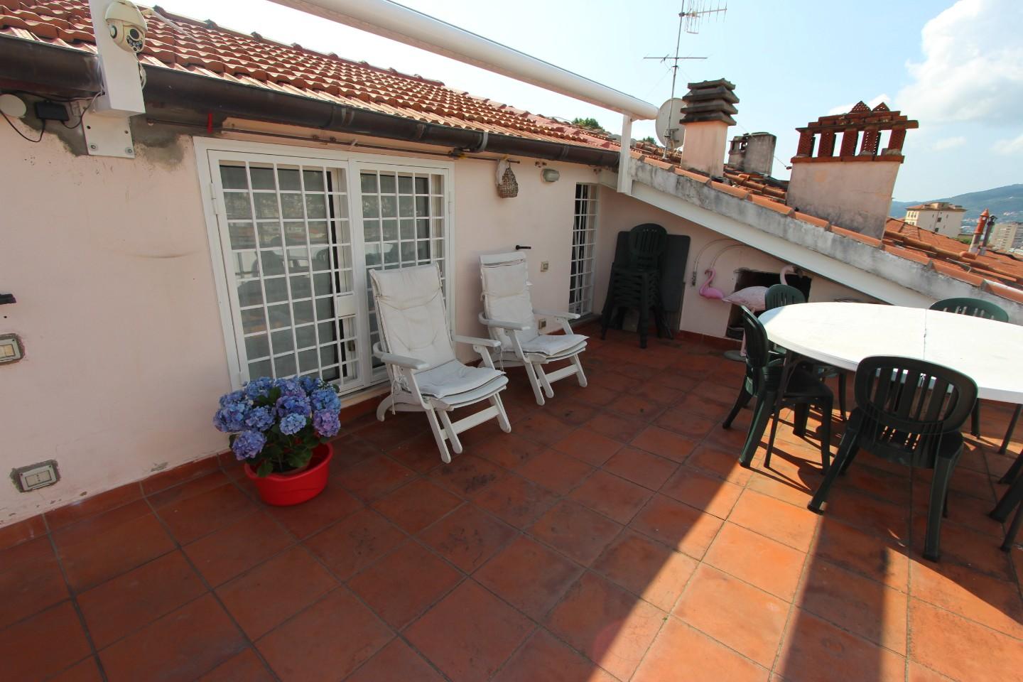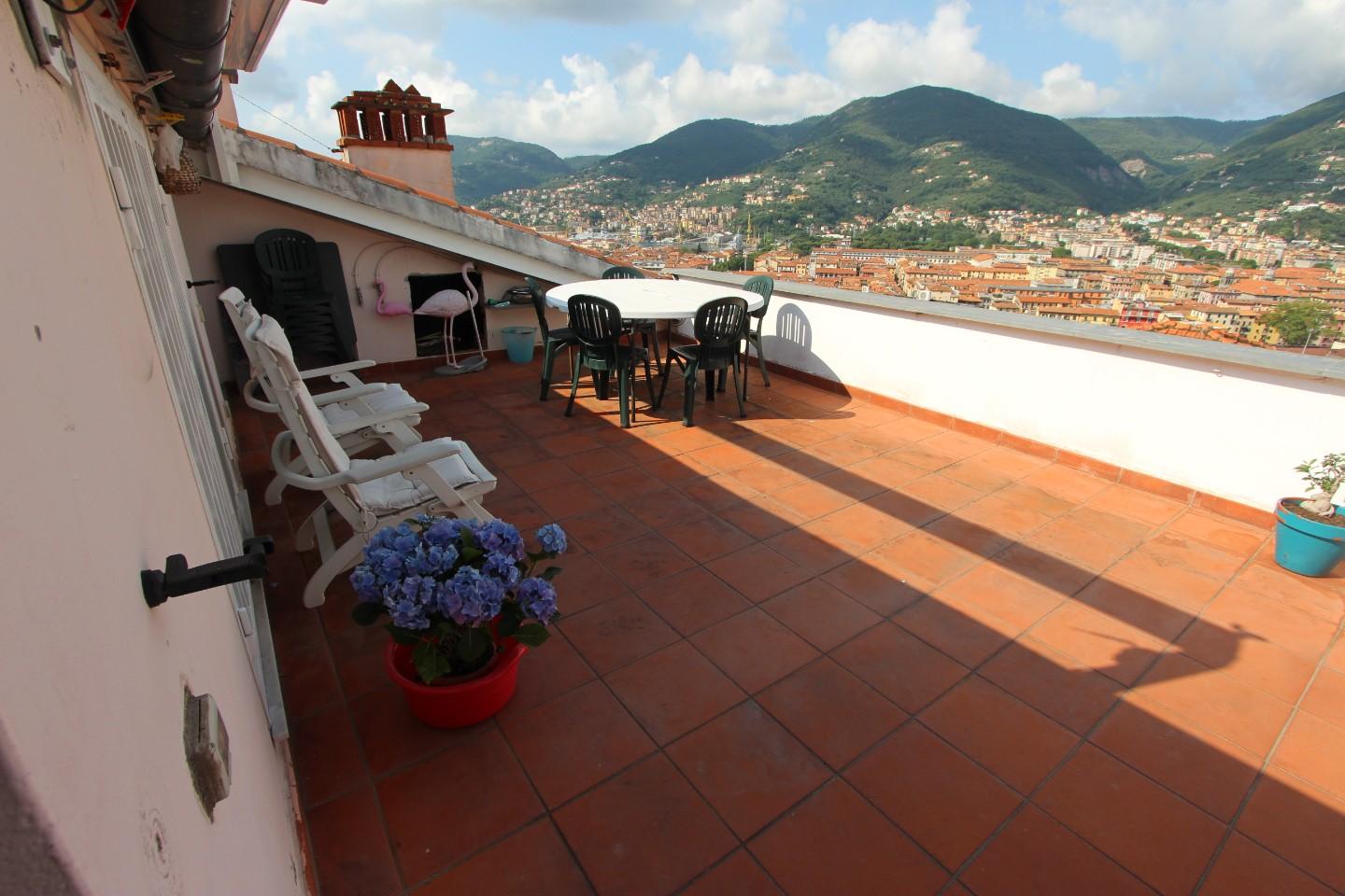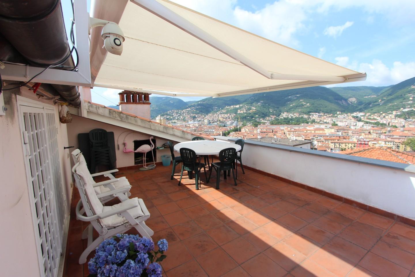 La Spezia Attico in vendita - 9 vani - 194 mq - posto 2°, disposto su 2 livelli, con al piano d'ingresso grande sala con balcone vista città, cucina, 2 camere matrimoniali, cameretta/studio, 2 bagni, accesso al piano superiore tramite comoda sca...