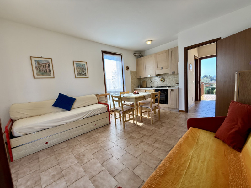 Svegliati con la piscina, addormentati a due passi dal lago. Bilocale in residence con piscina, ideale per soggiorni turistici di 4-6 mesi (contratto transitorio). Fino a 4-5 posti letto: camera matrimoniale + 2 divani letto. Dotato di soggiorno-c...