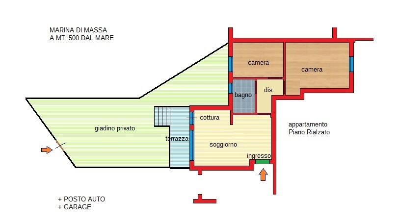 MARINA DI MASSA - A soli 500 metri dal mare in zona riservata e a pochi passi dal centro si vende appartamento posto al piano rialzato con giardino esclusivo. Internamente si compone di ingresso, soggiorno/pranzo con angolo cottura e uscita su te...
