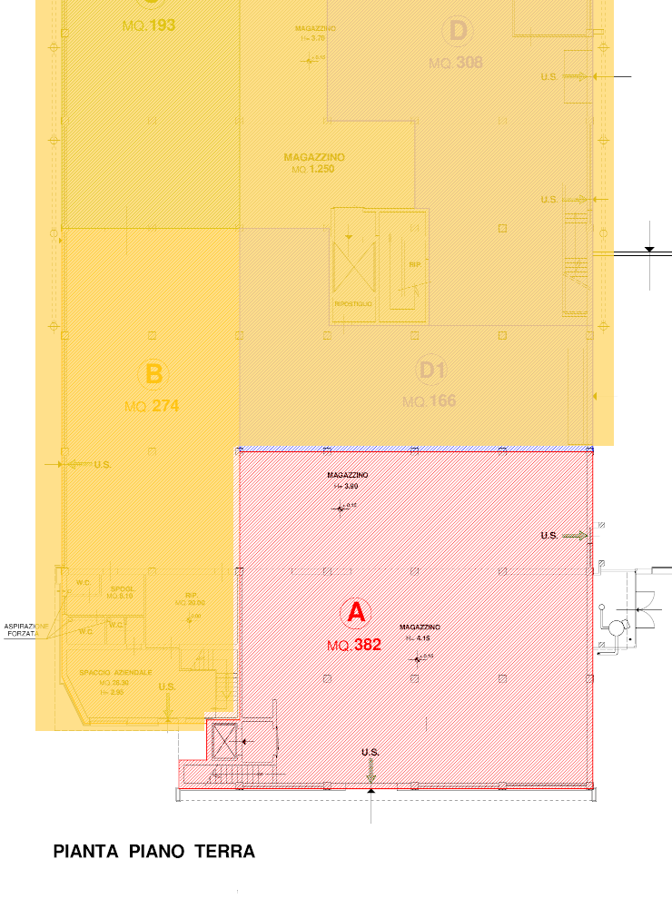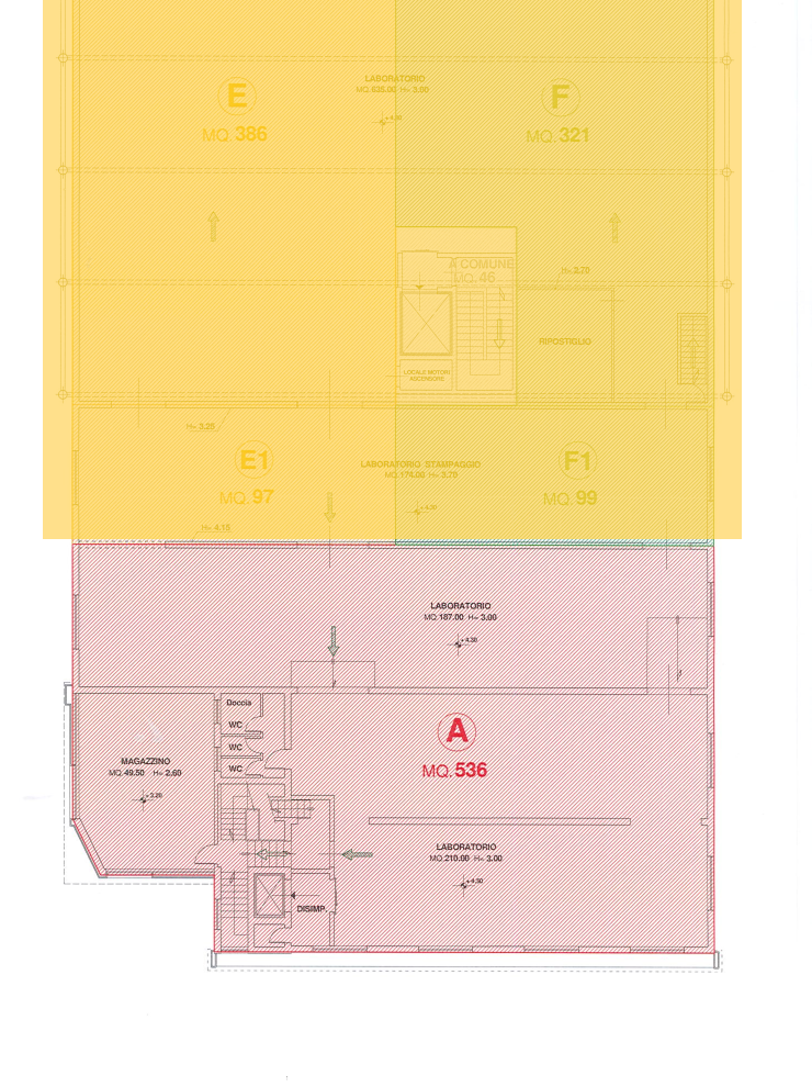 Porzione frontale di un di un più ampio capannone artigianale/magazzino, a due piani della superficie complessiva di 918 mq. circa. Al piano terre (536 mq. circa) ampi locali laboratorio (altezza 3 metri), magazzino e servizi. Al piano superiore ...