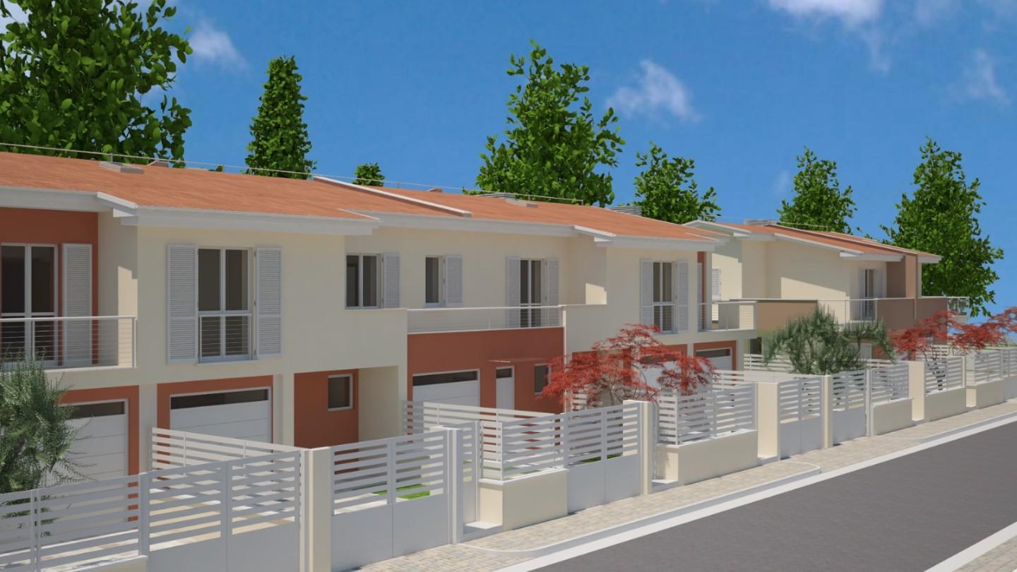 Villetta a schiera di nuova costruzione, disposta su tre livelli e con un ampio giardino. Al piano terra troviamo una cucina spaziosa e un soggiorno luminoso, entrambi con accesso diretto all'esterno, e un bagno. Salendo le scale, si arriva al pri...