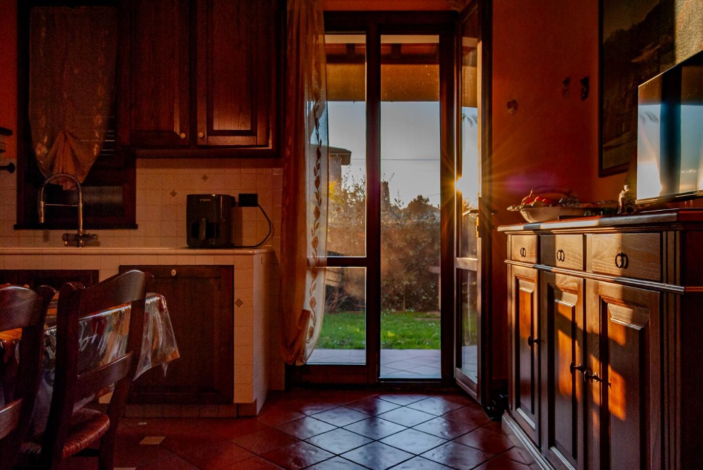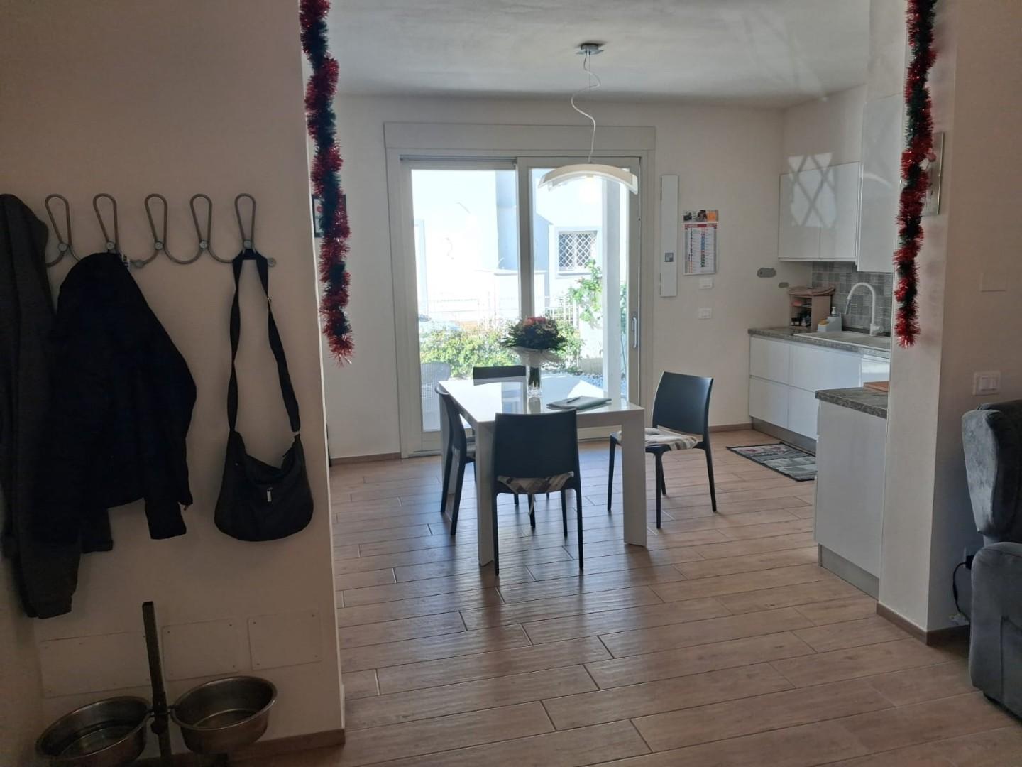 In una zona tranquilla e ben servita, si trova un'elegante villetta a schiera sviluppata su tre livelli. Al piano terra, un soggiorno spazioso e luminoso è collegato a una cucina completa di zona pranzo, dalla quale si accede direttamente al giard...