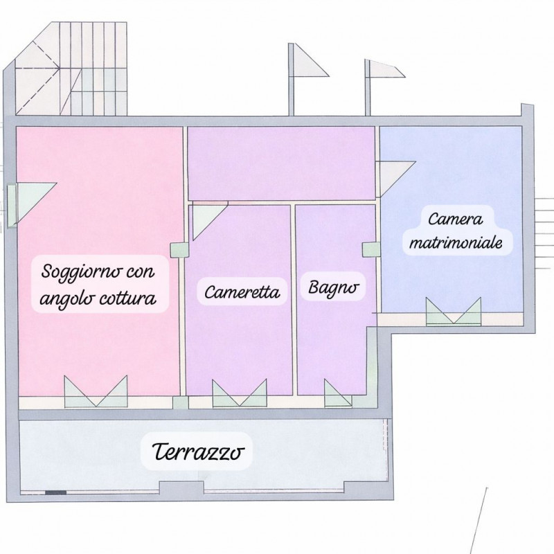 In posizione tranquilla ed in piccolo condominio, al terzo ed ultimo piano senza ascensore, appartamento di circa 96 mq: ingresso, soggiorno, cucina con balcone, caminetto e ripostiglio, due camere matrimoniali, bagno finestrato ed integrato da lo...