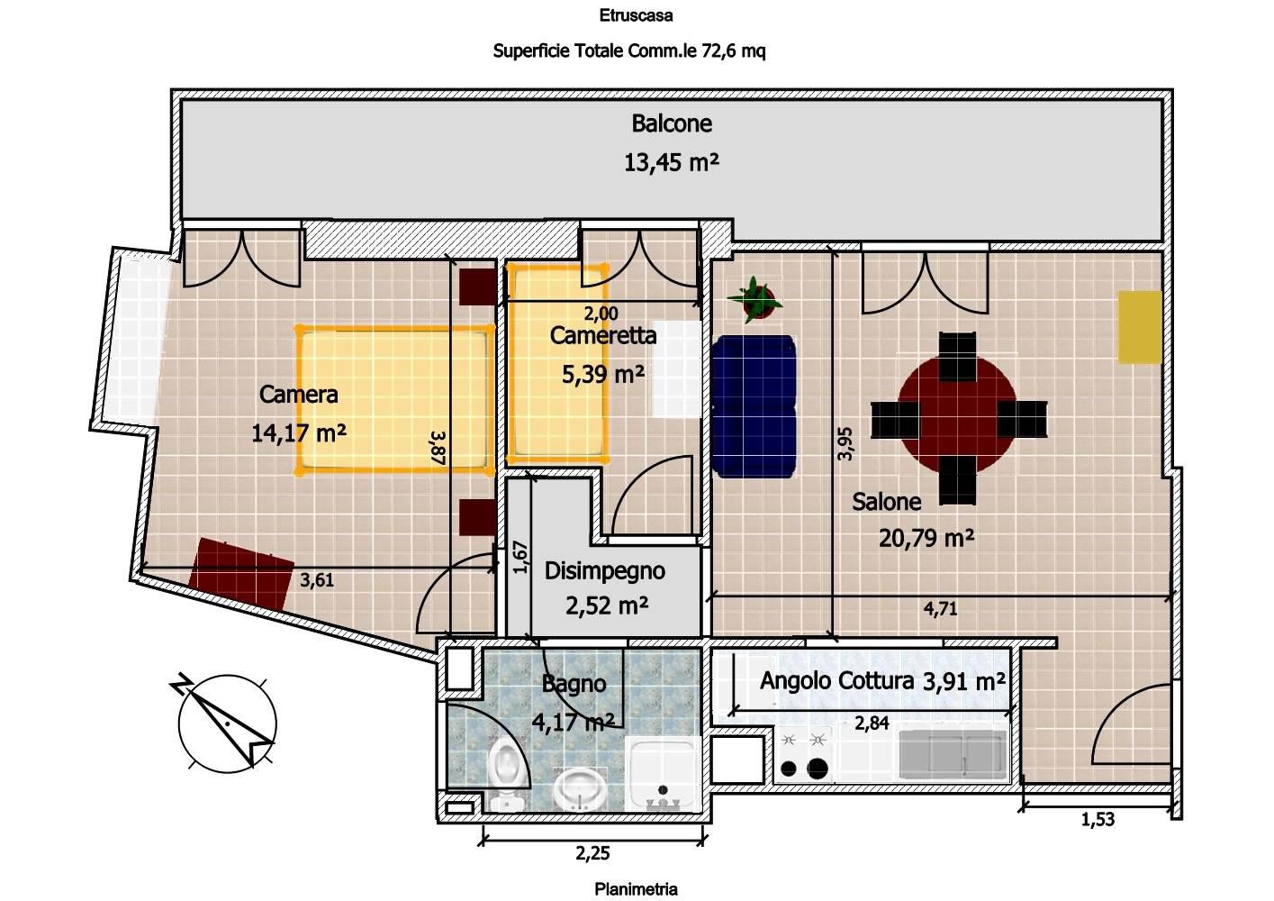 Tarquinia Lido: appartamento di circa 70mq, posto al secondo piano di palazzina dotata di ascensore composto da: salone, angolo cottura, camera matrimoniale, cameretta, bagno, balcone abitabile, posto auto privato. I posti letto sono 5, 1 letto m...