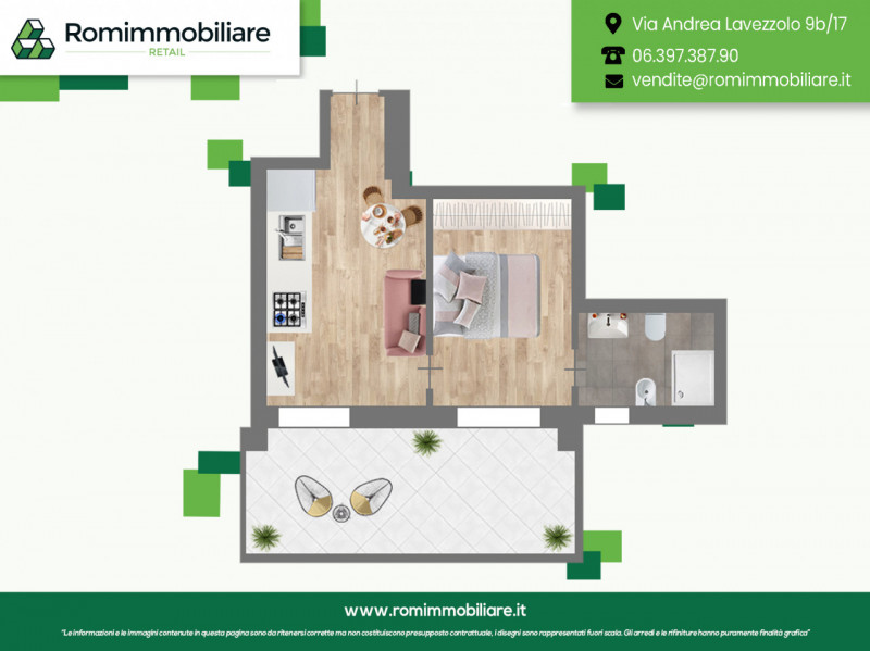 Romimmobiliare propone in vendita in un elegante contesto residenziale dell’Eur Papillo, un monolocale arredato in ottimo stato, con un ampio terrazzo di 14 mq esposto a ovest. L’appartamento, rifinito con parquet, è composto da soggiorno con ang...