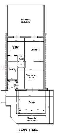 Appartamento è composto da soggiorno, cucina, disimpegno, bagno e una camera. Dispone di uno scoperto sul retro parte pavimentato parte lasciato a verde e di uno scoperto sul fronte completamente pavimentato con una tettoia in legno. La propriet...