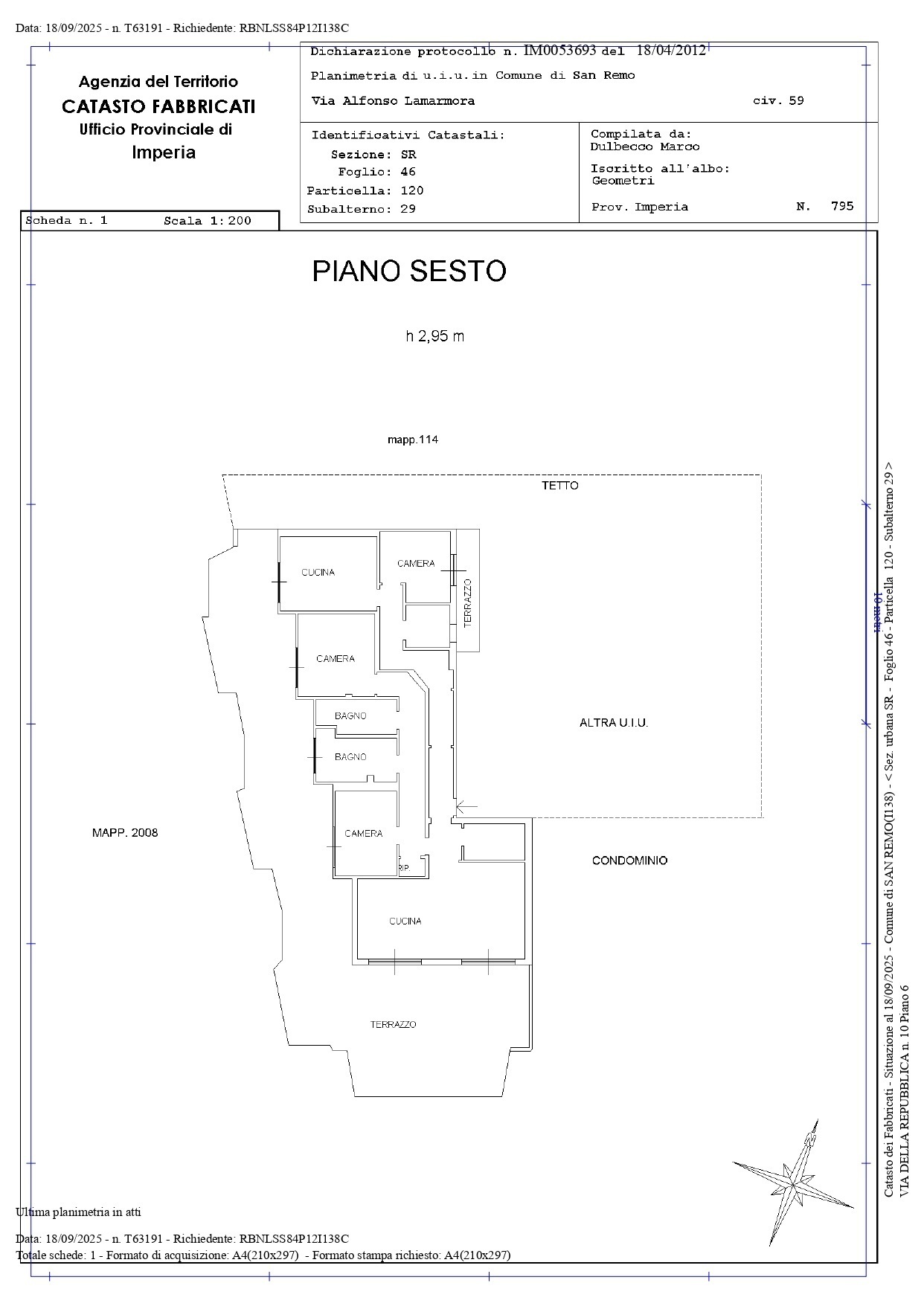Sanremo Zona San Martino civico n. 15 Appartamento posizionato al 5° Piano con ascensore, vista mare, esposto ad angolo , composto da ingresso, due camere da letto matrimoniali vere di cui una con balcone vista mare , salotto con balcone fronte ...