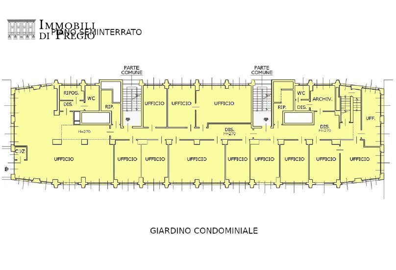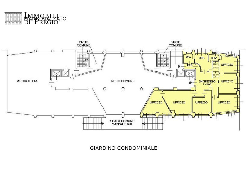 Il piano rialzato è composto da doppio ingresso, ampia sala d'attesa, due grandi uffici open-space, quattro uffici, una sala riunioni, un locale rack e quattro bagni. Il piano seminterrato, collegato internamente da due bellissimi vani scala, è co...