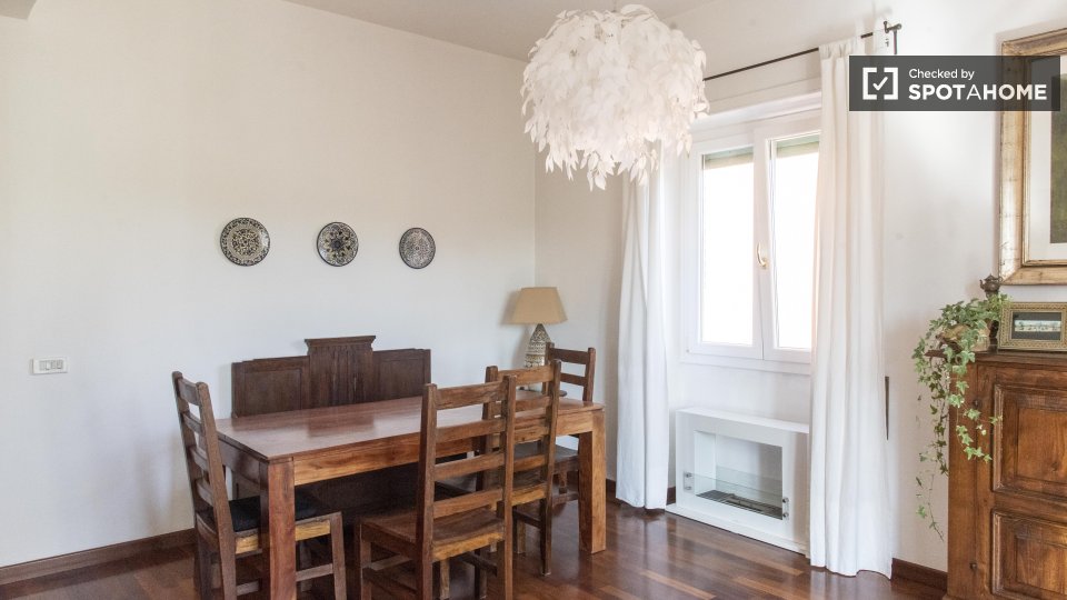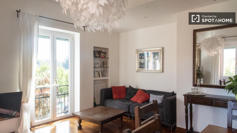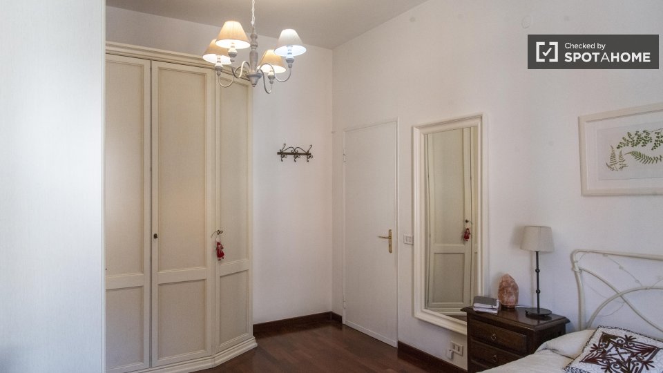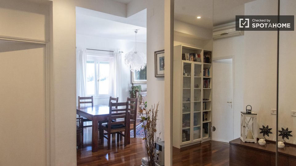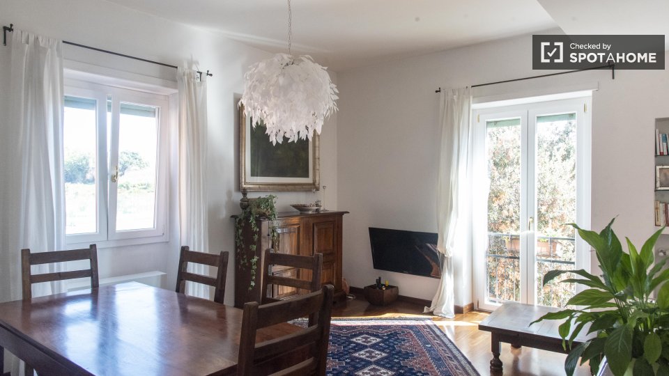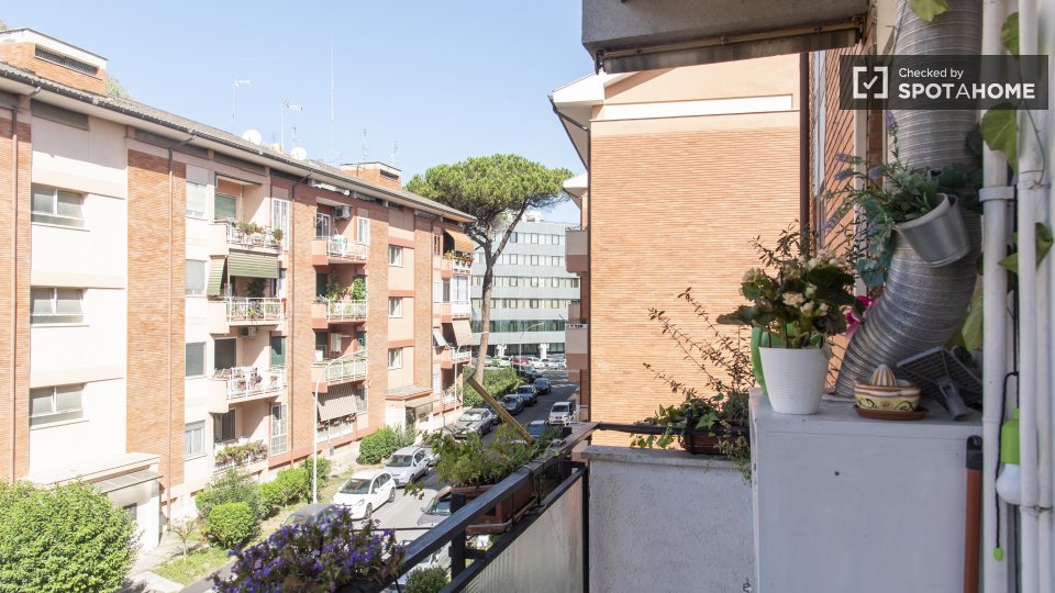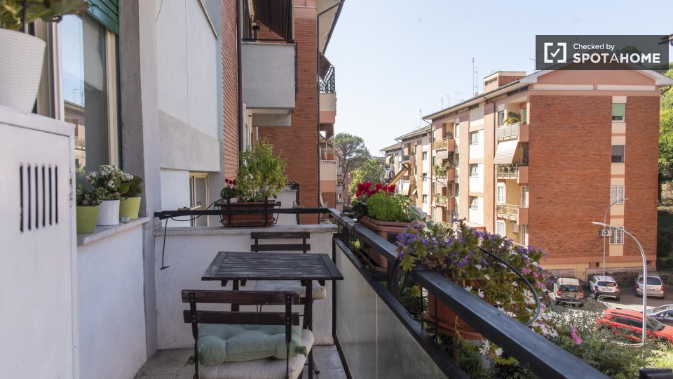 Stanze in affitto in appartamento condiviso a Roma. L'immobile si trova al 4° piano di un palazzo con ascensore. Include terrazza. Importante: - La padrona di casa vive nella proprietà.